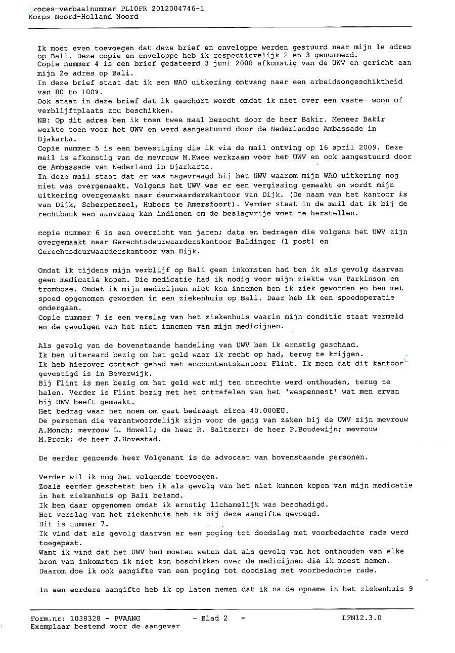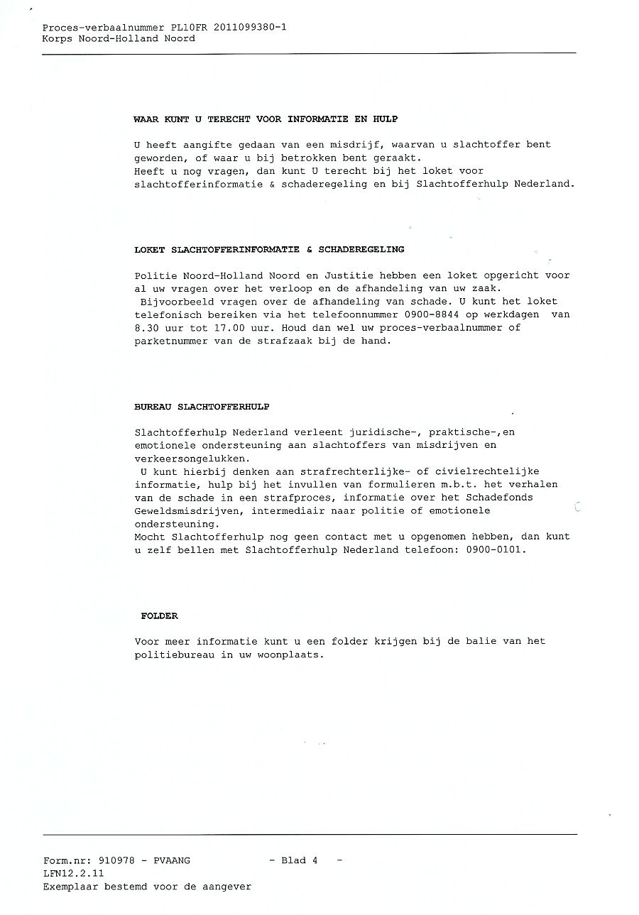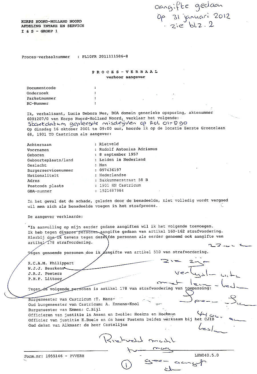Enige tijd geleden heb ik u een aangetekende brief gestuurd m.b.t. de wettelijke verplichting als kennisdrager (met name beëdigde functionarissen), om vanwege art. 160 Sv en 162 Sv van het wetboek van strafvordering aangifte te doen van strafbare feiten, waarvan u als kennisdrager wetenschap hebt. Tot nu toe heb ik van u geen inhoudelijke reactie hierover mogen ontvangen. Zoals ik u heb laten weten hebt u uw kortgedingrechter mr. W.J.J. Beurskens uit de wind proberen te houden door zijn bewust dwalende vonnis inzake de frauduleuze activiteiten van de ronduit criminele advocaten af te dekken. Voor het overige blijven van kracht de al eerder opgestelde processen-verbaal door Buitengewoon Opsporingambtenaar mevr. D. Nes en collega.