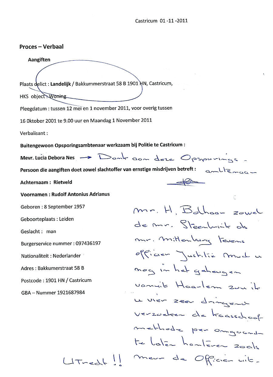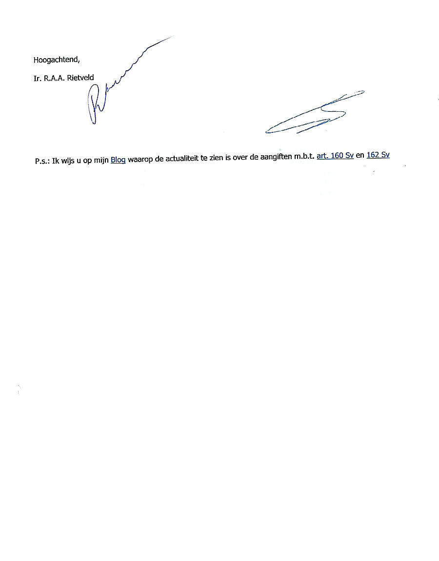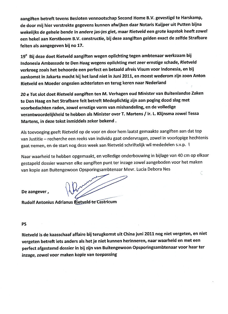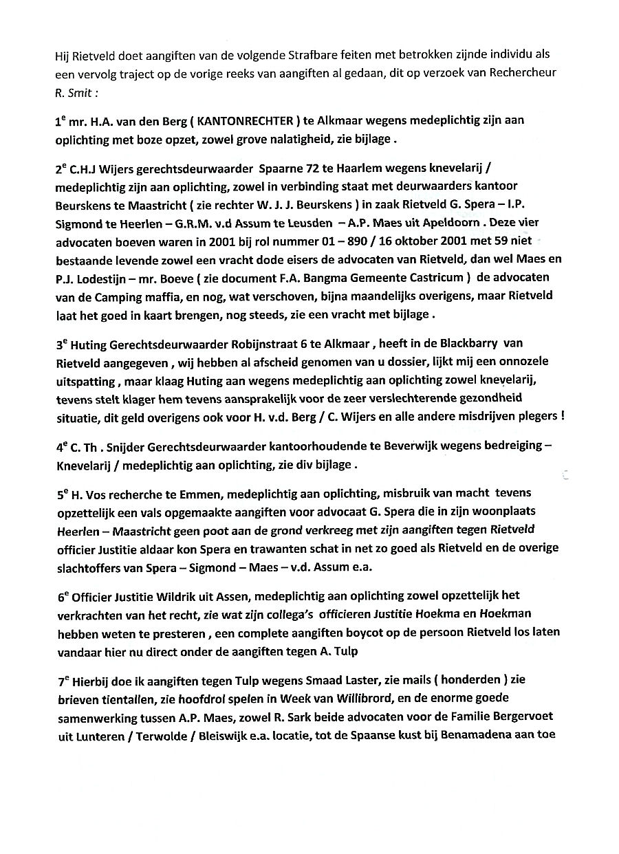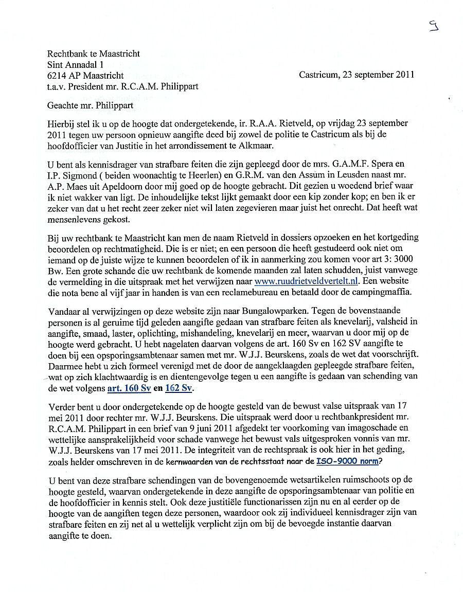 AANTEKENEN President van de rechtbank Maastricht Geachte mr. Beurskens en Philippart Bij deze verwijs ik u naar het concept dat ik ontving van de SDN. Ik zal dat concept samenvoegen met deze aangetekende brief aan u beiden over zaken betreffende mijn correspondentie met o.a. premier Rutte. Ik zend u ook kopieën van de correspondentie van de RVD aan mijzelf, evenals de briefwisseling met de Tweede Kamercommissie voor Veiligheid en Justitie. Alles draait om de flagrante werkwijze die in de rechtszaak van 12 mei 2011 is gebezigd in de zaak versus Rietveld. Ik bemerk dat u de enorme zeepbel die boven deze zaak hangt in uw rechtssysteem, waartoe ook u klaarblijkelijk wilt behoren gezien uw brief aan mij en het oorverdovende zwijgen daarna, niet wilt laten uit elkaar spatten. Maar dat is echt niet meer tegen te houden. Wel bied ik u mr. Philippart en rechter Beurskens nog een tweede maal de mogelijkheid om samen met ondergetekende aangifte te gaan doen. Als kennisdrager van strafbare feiten bent u net als elke andere burger verplicht om daarvan aangifte te doen bij de politie, de hoofdofficier van Justitie en eventueel bij de minister zelf. In deze bent u net als ik een burger met rechten en plichten. U weet beiden dat de zeer bizarre uitspraak op 17 mei 2011 tot doel had om mij onschadelijk te maken en te proberen mij onder een vorm van curatele te laten stellen, wat nooit zal lukken; eerder omgekeerd. Daarna hebt u mr. Philippart getracht mij nog verder te beschadigen met uw bedreigende brief van 9 juni 2011. Daar lig ik overigens echt niet wakker van; en met reden meneer Philippart. De bewijslast waarover ik beschikt van 60 cm dik lag ook voor de ogen van rechter Beurskens, wat zelfs door de politie wordt beschouwd als niet mogelijk qua vonnis, maar dat is onbegrijpelijkerwijs wel zo. Rechter Beurskens zei tegen mij tijdens de zitting: “U bepaald wat u mij wil geven”. Nog voordat ik het bewijsmateriaal heb kunnen aanreiken deed mr. Beurskens een uitspraak in zijn vonnis dat haaks staat op wat te verwachten was, namelijk het afdekken van fraude en valsheid in geschrift, gepleegd door de voornoemde advocaten. Daarnaast blijkt achteraf dat mr Beurskens ook nog belangenverstrengeld is als betrokkene bij een deurwaarderskantoor. Een bijzonder aspect is de valse aangifte bij de politie in Emmen zo’n 400 kilometer naar het noorden. Waarom is dat meneer Philippart? Ik kan ook dat u haarfijn uitleggen. De (integere ) officier Justitie in uw arrondissement kent meneer Spera hoogstwaarschijnlijk net zo goed als ik en dumpte de bagger. Vandaar dat hij bij zijn vriendje A.P. Maes in Emmen (met die 59 niet-bestaande getuigen) op valse grond bij H. Vos van de recherche zorgde dat Spera daar wel een aangifte op rol kreeg; en wel op zaterdag in het gesloten politiebureau te Emmen. Vandaar dat die meneer Vos door de integere voorzitter van de Strafkamer: Mr. W. Foppen van het gerechtshof te Leeuwarden, in nog geen 15 minuten in mootjes gehakt werd; net als het geboefte A.P. Maes die in 2001 de verzinner was van een lijst met 59 niet-bestaande, dan wel een reeks dode eisers. In 2005 zocht Spera opnieuw contact met mij om het hogerberoep van Rietveld tegen Sigmond te mogen doen, dan wel om dat te verzieken. De reden is u duidelijk, omdat Sigmond de fraudeur Spera weer verdedigde op 12 mei 2011. Eerder heeft ook Mr. N.A.M. Schipper, toen als president te Amsterdam, zware averij opgelopen. Ook hij was kennisdrager van strafbare feiten en liet dat gewoon toe. Een ding is nu zeker anders en dat staat hierboven al vermeld. De zaak Rietveld zit in de hoogste regionen van de politiek; want ook de heer Brons, directeur RVD, krijgt deze documentatie van mij. Premier Mark Rutte krijgt de bevestiging zoals hij mij in het verleden heeft laten weten over mijn zaak, dat die naar Stef Blok is doorgestuurd. Eergisteren is nu ook Emile Roemer van de SP door de redactie van de SDN op de hoogte gesteld van kwalijke zaken rond de Rietveld-affaire waarover de parlementaire pers door de RVD opgelegd geen vragen mag stellen aan de minister-president. Ook fractievoorzitter Job Cohen van de PvdA is eind vorig jaar al geattendeerd op schandalige praktijken binnen het rechtsbedrijf. U snapt natuurlijk heel goed dat ik persoonlijk ervoor zorg dat het nu weer bij de premier Rutte en de heer Brons van de RVD terecht gaat komen. En ja, dan hoeft de RVD in ieder geval niet meer het verbod uit te vaardigen aan een erelid van de parlementaire pers om geen vragen over de zaak-Rietveld te stellen. Ik eindig met deze tekst zoals ik hem ook begonnen ben, om u alsnog te verzoeken en wettelijk te eisen dat u samen met ondergetekende aangifte gaat doen tegen de knevelarij en andere onwettige praktijken. Dit wegens het liegen en bedriegen van rechters op rij, met praktijken waar de vastgoedonderwereld nog wat van zou kunnen leren. Al hoewel Spera en Sigmond met zaken als Koch-Amrobank de integere FIOD-ECD ook behoorlijk hebben weten tegen te werken met de stunt in het van der Valkhotel. En ja, Rietveld komt nogal eens bij T. Colijn te Utrecht, voorheen aan de Surinamestraat te Haarlem. Niet heel Nederland is corrupt meneer Philippart. Het vonnis gaat met de bewijslast ter beoordeling over 14 dagen naar de juiste persoon zoals aangegeven. De heer Seuren is ook zwaar slachtoffer van Spera – Kunze. Men houdt mij zoals tientallen anderen zeer goed op de hoogte. En ja, heer Philippart, naar gelang ik verder ga begint de Politie redelijk inzicht te krijgen in wat van hoog tot laag is geprobeerd om het advocatengilde met uw systeem beschermd te houden. Ik verwijs u naar de conceptbrief van de SDN aan u die ik bij deze goedkeur, deze toevoeg en ook op het internet laat plaatsen. Ik zal u de bijlagen van diverse politieke instanties eveneens laten toekomen, inclusief het dwangbevel van de rechtbank te Maastricht met zeer groot stempel niet sturen. Met welke reden heeft Rietveld hem dan toch verkregen? Krijgt Nederland eindelijk een advocatuur waar mr.