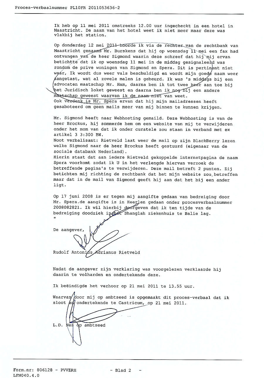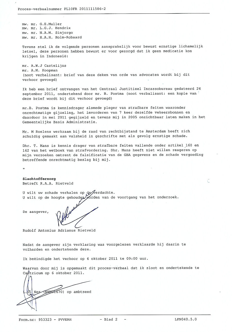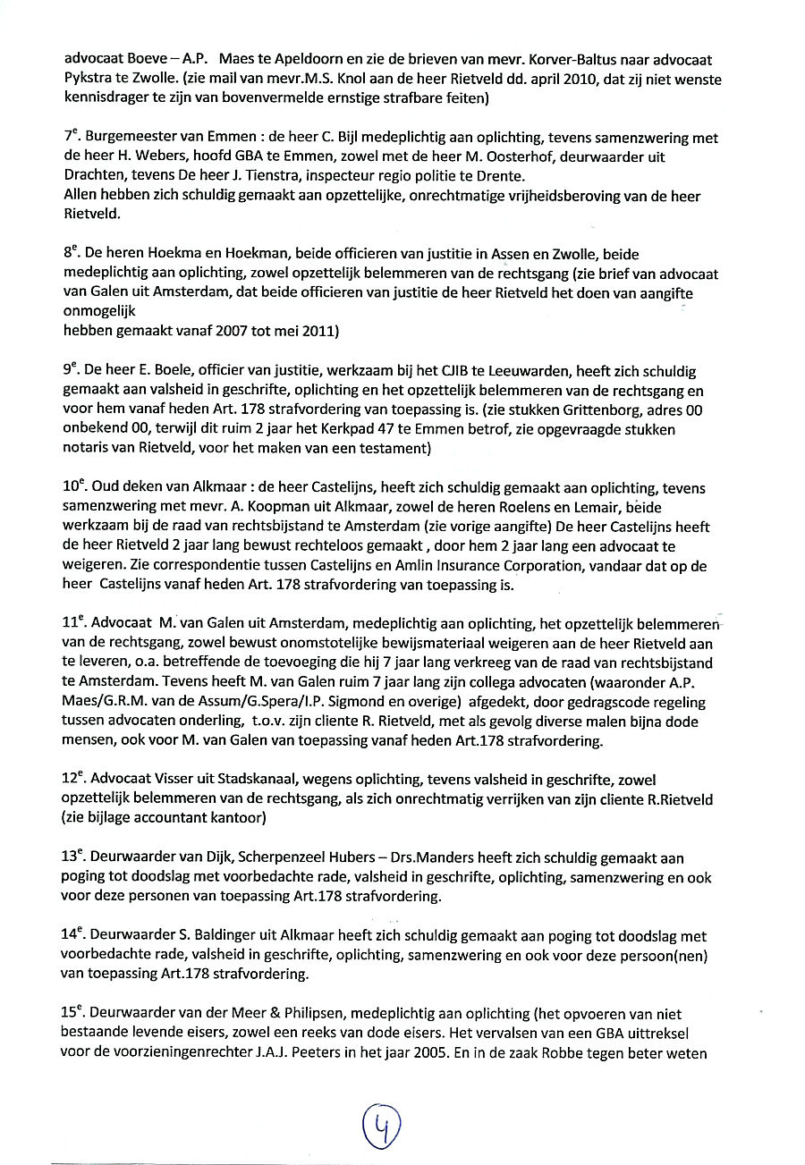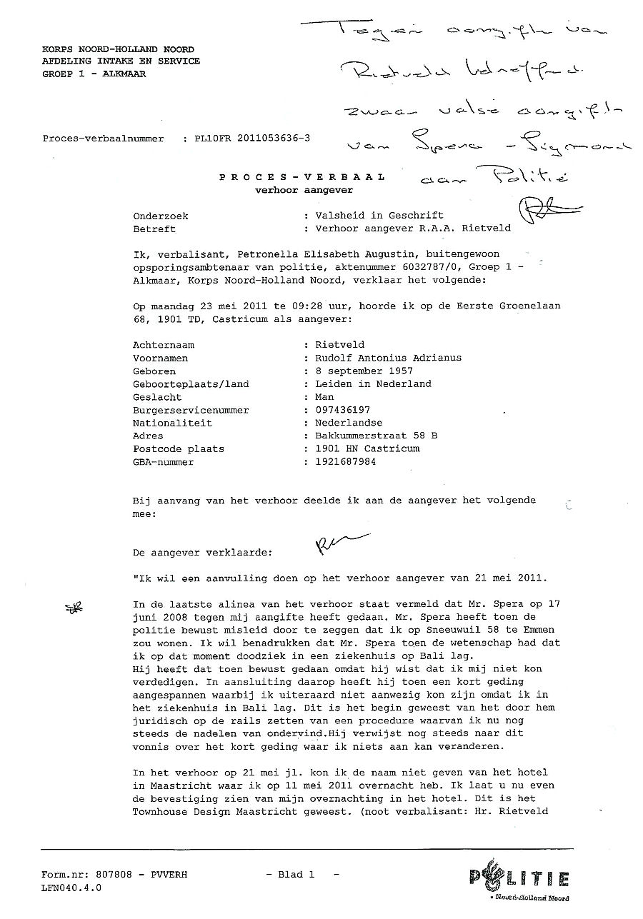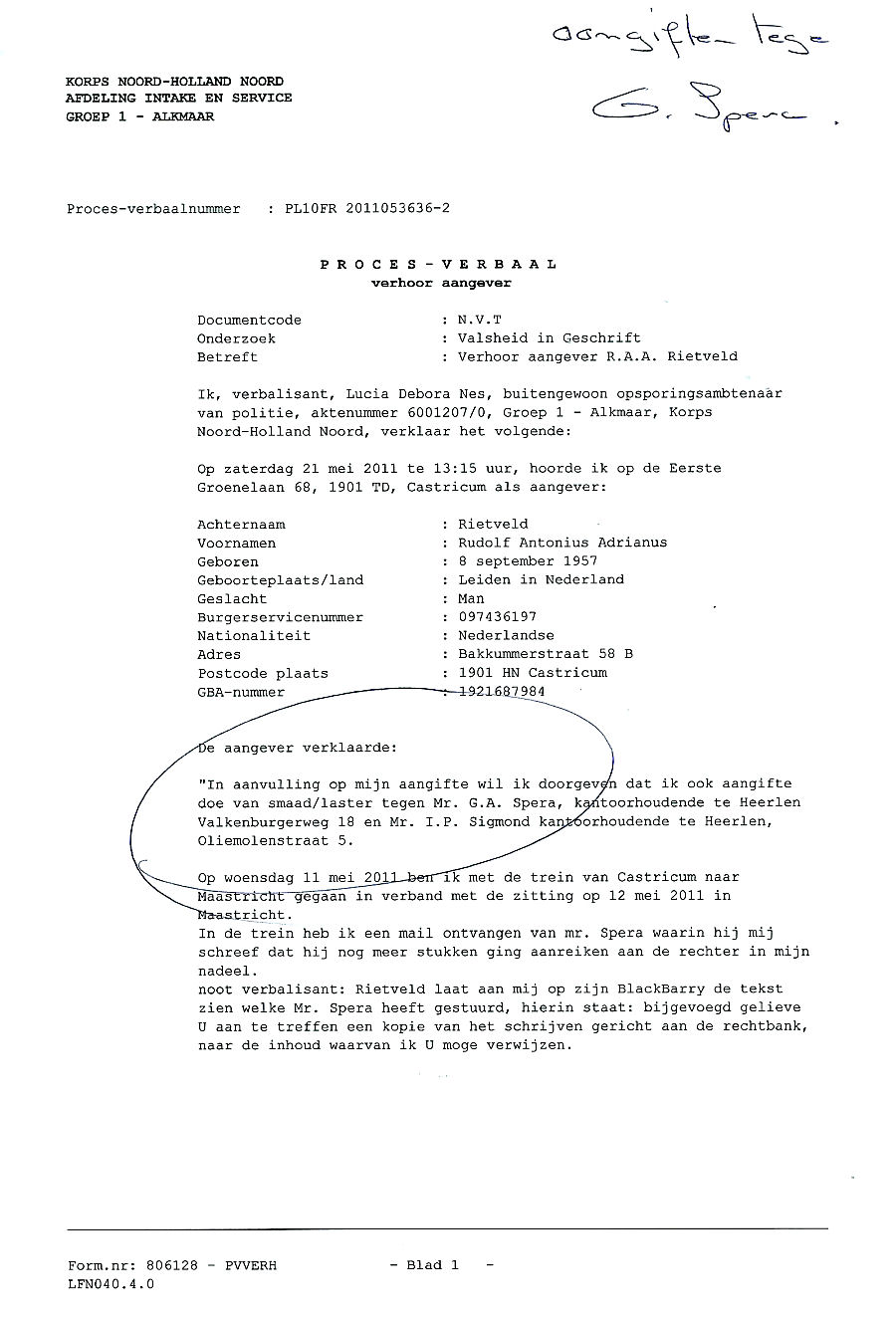 AANTEKENEN President van de rechtbank Maastricht Geachte mr. Beurskens en Philippart Bij deze verwijs ik u naar het concept dat ik ontving van de SDN. Ik zal dat concept samenvoegen met deze aangetekende brief aan u beiden over zaken betreffende mijn correspondentie met o.a. premier Rutte. Ik zend u ook kopieën van de correspondentie van de RVD aan mijzelf, evenals de briefwisseling met de Tweede Kamercommissie voor Veiligheid en Justitie. Alles draait om de flagrante werkwijze die in de rechtszaak van 12 mei 2011 is gebezigd in de zaak versus Rietveld. Ik bemerk dat u de enorme zeepbel die boven deze zaak hangt in uw rechtssysteem, waartoe ook u klaarblijkelijk wilt behoren gezien uw brief aan mij en het oorverdovende zwijgen daarna, niet wilt laten uit elkaar spatten. Maar dat is echt niet meer tegen te houden. Wel bied ik u mr. Philippart en rechter Beurskens nog een tweede maal de mogelijkheid om samen met ondergetekende aangifte te gaan doen. Als kennisdrager van strafbare feiten bent u net als elke andere burger verplicht om daarvan aangifte te doen bij de politie, de hoofdofficier van Justitie en eventueel bij de minister zelf. In deze bent u net als ik een burger met rechten en plichten. U weet beiden dat de zeer bizarre uitspraak op 17 mei 2011 tot doel had om mij onschadelijk te maken en te proberen mij onder een vorm van curatele te laten stellen, wat nooit zal lukken; eerder omgekeerd. Daarna hebt u mr. Philippart getracht mij nog verder te beschadigen met uw bedreigende brief van 9 juni 2011. Daar lig ik overigens echt niet wakker van; en met reden meneer Philippart. De bewijslast waarover ik beschikt van 60 cm dik lag ook voor de ogen van rechter Beurskens, wat zelfs door de politie wordt beschouwd als niet mogelijk qua vonnis, maar dat is onbegrijpelijkerwijs wel zo. Rechter Beurskens zei tegen mij tijdens de zitting: “U bepaald wat u mij wil geven”. Nog voordat ik het bewijsmateriaal heb kunnen aanreiken deed mr. Beurskens een uitspraak in zijn vonnis dat haaks staat op wat te verwachten was, namelijk het afdekken van fraude en valsheid in geschrift, gepleegd door de voornoemde advocaten. Daarnaast blijkt achteraf dat mr Beurskens ook nog belangenverstrengeld is als betrokkene bij een deurwaarderskantoor. Een bijzonder aspect is de valse aangifte bij de politie in Emmen zo’n 400 kilometer naar het noorden. Waarom is dat meneer Philippart? Ik kan ook dat u haarfijn uitleggen. De (integere ) officier Justitie in uw arrondissement kent meneer Spera hoogstwaarschijnlijk net zo goed als ik en dumpte de bagger. Vandaar dat hij bij zijn vriendje A.P. Maes in Emmen (met die 59 niet-bestaande getuigen) op valse grond bij H. Vos van de recherche zorgde dat Spera daar wel een aangifte op rol kreeg; en wel op zaterdag in het gesloten politiebureau te Emmen. Vandaar dat die meneer Vos door de integere voorzitter van de Strafkamer: Mr. W. Foppen van het gerechtshof te Leeuwarden, in nog geen 15 minuten in mootjes gehakt werd; net als het geboefte A.P. Maes die in 2001 de verzinner was van een lijst met 59 niet-bestaande, dan wel een reeks dode eisers. In 2005 zocht Spera opnieuw contact met mij om het hogerberoep van Rietveld tegen Sigmond te mogen doen, dan wel om dat te verzieken. De reden is u duidelijk, omdat Sigmond de fraudeur Spera weer verdedigde op 12 mei 2011. Eerder heeft ook Mr. N.A.M. Schipper, toen als president te Amsterdam, zware averij opgelopen. Ook hij was kennisdrager van strafbare feiten en liet dat gewoon toe. Een ding is nu zeker anders en dat staat hierboven al vermeld. De zaak Rietveld zit in de hoogste regionen van de politiek; want ook de heer Brons, directeur RVD, krijgt deze documentatie van mij. Premier Mark Rutte krijgt de bevestiging zoals hij mij in het verleden heeft laten weten over mijn zaak, dat die naar Stef Blok is doorgestuurd. Eergisteren is nu ook Emile Roemer van de SP door de redactie van de SDN op de hoogte gesteld van kwalijke zaken rond de Rietveld-affaire waarover de parlementaire pers door de RVD opgelegd geen vragen mag stellen aan de minister-president. Ook fractievoorzitter Job Cohen van de PvdA is eind vorig jaar al geattendeerd op schandalige praktijken binnen het rechtsbedrijf. U snapt natuurlijk heel goed dat ik persoonlijk ervoor zorg dat het nu weer bij de premier Rutte en de heer Brons van de RVD terecht gaat komen. En ja, dan hoeft de RVD in ieder geval niet meer het verbod uit te vaardigen aan een erelid van de parlementaire pers om geen vragen over de zaak-Rietveld te stellen. Ik eindig met deze tekst zoals ik hem ook begonnen ben, om u alsnog te verzoeken en wettelijk te eisen dat u samen met ondergetekende aangifte gaat doen tegen de knevelarij en andere onwettige praktijken. Dit wegens het liegen en bedriegen van rechters op rij, met praktijken waar de vastgoedonderwereld nog wat van zou kunnen leren. Al hoewel Spera en Sigmond met zaken als Koch-Amrobank de integere FIOD-ECD ook behoorlijk hebben weten tegen te werken met de stunt in het van der Valkhotel. En ja, Rietveld komt nogal eens bij T. Colijn te Utrecht, voorheen aan de Surinamestraat te Haarlem. Niet heel Nederland is corrupt meneer Philippart. Het vonnis gaat met de bewijslast ter beoordeling over 14 dagen naar de juiste persoon zoals aangegeven. De heer Seuren is ook zwaar slachtoffer van Spera – Kunze. Men houdt mij zoals tientallen anderen zeer goed op de hoogte. En ja, heer Philippart, naar gelang ik verder ga begint de Politie redelijk inzicht te krijgen in wat van hoog tot laag is geprobeerd om het advocatengilde met uw systeem beschermd te houden. Ik verwijs u naar de conceptbrief van de SDN aan u die ik bij deze goedkeur, deze toevoeg en ook op het internet laat plaatsen. Ik zal u de bijlagen van diverse politieke instanties eveneens laten toekomen, inclusief het dwangbevel van de rechtbank te Maastricht met zeer groot stempel niet sturen. Met welke reden heeft Rietveld hem dan toch verkregen? Krijgt Nederland eindelijk een advocatuur waar mr.