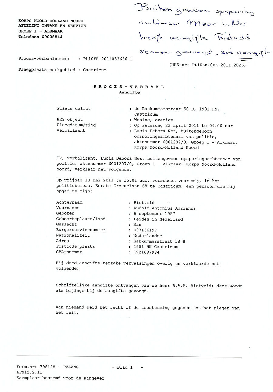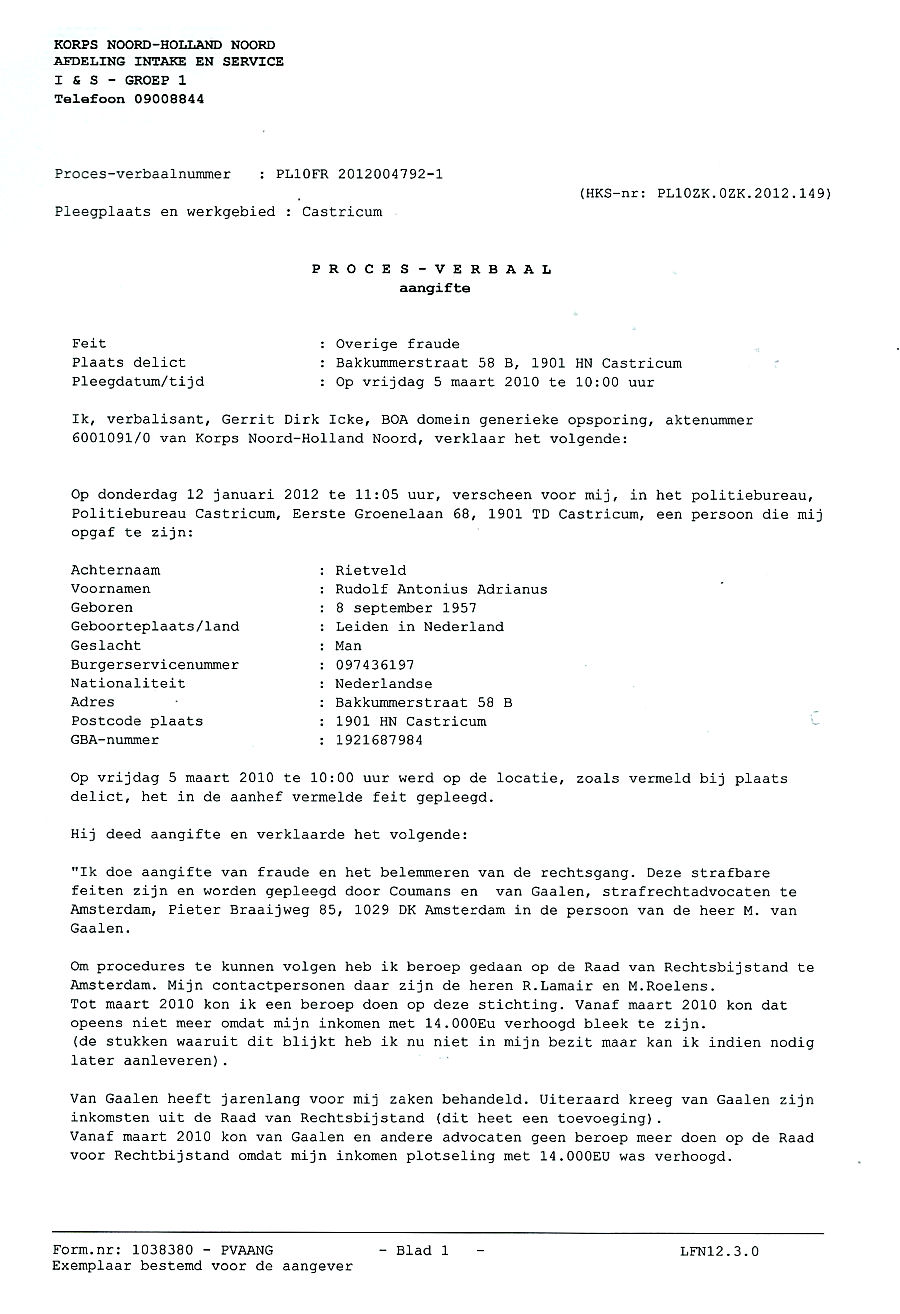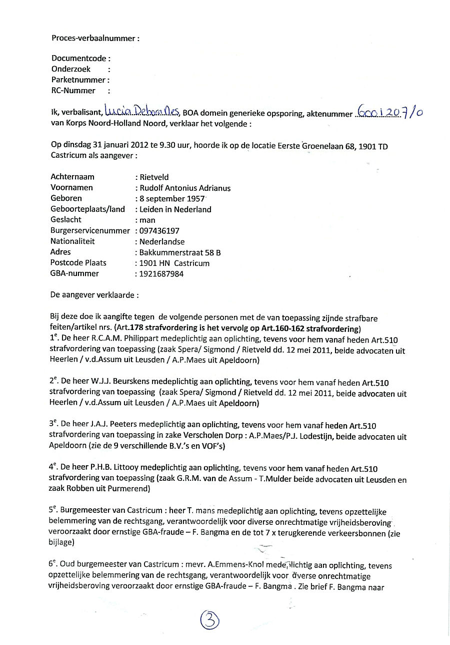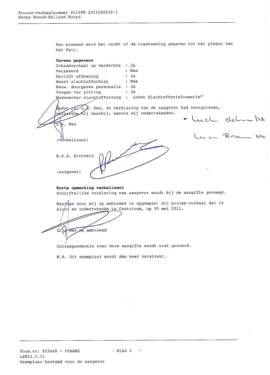 AANTEKENEN President van de rechtbank Maastricht Geachte mr. Beurskens en Philippart Bij deze verwijs ik u naar het concept dat ik ontving van de SDN. Ik zal dat concept samenvoegen met deze aangetekende brief aan u beiden over zaken betreffende mijn correspondentie met o.a. premier Rutte. Ik zend u ook kopieën van de correspondentie van de RVD aan mijzelf, evenals de briefwisseling met de Tweede Kamercommissie voor Veiligheid en Justitie. Alles draait om de flagrante werkwijze die in de rechtszaak van 12 mei 2011 is gebezigd in de zaak versus Rietveld. Ik bemerk dat u de enorme zeepbel die boven deze zaak hangt in uw rechtssysteem, waartoe ook u klaarblijkelijk wilt behoren gezien uw brief aan mij en het oorverdovende zwijgen daarna, niet wilt laten uit elkaar spatten. Maar dat is echt niet meer tegen te houden. Wel bied ik u mr. Philippart en rechter Beurskens nog een tweede maal de mogelijkheid om samen met ondergetekende aangifte te gaan doen. Als kennisdrager van strafbare feiten bent u net als elke andere burger verplicht om daarvan aangifte te doen bij de politie, de hoofdofficier van Justitie en eventueel bij de minister zelf. In deze bent u net als ik een burger met rechten en plichten. U weet beiden dat de zeer bizarre uitspraak op 17 mei 2011 tot doel had om mij onschadelijk te maken en te proberen mij onder een vorm van curatele te laten stellen, wat nooit zal lukken; eerder omgekeerd. Daarna hebt u mr. Philippart getracht mij nog verder te beschadigen met uw bedreigende brief van 9 juni 2011. Daar lig ik overigens echt niet wakker van; en met reden meneer Philippart. De bewijslast waarover ik beschikt van 60 cm dik lag ook voor de ogen van rechter Beurskens, wat zelfs door de politie wordt beschouwd als niet mogelijk qua vonnis, maar dat is onbegrijpelijkerwijs wel zo. Rechter Beurskens zei tegen mij tijdens de zitting: “U bepaald wat u mij wil geven”. Nog voordat ik het bewijsmateriaal heb kunnen aanreiken deed mr. Beurskens een uitspraak in zijn vonnis dat haaks staat op wat te verwachten was, namelijk het afdekken van fraude en valsheid in geschrift, gepleegd door de voornoemde advocaten. Daarnaast blijkt achteraf dat mr Beurskens ook nog belangenverstrengeld is als betrokkene bij een deurwaarderskantoor. Een bijzonder aspect is de valse aangifte bij de politie in Emmen zo’n 400 kilometer naar het noorden. Waarom is dat meneer Philippart? Ik kan ook dat u haarfijn uitleggen. De (integere ) officier Justitie in uw arrondissement kent meneer Spera hoogstwaarschijnlijk net zo goed als ik en dumpte de bagger. Vandaar dat hij bij zijn vriendje A.P. Maes in Emmen (met die 59 niet-bestaande getuigen) op valse grond bij H. Vos van de recherche zorgde dat Spera daar wel een aangifte op rol kreeg; en wel op zaterdag in het gesloten politiebureau te Emmen. Vandaar dat die meneer Vos door de integere voorzitter van de Strafkamer: Mr. W. Foppen van het gerechtshof te Leeuwarden, in nog geen 15 minuten in mootjes gehakt werd; net als het geboefte A.P. Maes die in 2001 de verzinner was van een lijst met 59 niet-bestaande, dan wel een reeks dode eisers. In 2005 zocht Spera opnieuw contact met mij om het hogerberoep van Rietveld tegen Sigmond te mogen doen, dan wel om dat te verzieken. De reden is u duidelijk, omdat Sigmond de fraudeur Spera weer verdedigde op 12 mei 2011. Eerder heeft ook Mr. N.A.M. Schipper, toen als president te Amsterdam, zware averij opgelopen. Ook hij was kennisdrager van strafbare feiten en liet dat gewoon toe. Een ding is nu zeker anders en dat staat hierboven al vermeld. De zaak Rietveld zit in de hoogste regionen van de politiek; want ook de heer Brons, directeur RVD, krijgt deze documentatie van mij. Premier Mark Rutte krijgt de bevestiging zoals hij mij in het verleden heeft laten weten over mijn zaak, dat die naar Stef Blok is doorgestuurd. Eergisteren is nu ook Emile Roemer van de SP door de redactie van de SDN op de hoogte gesteld van kwalijke zaken rond de Rietveld-affaire waarover de parlementaire pers door de RVD opgelegd geen vragen mag stellen aan de minister-president. Ook fractievoorzitter Job Cohen van de PvdA is eind vorig jaar al geattendeerd op schandalige praktijken binnen het rechtsbedrijf. U snapt natuurlijk heel goed dat ik persoonlijk ervoor zorg dat het nu weer bij de premier Rutte en de heer Brons van de RVD terecht gaat komen. En ja, dan hoeft de RVD in ieder geval niet meer het verbod uit te vaardigen aan een erelid van de parlementaire pers om geen vragen over de zaak-Rietveld te stellen. Ik eindig met deze tekst zoals ik hem ook begonnen ben, om u alsnog te verzoeken en wettelijk te eisen dat u samen met ondergetekende aangifte gaat doen tegen de knevelarij en andere onwettige praktijken. Dit wegens het liegen en bedriegen van rechters op rij, met praktijken waar de vastgoedonderwereld nog wat van zou kunnen leren. Al hoewel Spera en Sigmond met zaken als Koch-Amrobank de integere FIOD-ECD ook behoorlijk hebben weten tegen te werken met de stunt in het van der Valkhotel. En ja, Rietveld komt nogal eens bij T. Colijn te Utrecht, voorheen aan de Surinamestraat te Haarlem. Niet heel Nederland is corrupt meneer Philippart. Het vonnis gaat met de bewijslast ter beoordeling over 14 dagen naar de juiste persoon zoals aangegeven. De heer Seuren is ook zwaar slachtoffer van Spera – Kunze. Men houdt mij zoals tientallen anderen zeer goed op de hoogte. En ja, heer Philippart, naar gelang ik verder ga begint de Politie redelijk inzicht te krijgen in wat van hoog tot laag is geprobeerd om het advocatengilde met uw systeem beschermd te houden. Ik verwijs u naar de conceptbrief van de SDN aan u die ik bij deze goedkeur, deze toevoeg en ook op het internet laat plaatsen. Ik zal u de bijlagen van diverse politieke instanties eveneens laten toekomen, inclusief het dwangbevel van de rechtbank te Maastricht met zeer groot stempel niet sturen. Met welke reden heeft Rietveld hem dan toch verkregen? Krijgt Nederland eindelijk een advocatuur waar mr.