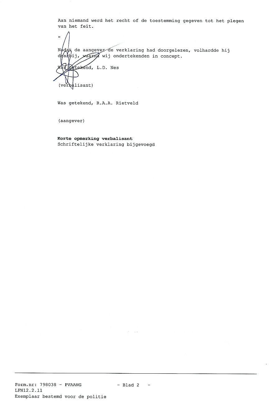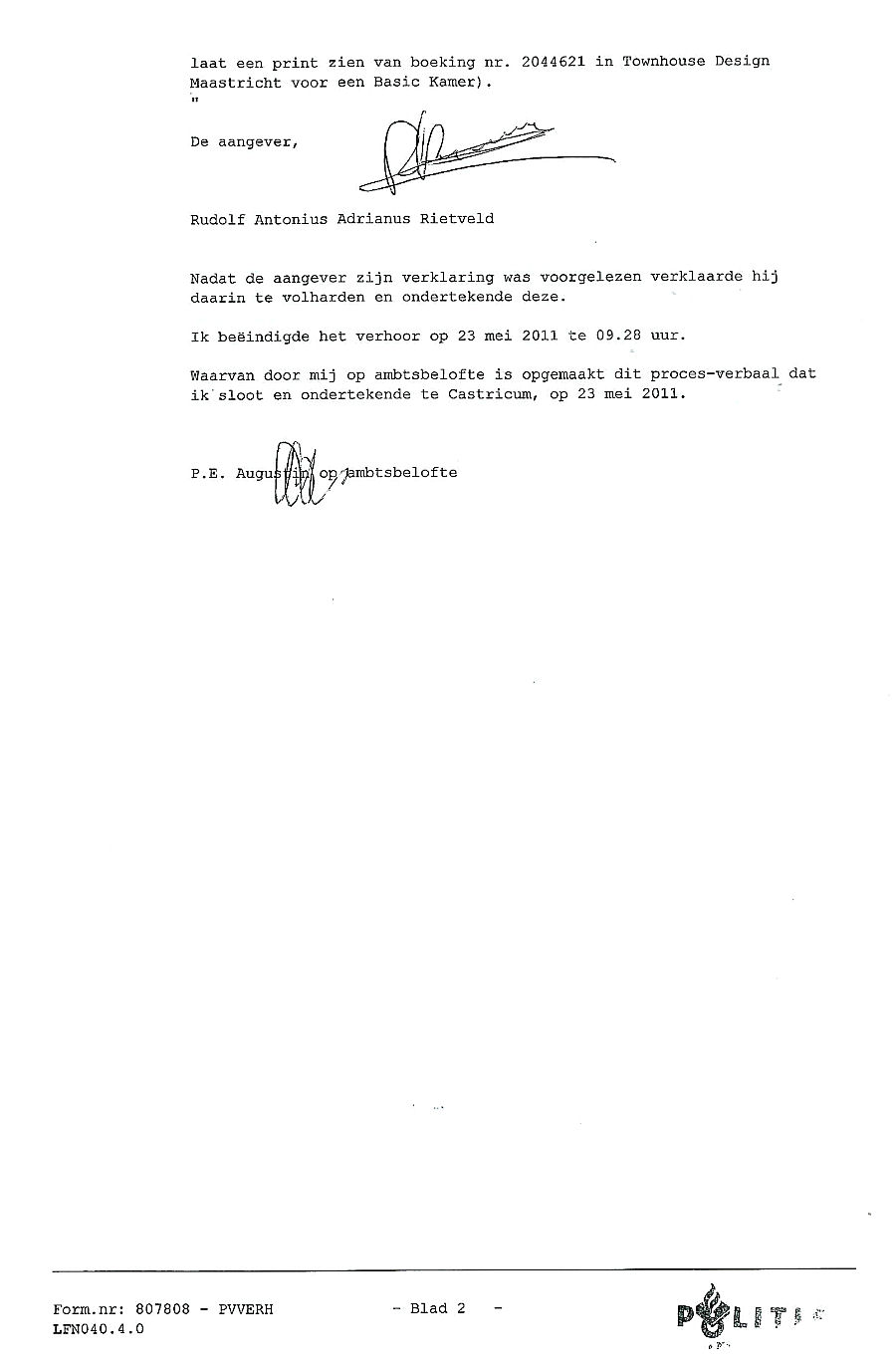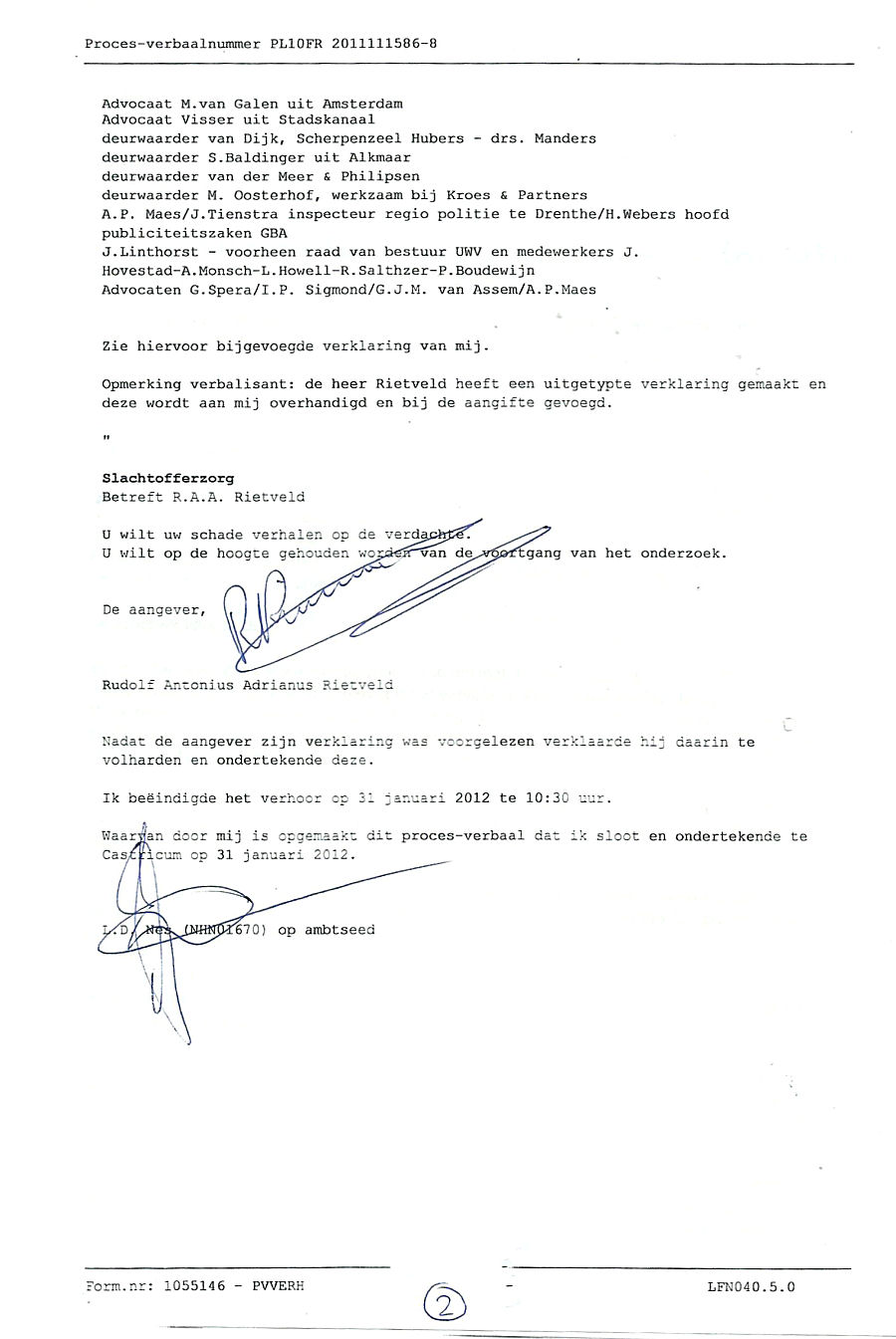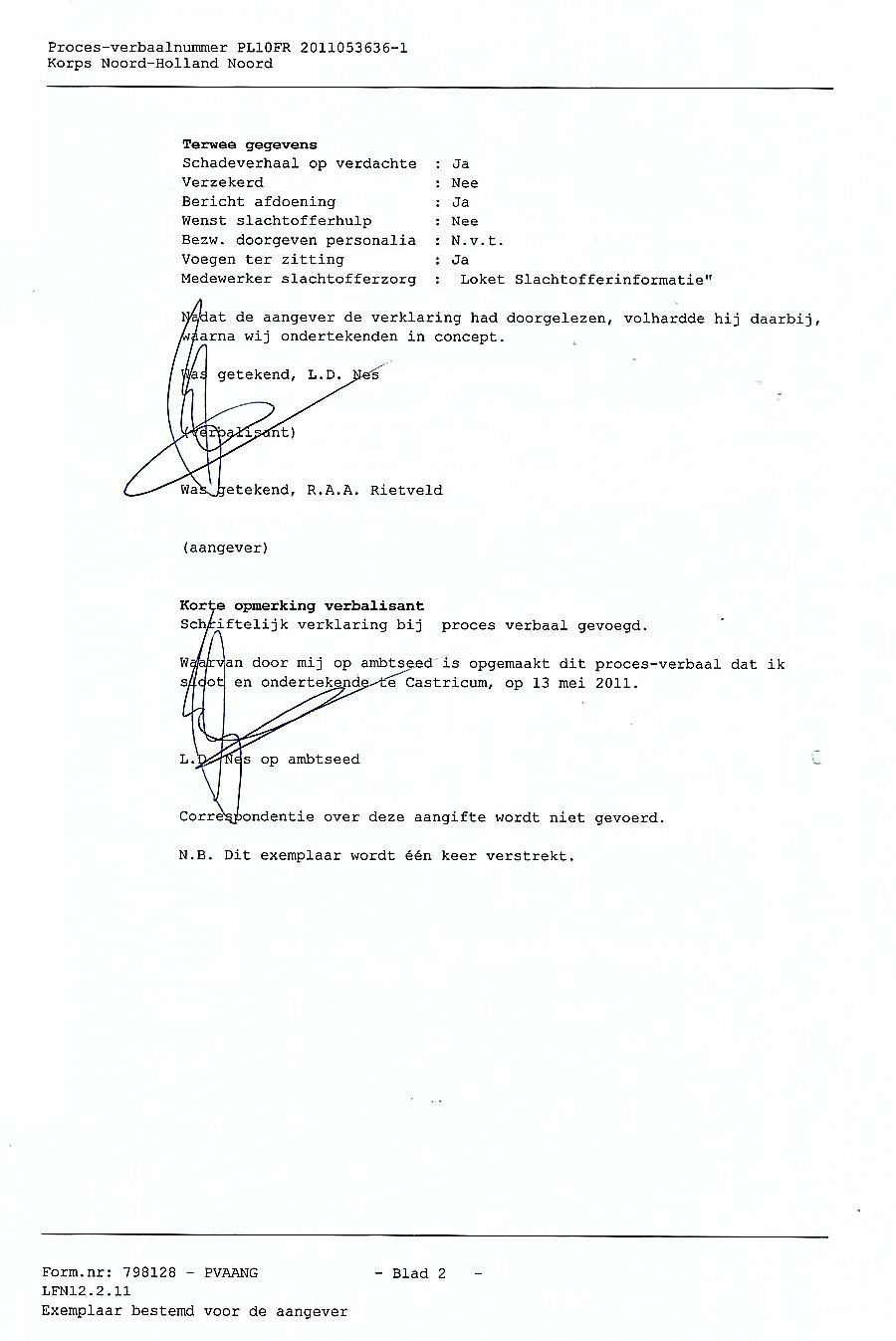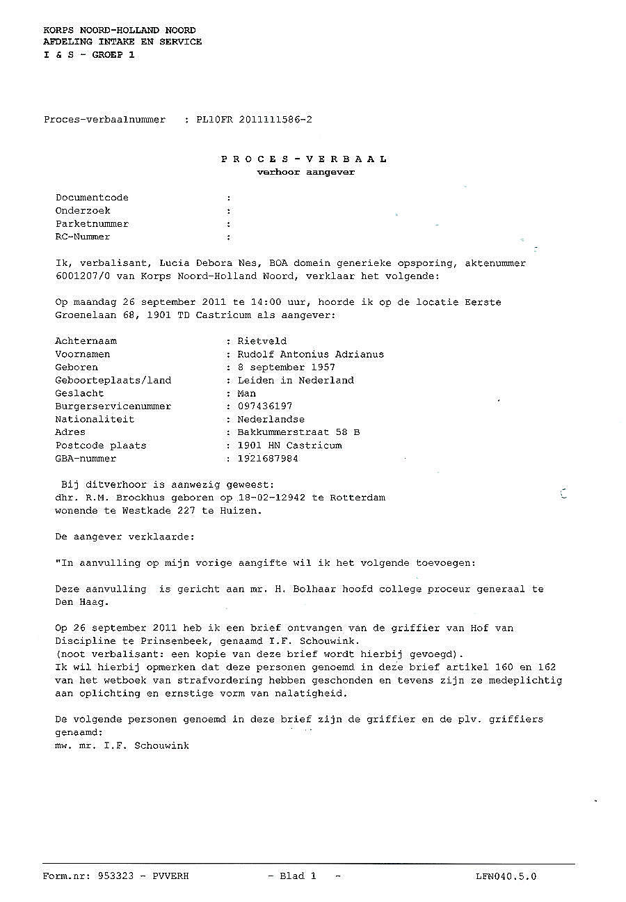 AANTEKENEN President van de rechtbank Maastricht Geachte mr. Beurskens en Philippart Bij deze verwijs ik u naar het concept dat ik ontving van de SDN. Ik zal dat concept samenvoegen met deze aangetekende brief aan u beiden over zaken betreffende mijn correspondentie met o.a. premier Rutte. Ik zend u ook kopieën van de correspondentie van de RVD aan mijzelf, evenals de briefwisseling met de Tweede Kamercommissie voor Veiligheid en Justitie. Alles draait om de flagrante werkwijze die in de rechtszaak van 12 mei 2011 is gebezigd in de zaak versus Rietveld. Ik bemerk dat u de enorme zeepbel die boven deze zaak hangt in uw rechtssysteem, waartoe ook u klaarblijkelijk wilt behoren gezien uw brief aan mij en het oorverdovende zwijgen daarna, niet wilt laten uit elkaar spatten. Maar dat is echt niet meer tegen te houden. Wel bied ik u mr. Philippart en rechter Beurskens nog een tweede maal de mogelijkheid om samen met ondergetekende aangifte te gaan doen. Als kennisdrager van strafbare feiten bent u net als elke andere burger verplicht om daarvan aangifte te doen bij de politie, de hoofdofficier van Justitie en eventueel bij de minister zelf. In deze bent u net als ik een burger met rechten en plichten. U weet beiden dat de zeer bizarre uitspraak op 17 mei 2011 tot doel had om mij onschadelijk te maken en te proberen mij onder een vorm van curatele te laten stellen, wat nooit zal lukken; eerder omgekeerd. Daarna hebt u mr. Philippart getracht mij nog verder te beschadigen met uw bedreigende brief van 9 juni 2011. Daar lig ik overigens echt niet wakker van; en met reden meneer Philippart. De bewijslast waarover ik beschikt van 60 cm dik lag ook voor de ogen van rechter Beurskens, wat zelfs door de politie wordt beschouwd als niet mogelijk qua vonnis, maar dat is onbegrijpelijkerwijs wel zo. Rechter Beurskens zei tegen mij tijdens de zitting: “U bepaald wat u mij wil geven”. Nog voordat ik het bewijsmateriaal heb kunnen aanreiken deed mr. Beurskens een uitspraak in zijn vonnis dat haaks staat op wat te verwachten was, namelijk het afdekken van fraude en valsheid in geschrift, gepleegd door de voornoemde advocaten. Daarnaast blijkt achteraf dat mr Beurskens ook nog belangenverstrengeld is als betrokkene bij een deurwaarderskantoor. Een bijzonder aspect is de valse aangifte bij de politie in Emmen zo’n 400 kilometer naar het noorden. Waarom is dat meneer Philippart? Ik kan ook dat u haarfijn uitleggen. De (integere ) officier Justitie in uw arrondissement kent meneer Spera hoogstwaarschijnlijk net zo goed als ik en dumpte de bagger. Vandaar dat hij bij zijn vriendje A.P. Maes in Emmen (met die 59 niet-bestaande getuigen) op valse grond bij H. Vos van de recherche zorgde dat Spera daar wel een aangifte op rol kreeg; en wel op zaterdag in het gesloten politiebureau te Emmen. Vandaar dat die meneer Vos door de integere voorzitter van de Strafkamer: Mr. W. Foppen van het gerechtshof te Leeuwarden, in nog geen 15 minuten in mootjes gehakt werd; net als het geboefte A.P. Maes die in 2001 de verzinner was van een lijst met 59 niet-bestaande, dan wel een reeks dode eisers. In 2005 zocht Spera opnieuw contact met mij om het hogerberoep van Rietveld tegen Sigmond te mogen doen, dan wel om dat te verzieken. De reden is u duidelijk, omdat Sigmond de fraudeur Spera weer verdedigde op 12 mei 2011. Eerder heeft ook Mr. N.A.M. Schipper, toen als president te Amsterdam, zware averij opgelopen. Ook hij was kennisdrager van strafbare feiten en liet dat gewoon toe. Een ding is nu zeker anders en dat staat hierboven al vermeld. De zaak Rietveld zit in de hoogste regionen van de politiek; want ook de heer Brons, directeur RVD, krijgt deze documentatie van mij. Premier Mark Rutte krijgt de bevestiging zoals hij mij in het verleden heeft laten weten over mijn zaak, dat die naar Stef Blok is doorgestuurd. Eergisteren is nu ook Emile Roemer van de SP door de redactie van de SDN op de hoogte gesteld van kwalijke zaken rond de Rietveld-affaire waarover de parlementaire pers door de RVD opgelegd geen vragen mag stellen aan de minister-president. Ook fractievoorzitter Job Cohen van de PvdA is eind vorig jaar al geattendeerd op schandalige praktijken binnen het rechtsbedrijf. U snapt natuurlijk heel goed dat ik persoonlijk ervoor zorg dat het nu weer bij de premier Rutte en de heer Brons van de RVD terecht gaat komen. En ja, dan hoeft de RVD in ieder geval niet meer het verbod uit te vaardigen aan een erelid van de parlementaire pers om geen vragen over de zaak-Rietveld te stellen. Ik eindig met deze tekst zoals ik hem ook begonnen ben, om u alsnog te verzoeken en wettelijk te eisen dat u samen met ondergetekende aangifte gaat doen tegen de knevelarij en andere onwettige praktijken. Dit wegens het liegen en bedriegen van rechters op rij, met praktijken waar de vastgoedonderwereld nog wat van zou kunnen leren. Al hoewel Spera en Sigmond met zaken als Koch-Amrobank de integere FIOD-ECD ook behoorlijk hebben weten tegen te werken met de stunt in het van der Valkhotel. En ja, Rietveld komt nogal eens bij T. Colijn te Utrecht, voorheen aan de Surinamestraat te Haarlem. Niet heel Nederland is corrupt meneer Philippart. Het vonnis gaat met de bewijslast ter beoordeling over 14 dagen naar de juiste persoon zoals aangegeven. De heer Seuren is ook zwaar slachtoffer van Spera – Kunze. Men houdt mij zoals tientallen anderen zeer goed op de hoogte. En ja, heer Philippart, naar gelang ik verder ga begint de Politie redelijk inzicht te krijgen in wat van hoog tot laag is geprobeerd om het advocatengilde met uw systeem beschermd te houden. Ik verwijs u naar de conceptbrief van de SDN aan u die ik bij deze goedkeur, deze toevoeg en ook op het internet laat plaatsen. Ik zal u de bijlagen van diverse politieke instanties eveneens laten toekomen, inclusief het dwangbevel van de rechtbank te Maastricht met zeer groot stempel niet sturen. Met welke reden heeft Rietveld hem dan toch verkregen? Krijgt Nederland eindelijk een advocatuur waar mr.