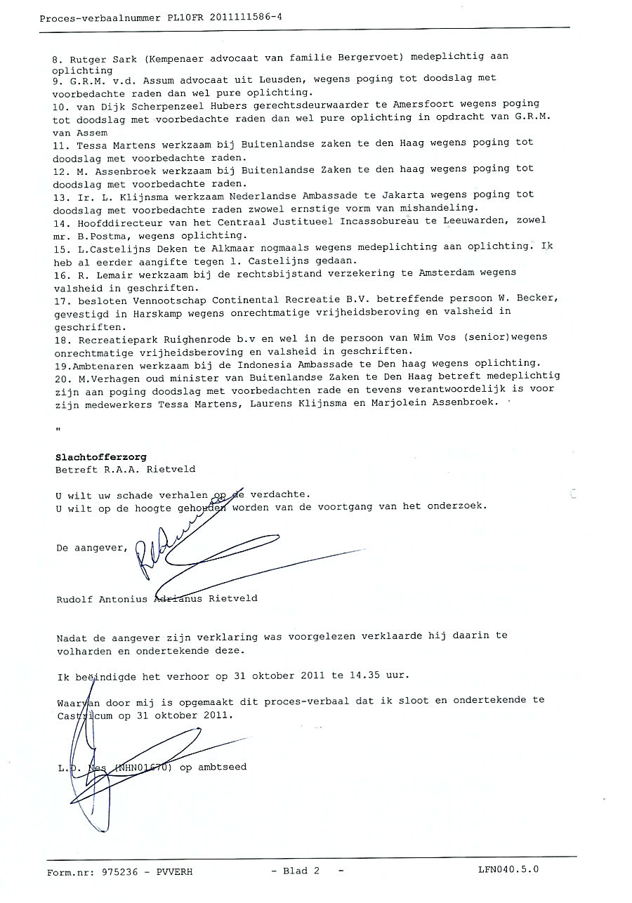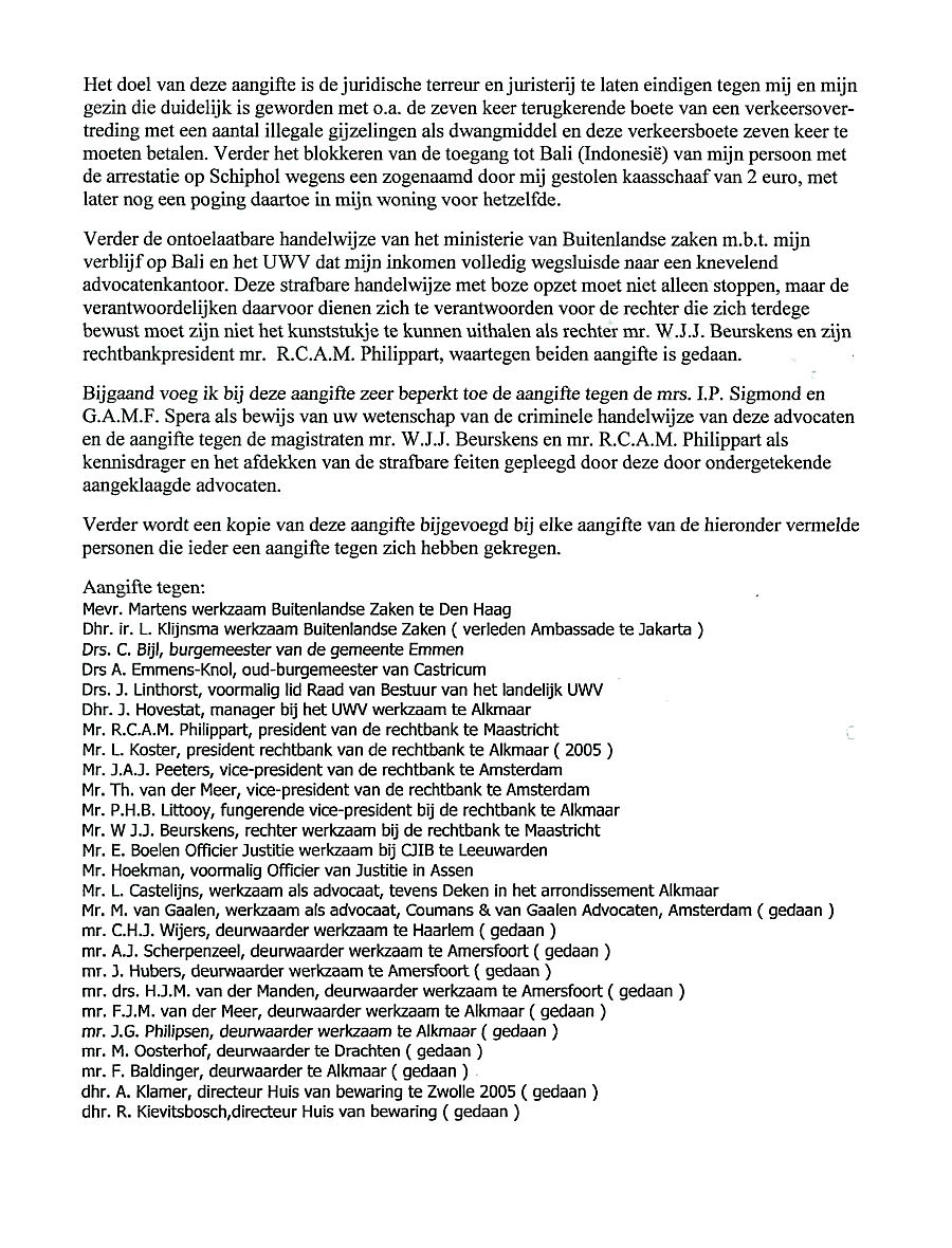 Het wel verantwoordelijk, maar niet aansprakelijk zijn, gaat in deze affaire zeker niet op (J.P. Balkenende). Tot nu toe durft niemand vragen stellen. Ook de media niet! Vooral nu de RVD het stellen van vragen verbiedt. De aangifte bij de politie m.b.t. strafbare feiten waarvan bewijzen zijn bijgevoegd aan de aangifte met een lijst van personen die aangesproken kunnen worden op hun verantwoordelijkheid om zelf aangifte te doen van strafbare feiten waarvan zij kennis dragen. Dit op de verplichting daarvan vanwege art. 162 Sv van het wetboek van strafvordering. Daarnaast is ook art. 136 Sr. van toepassing. Zie de aangifte tegen rechters en advocaten. Zolang politici en de pers blijven zwijgen, zullen per jaar ca. 400 mensen zelfmoord plegen.