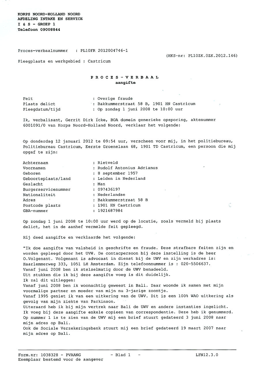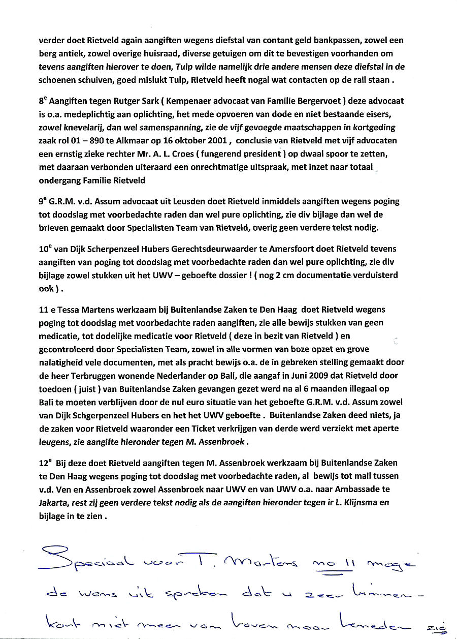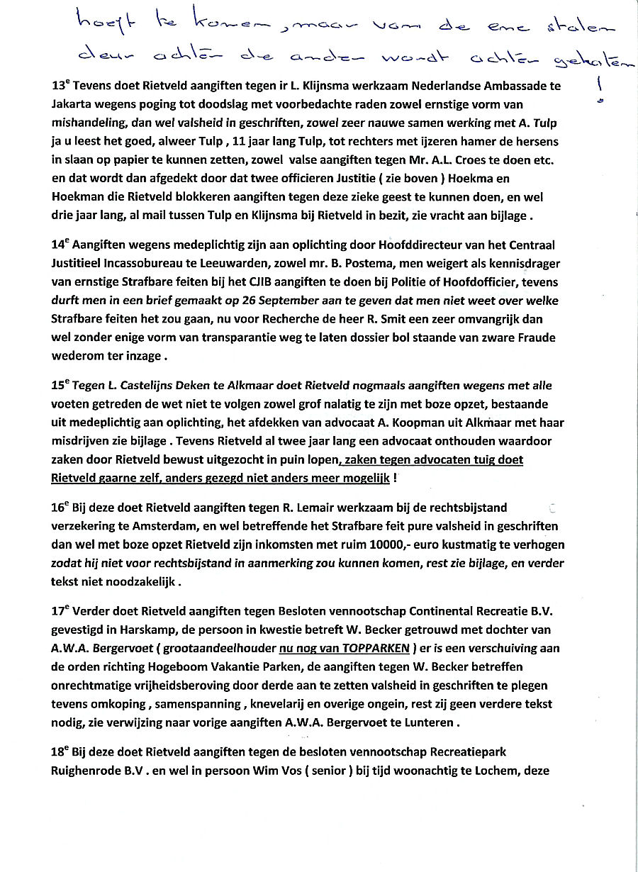 Vernietigende brief met alle misdrijven om ondergetekende onzichtbaar te maken. Men heeft bij het CJIB een parkeerbon zeven maal terug laten komen om die zeven keer te laten betalen en mij weer gijzelen voor een bon - die werd betaald door ondergetekende in 2005. De laatste reeks bonnen werden betaald door ing. John Sanders uit Rolde bij het ophalen van Rietveld na tweede onrechtmatige gijzeling in 2008 in de Penitentiaire Inrichting te Zwolle. Ook heer R. Brockhus was getuige dat ing. Sanders deze voor Rietveld betaalde alvorens hij de PI uit mocht. Exact de zelfde misdrijven als bij de Grittenborg met volstrekt onrechtmatige gijzeling. Zie ook de documenten die gingen naar het Gerechtshof. Deze berg bagger moesten officier justitie drs. Mr. R. Mud en dhr. Kloosterman met het bewust vernachelen daarvan (niet de klacht 12 Sv procedure) onder tafel zien te houden en nog veel meer ! Zie het verbijsterende document van S. Blog, werkzaam bij het Gerechtshof. Daarna kwam een zware excuusbrief uit hetzelfde Gerechtshof. Zo bouw ik voor Gerechtshof een vernietigend dossier in elkaar. Eenzelfde ordner als over Mud en Kloosterman inclusief de poging tot doodslag op Rietveld met voorbedachten rade. Tevens het wegstelen van mijn Jeep Cherokee en een reeks andere zware misdrijven die men bij de advocaat generaal moest trachten weg te houden. Zie misdadige beschuldiging met 59 niet bestaande en zelfs overleden getuigen. Zie ook de fraude met vervalste GBA stukken. Zie de zware misdaad door Rietveld 9 maanden bewust in de cel van de hel op te laten sluiten op Bali, zonder enige vorm van medicatie voor Parkinson en trombose. Waardoor nu ernstig hart-long Letsel is ontstaan door 15 maanden zonder geld te zitten, met weer een misdaad. Dan een dwalende uitspraak van rechter P. H. B. Littooy te Alkmaar. Zie zijn tweede dwalende uitspraak in de zaak Robben en de vernietigende brief die rietveld van Robben in zijn bezit heeft. Zie de valse uitspraak van rechter J. A. J. Peeters tegen Rietveld die niet ingeschreven zou zijn bij het GBA en geëmigreerd zou zijn vervolgens de vervalste GBA-stukken; al weer door deurwaarderskantoor Philipsen v.d. Meer uit Alkmaar, en tevens beslag te laten leggen door 59 niet-bestaande en overleden eisers . Dan het corruptie GBA van Castricum. Alweer moeten rechter Schippers en hoofdofficier van Justitie B. W. Streefland, zowel als burgemeester T. Mans en officier van justitie R. Mud, zowel als dhr. Kloosterman het minimaal strafbare feit opzettelijk de rechtsgang belemmeren; en zouden dat moeten worden aangerekend. Daarna de bizarre uitspraak van bij het circus van rechter W.J.J. Beurskens met zijn solo-act te Maastricht in 2011, door een volstrekt vals vonnis uit te spreken, met het bevel dat Rietveld de website www.ruudrietveldvertelt.nl moest verwijderen met het misdadig dwangmiddel van Art 3; 300 BW. Terwijl die website al 6 jaar van een reclamebureau in bezit was Daarna komen de gecorrumpeerde rechters Vroom en H. A. Schotman met hetzelfde artikel om de bewijzen van gepleegde misdrijven betreffende de UWV-boeven van Internet af te laten slopen. En advocaten boef O. Volgenant werkzaam voor het UWV, durfde te schrijven in zijn productie, dat Rietveld zelf die 27 aangiften had geknipt en geplakt. Zie de foto. Omdat Schippers wederom aangiften van Rietveld blokkeerde tegen de advocaten om die op te laten nemen, konden deze beide criminele advocaten beslag bij Rietveld leggen voor ruim 40.000 euro. Rechter Schippers, dat krijg jij tevens op je bord ! Rietveld. P.s. Een kleine opsomming voor het Gerechtshof om het vernachelde ( niet klacht procedure 12 SV ) helder te maken. Foto's van de zware vorm van mishandeling niet te vergeten. Misdrijven tussen F. A. Bangma van het GBA in de gemeente Castricum en de advocaten A. P. Maes en Boeve die tevens zijn afgedekt door officier van Justitie Mud, Kloosterman en Schippers. Rietveld verzocht het Gerechtshof om officier Mud, Kloosterman, rechter Schippers, Brouwer en opsporingsambtenaren Nes en Augustin tijdens het strafrechtelijk onderzoek met onmiddellijke ingang te schorsen. Maar ook de verantwoordelijke Korpsbeheerder burgemeester T. Mans. Dezen hebben tevens hun ambtseed geschonden, door te weigeren Art 162 Strafvordering als kennisdrager toe te respecteren. Hierdoor zijn aangiften van ernstig strafbare feiten bewust niet uitgevoerd. Etc. Etc. Zoals volstrekt vals opgemaakte politieaangiften bij de politie in Emmen. Nota bene is hij kantoorhoudende te Heerlen. De integere officier van Justitie aldaar flikkerde de berg leugens in de prullenbak. Advocaat A.P. Maes maakte op zaterdag bij een gesloten politiebureau bij zijn vriend H. Vos een afspraak en maakte twee volstrekt vals opgemaakte politieaangiften. Door onnozel te zijn gaven zij zelf aan hoe zij deze weg bewandeld hebben in hun eigen aangiften. Wederom weigert mr. Schippers van Rietveld aangiften hiervan op te nemen. En wederom trachten officieren Mud en Kloosterman dit voor Gerechtshof te verbergen, en nogmaals de klacht 12 Sv bewust te vernachelen. Dit is nu tevens goed mislukt. |