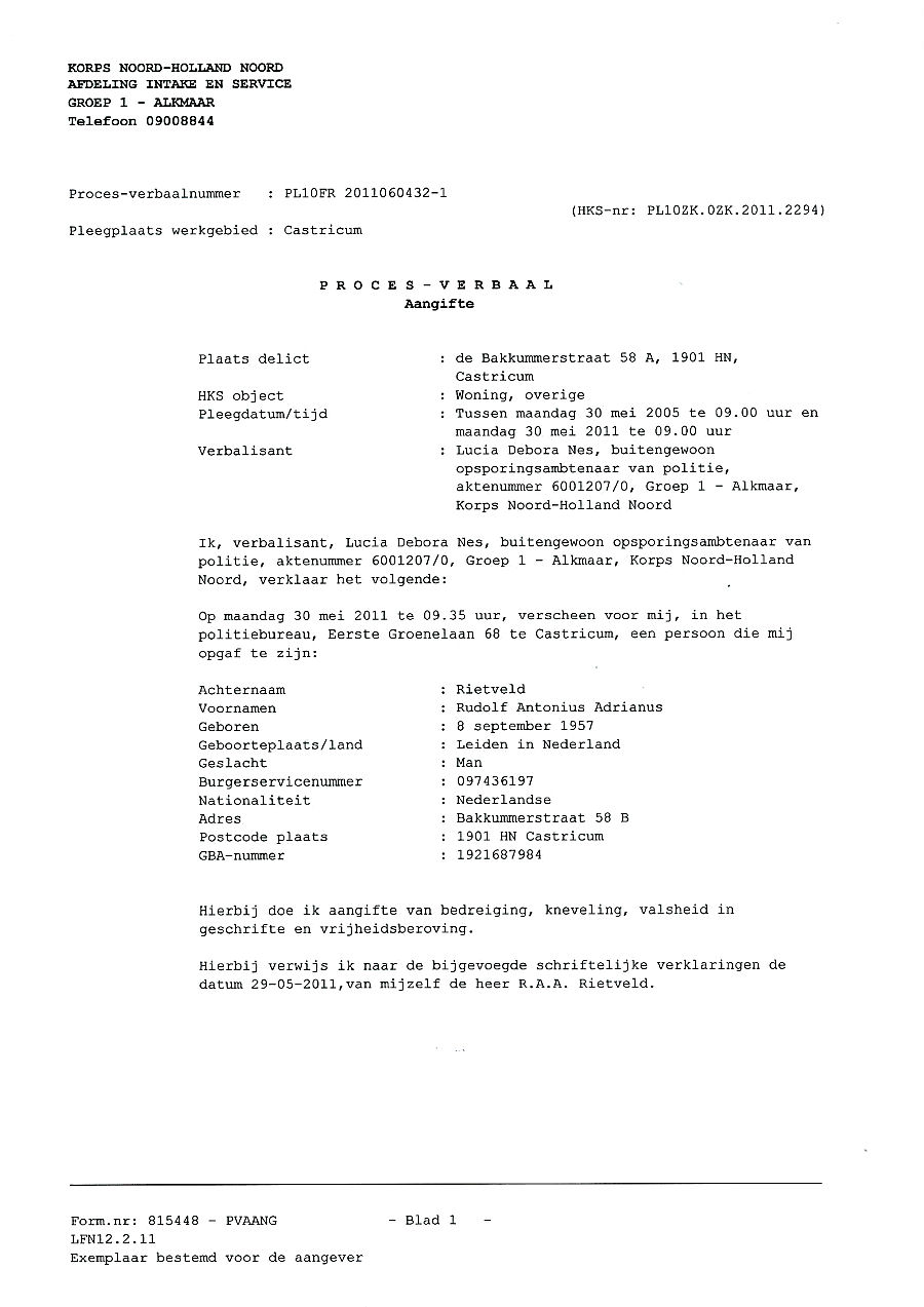 Achternaam : Rietveld Voornamen : Rudolf Antonius Adrianus Geboren : 8 September 1957 Geboorteplaats : Leiden Geslacht : getergerde man Burgerservicenummer : 097436197 Nationaliteit : Nederlander Adres : Bakkummerstraat 58 B Postcode plaats : Castricum GBA - Nummer : 1921687984