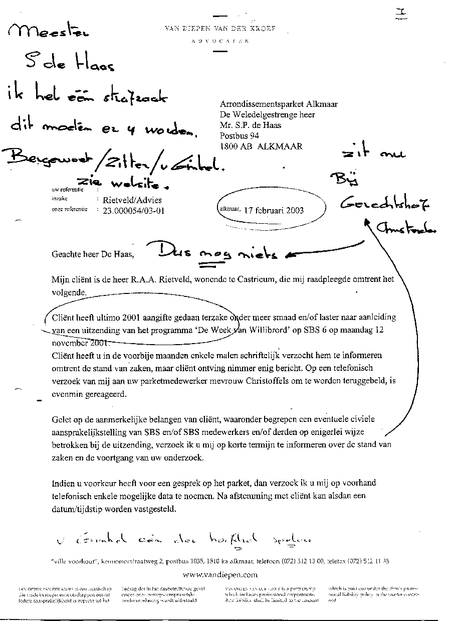 Brief aan SDN met de sommatie om de website van Rietveld te verwijderen