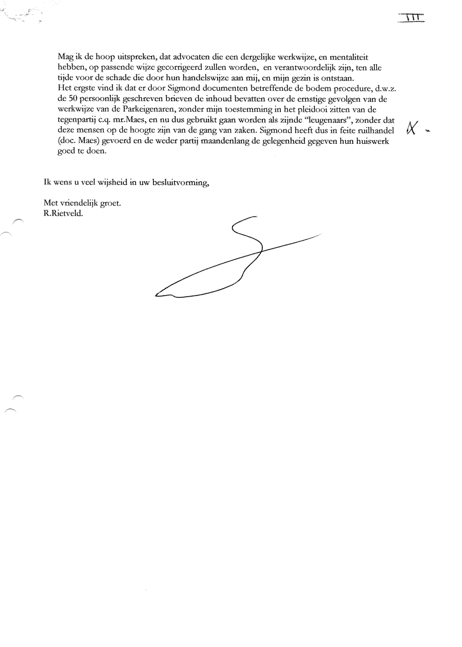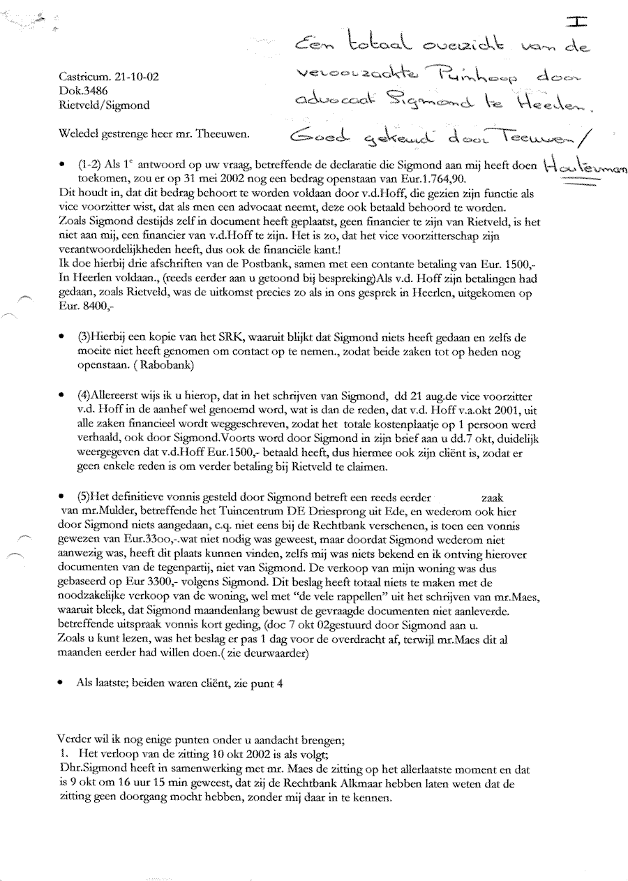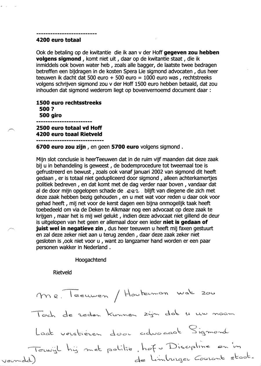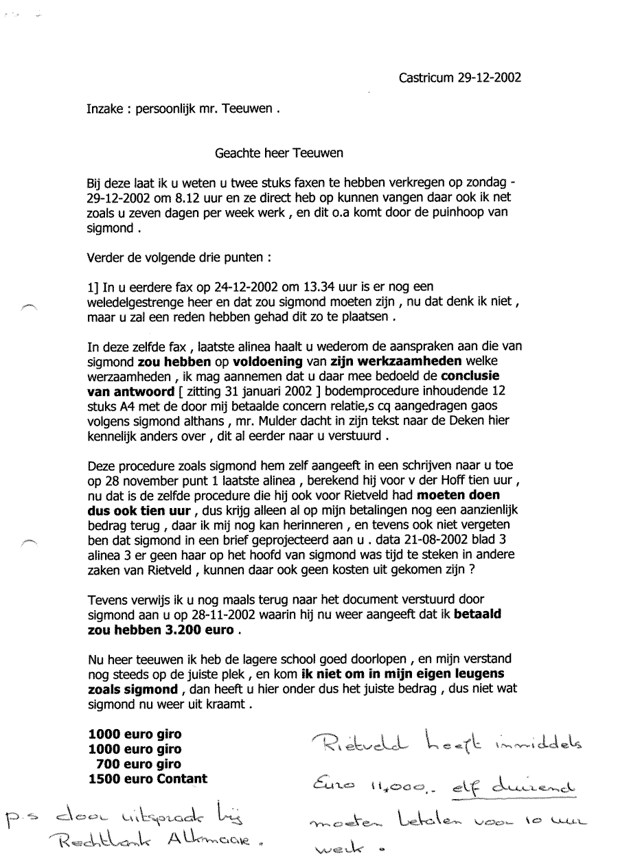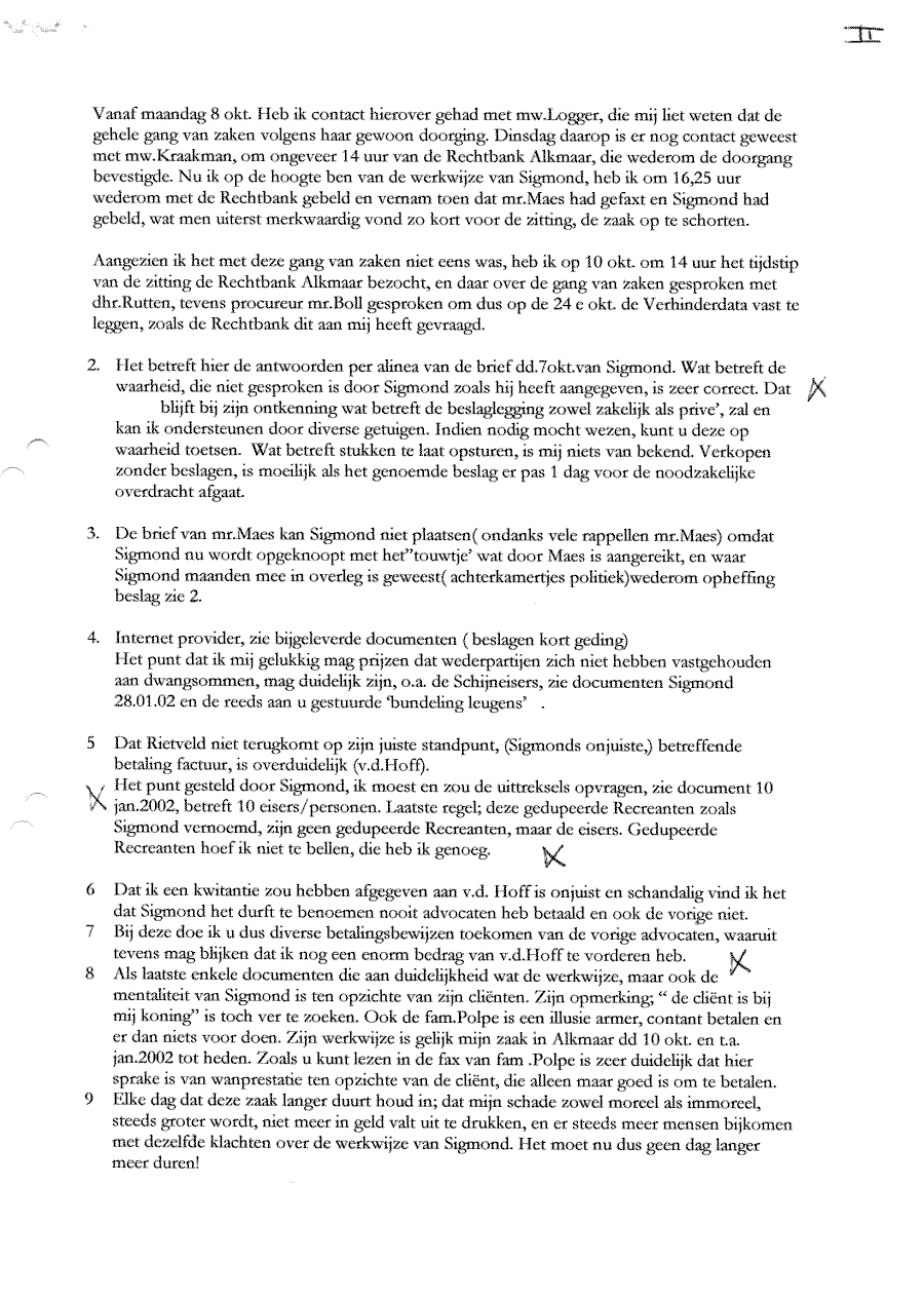 Verwijt aan mr. Sigmond over z'n inactiviteit. Wel betalen, maar niet kunnen halen!