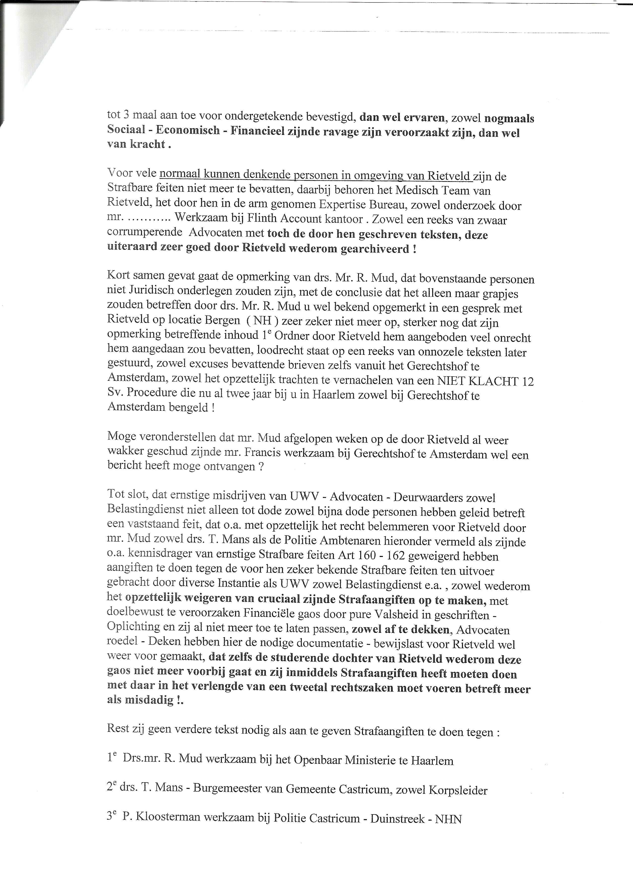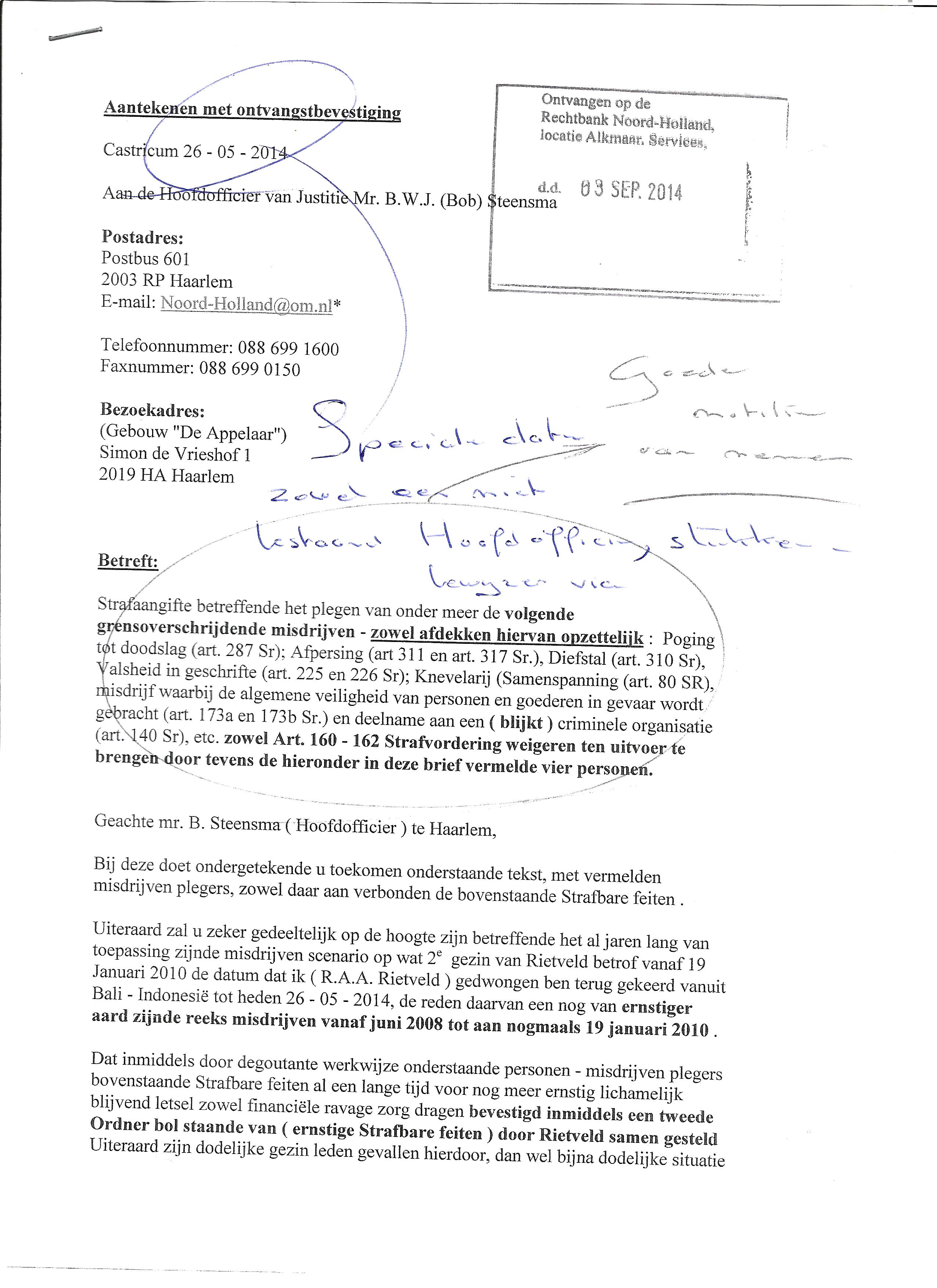 Van: sdn@planet.nl Verzonden: maandag 14 november 2016 20:53 Aan: 'Rietveld Stoel' Onderwerp: RE: Waarom zijn jullie zo bang om bewijzen van crimineel gedrag van beëdigde overheidsfunctionarissen niet aan de schandpaal te hangen? Gewoon zelf corrigeren. Van: Rietveld Stoel [mailto:ruudrietveldvertelt@hotmail.com] Verzonden: maandag 14 november 2016 20:11 Aan: sdn@planet.nl Onderwerp: Re: Waarom zijn jullie zo bang om bewijzen van crimineel gedrag van beëdigde overheidsfunctionarissen niet aan de schandpaal te hangen? R. Mud van Openbaar Ministerie in verleden Alkmaar, vanaf 2012 Noord-Holland - Haarlem. Niet in Maastricht. De andere lul betreft B. Steensma, Hoofdofficier van Justitie. Deze heeft in een document afgedekt: R. Mud / J. Mans / P. Kloosterman / J.W. Schippers en P. van Linden. Zie mijn verzoek in je SMS-berichten. Ruud |