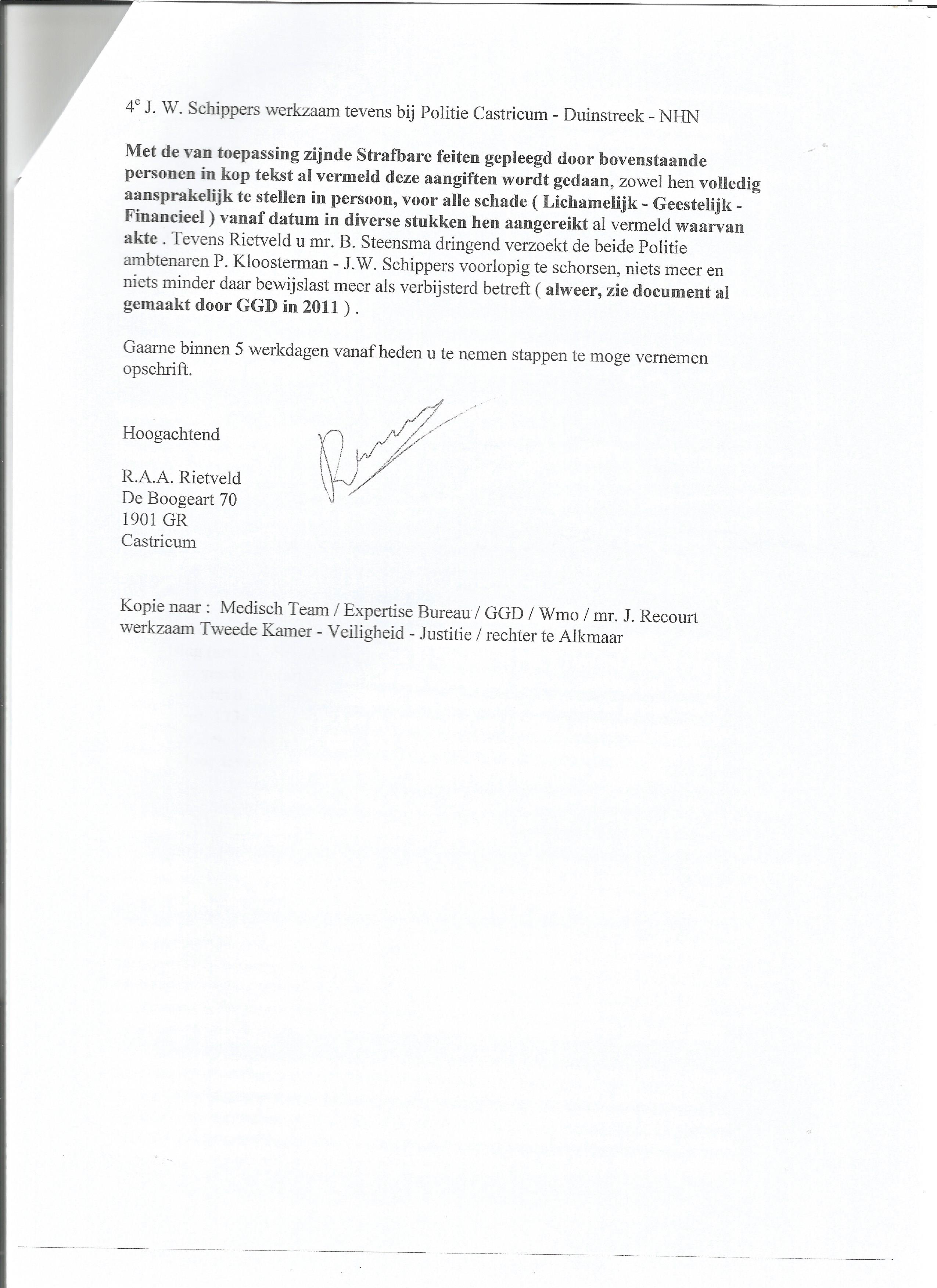 Het wel verantwoordelijk, maar niet aansprakelijk zijn, gaat in deze affaire zeker niet op (J.P. Balkenende). Tot nu toe durft niemand vragen stellen. Ook de media niet! Vooral nu de RVD het stellen van vragen verbiedt. De aangifte bij de politie m.b.t. strafbare feiten waarvan bewijzen zijn bijgevoegd aan de aangifte met een lijst van personen die aangesproken kunnen worden op hun verantwoordelijkheid om zelf aangifte te doen van strafbare feiten waarvan zij kennis dragen. Dit op de verplichting daarvan vanwege 162 Sv (Wetboek van Strafvordering). Daarnaast is ook art. 136 Sr. van toepassing. Zie de aangifte tegen rechters en advocaten. Zolang politici en pers blijven zwijgen, zullen per jaar ca. 485 mensen zelfmoord plegen, als direct gevolg van rechterlijke vonnissen. Zie verder op mijn Blog.