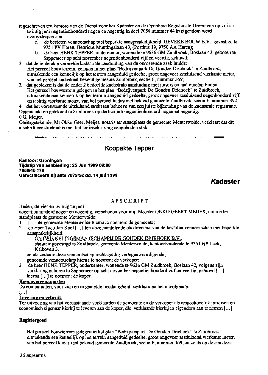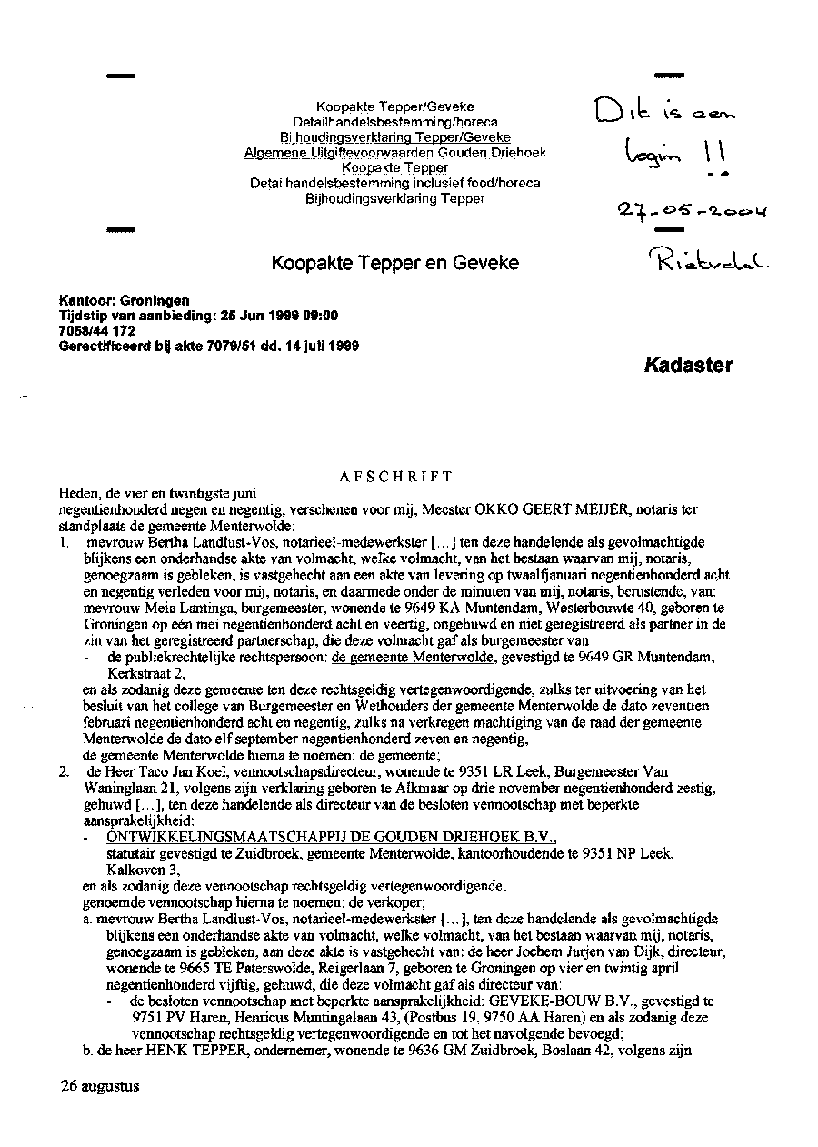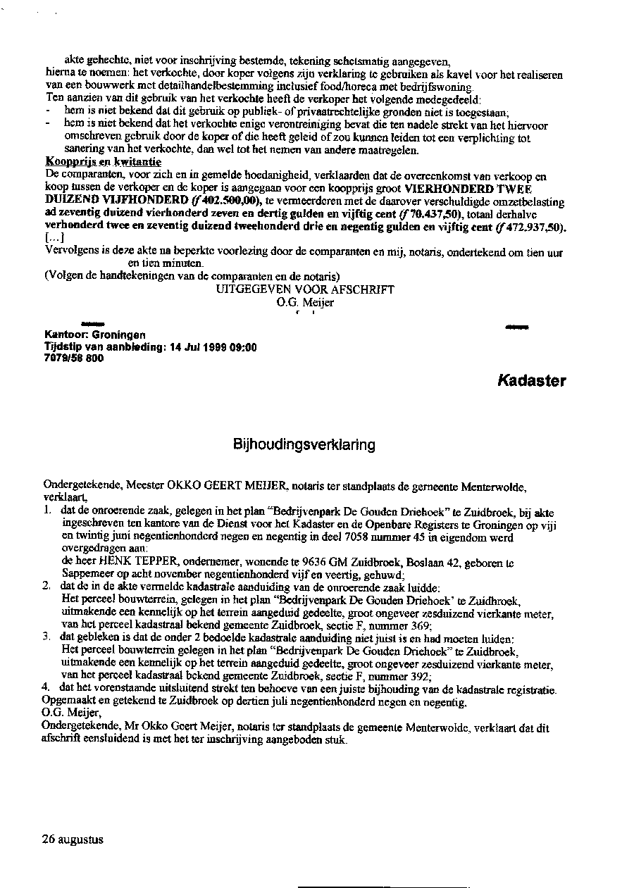 Andere verdachte grondtransacties op de Gouden Driehoek zijn mij niet bekend. Wel heb ik lange lijsten van betrokken ondernemers, waarbij met name enkele turkse ondernemers, een failliete transportfirma, autohandel, advertentiefraudeurs en een geheimzinnig Drents-Gronings genootschap dat zich Maatschap Club van Tien noemt, opvallen. Deze maatschap bestaat uit zeer hooggeplaatste figuren onder leiding van de projectontwikkelaar Lammert Snijder (PAS, oud-hoofdsponsor BV Veendam), zijn broer caravanhandelaar Sylvester Snijder (oud-voorzitter Bovag), Bart Duursema, registeraccountant Rob de Beus, en jurist W.L.R. Schuurmans.