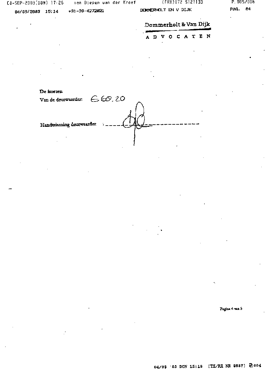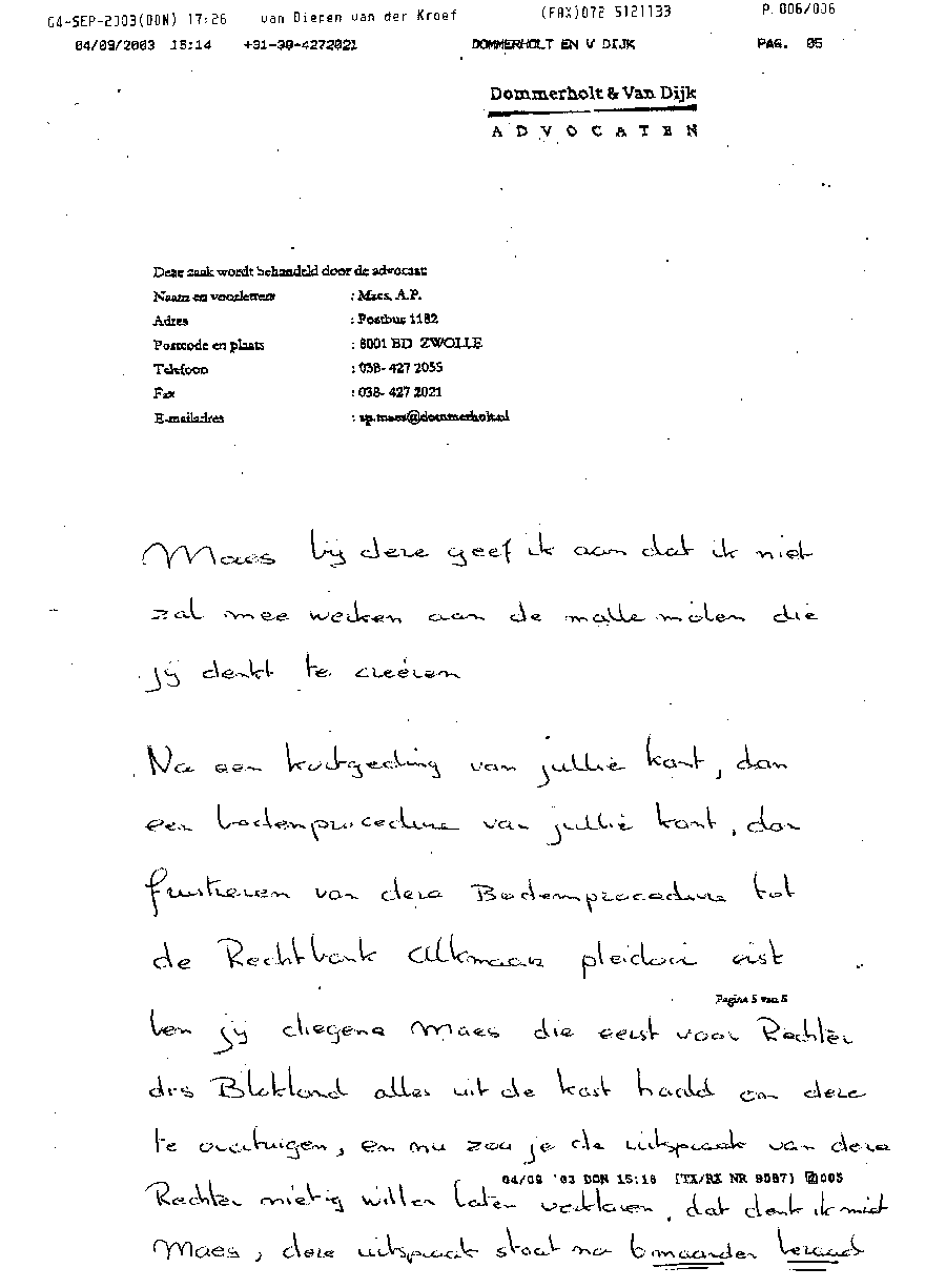 Faxbericht aan mr. Maes van Kees Griesdoorn over schijneisers