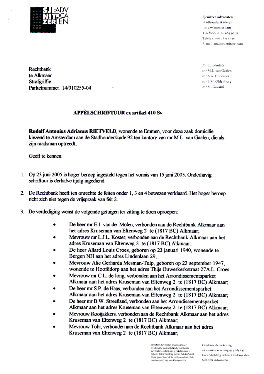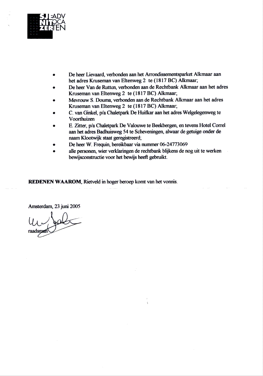 De zitting zal worden gehouden bij het Gerechtshof te Amsterdam. Tevens geef ik, Rietveld, in het kort aan welke bijrol deze personen (allen werkzaam bij de rechtbank in Alkmaar) hebben gehad. De hoofdrol is boze opzet en is en was het afdekken van justitiële en rechterlijke blunders en valsheid in geschrifte en in rechtsprocedure om Rietveld monddood te kunnen maken en te proberen hem financieel te slopen om zijn weerstand te breken en zijn dossiers voor eeuwig te begraven.