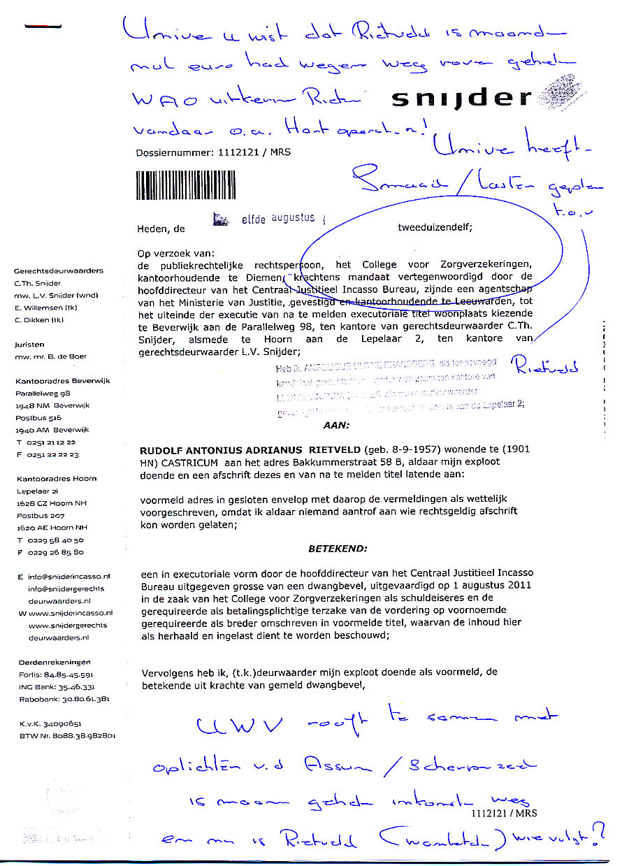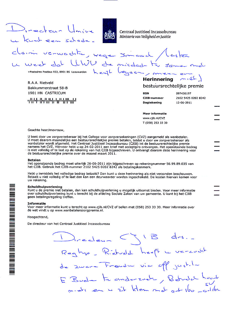 Aan alle volksvertegenwoordigers, ministers, justitiële en politieambtenaren, mijn verslag van overheidsfraude in de brief aan minister Opstelten over binnenvallen van politie in opdracht van de Officier van Justitie. Zie Deel I en Deel II van het interview, waarin misbruik van bevoegdheden en manipulatie met boze opzet verklaard worden. Deel III kan aanleiding zijn voor een kabinetscrisis omdat de ministers Donner en Verhagen verantwoordelijk zijn voor de uitwassen bij het UWV, het CJIB, de ambassade in Jakarta en het beleid voor Justitie en Buitenlandse Zaken. N.B.: Alle uitlatingen vallen strikt onder de verantwoordelijkheid van Ir. R.A.A. Rietveld.
