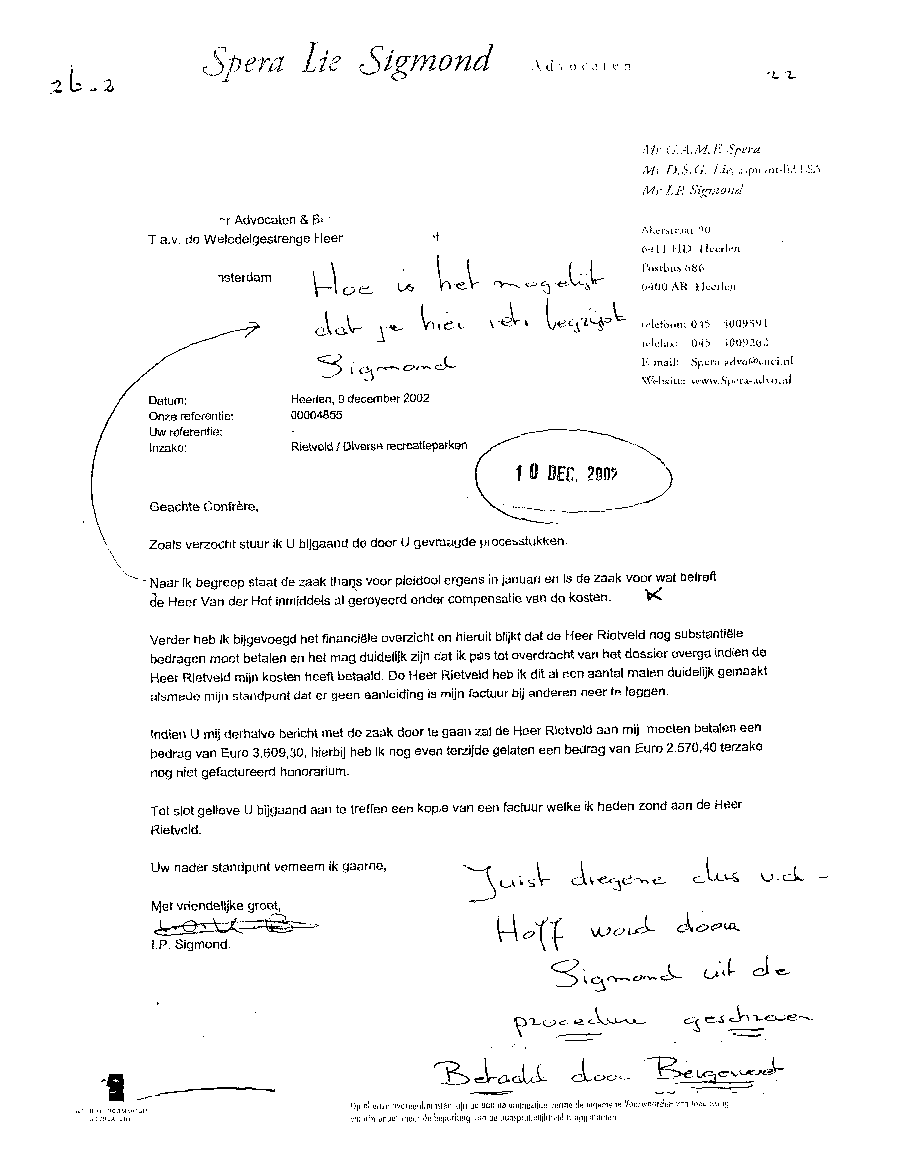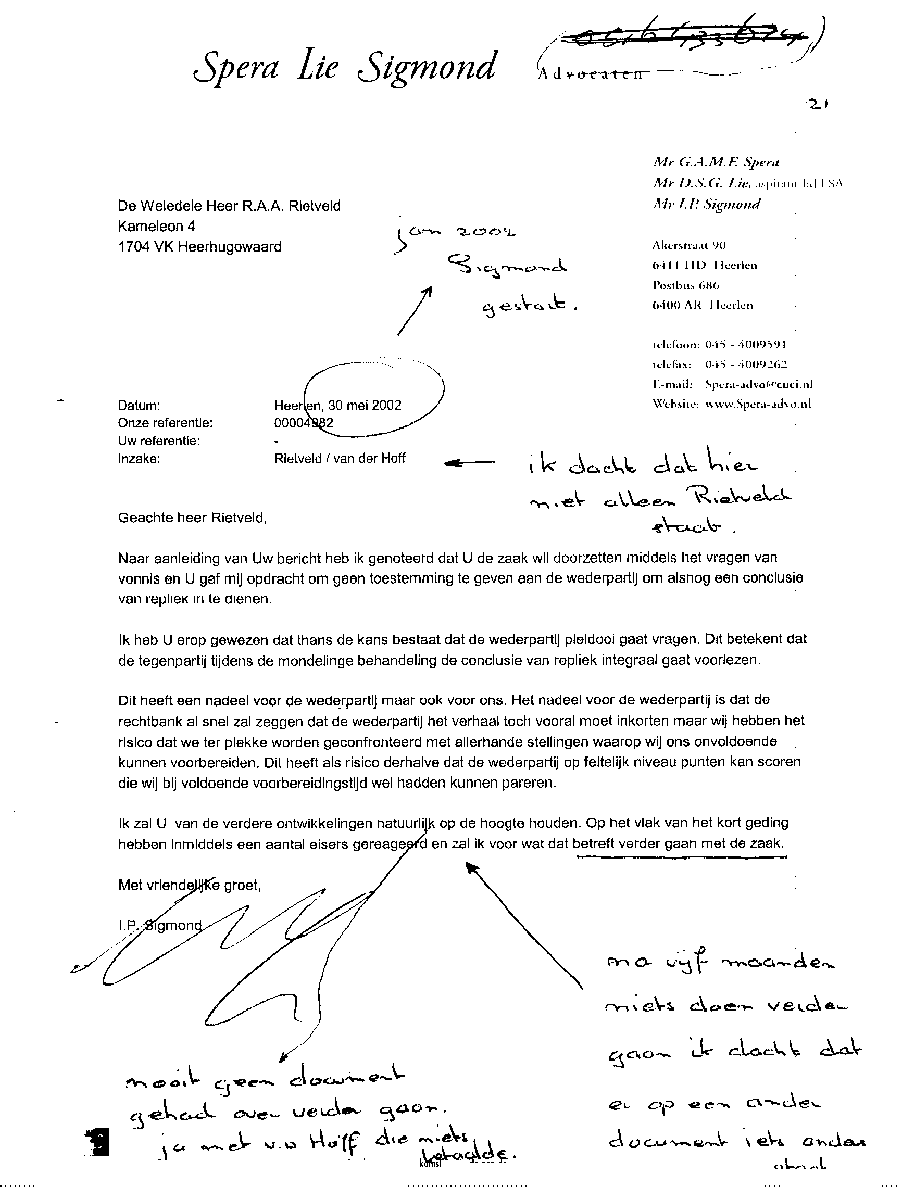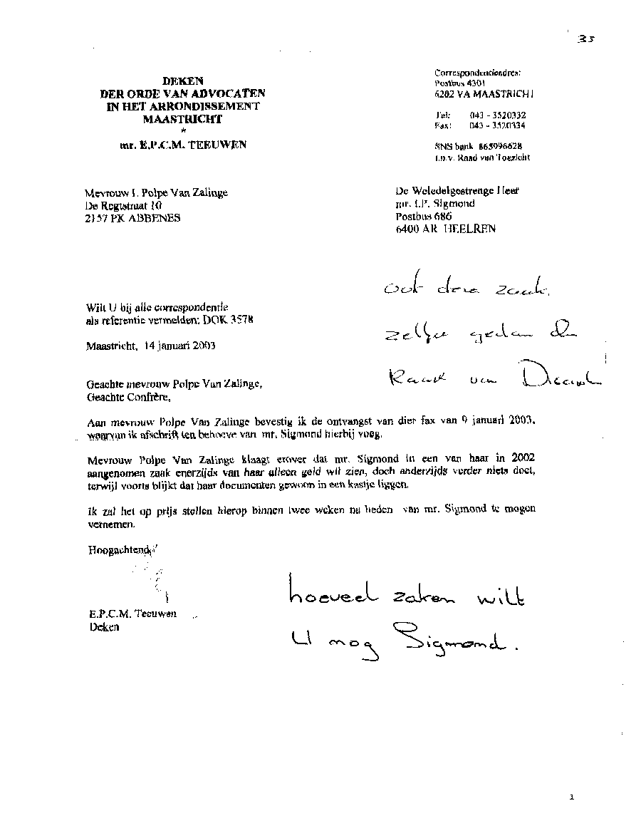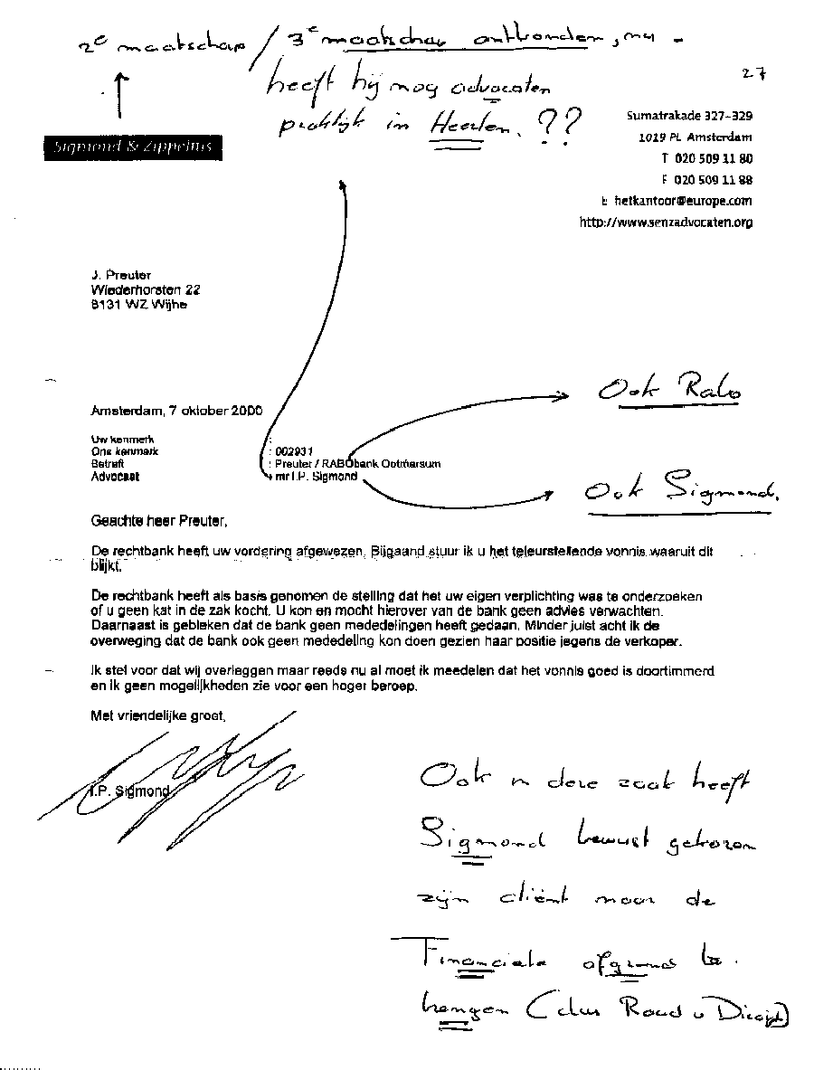 Verwijt aan mr. Sigmond over z'n inactiviteit. Wel betalen, maar niet kunnen halen!