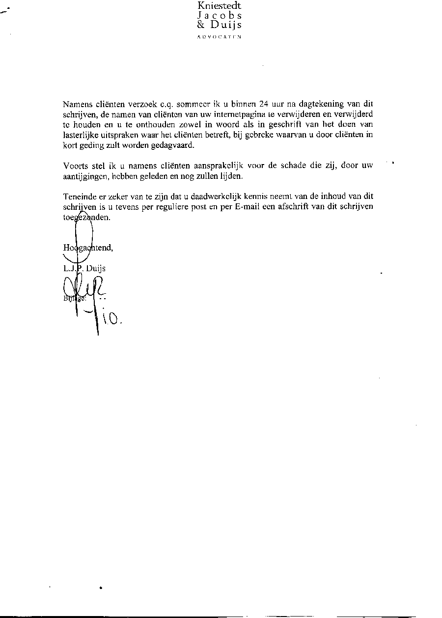 Brief aan SDN met de sommatie om de website van Rietveld te verwijderen