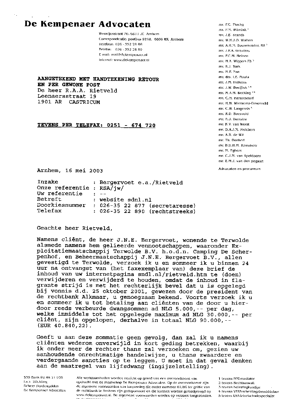 Brief aan SDN met de sommatie om de website van Rietveld te verwijderen