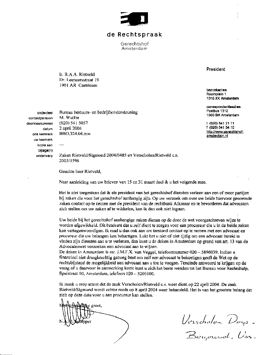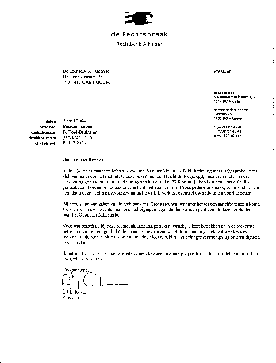Bij deze mijn antwoord op uw brief van 9 april 2004 waarin u zich stelt achter rechter Croes, maar impliciet ook dat de rechtbank Alkmaar zeer bewust corrupte advocaten toelaat en tolereert en de kwalijke gevolgen daarvan. U sauveert zelfs belangenverstrengelde rechters in uw toko die nog geen onderscheid kunnen maken tussen dode eisers, personen die geen eiser waren, en waarvan niemand aanwezig was. MOEILIJK VOOR 'N AL 18 JAAR BEGRAVEN PERSOON OM EISER TE ZIJN TEGEN RIETVELD Zie de documenten van de criminele advocaat Maes met 60 voor 90 procent niet-bestaande eisers. En dan zijn er opeens nog maar 30. En nu mevr. Koster, hoeveel zijn het er nu nog?? Hebt u dat door het Openbaar ministerie al laten uitzoeken ?? Dat is een zeer ernstig vergrijp hoor !!! Dode mensen opvoeren in een "rechts"procedure met misleiding van de rechter. Dat is beslist een zware misdaad; veel ernstiger dan valsheid in geschrifte en meineed. Nog erger, dat Croes toen als fungerend vice-president deze valsheid in rechtsprocedure met zijn verstrengeling heeft toegestaan !! Hij heeft toen wel drie uur als een zombie zitten luisteren naar vijf keer hetzelfde pleidooi. Dit dan en mogelijkerwijze als gevolg van een hersentumor, hetgeen ik nogmaals betreur. Alleen, ziek ben ik ook al tien jaar, maar jullie betreuren dat niet. Jullie proberen echt Rietveld zijn graf in te werken. Maar oh, voordat dat zover is mevrouw Koster…!!! Want als de natuur het toelaat zal ik het einde van mijn leven proberen zolang mogelijk uit te stellen, juist om dit onrecht te bevechten. Want het kan niet kan zo zijn dat door een achterlijke uitspraak mijn gezin dat alles van het leven te verwachten had, op mijn ziekte na, alles is kwijtgeraakt. Ik zal dit over mijn lijk niet tolereren. Verder zal ik per alinea de door u genoemde punten beantwoorden. Het contact wat ik volgens u met Croes zou hebben gehad is niet correct, omdat ik alleen contact heb met zijn antwoordapparaat, dat is iets anders. Verder is een brievenbus ook iets anders dan Croes als persoon. Die postbus ontvangt in veel gevallen iets zinvols, maar Croes kraamt onzin uit. En dat weet u dondersgoed. Ook mis ik vreemd genoeg in uw schrijven de langdurige gesprekken van Croes met mevr. Mesman (alias 'de Winter') die hij voerde over mijn zaak en persoon; en zelfs meer dan dat. Hoe kunt u mij dan verbieden contact te leggen met een antwoordapparaat ?? Gelul Koster !! Dat de rechtbank Croes zal steunen indien het tot een aangifte komt juich ik toe, en dat u dat doorleidt naar het Openbaar Ministerie nog meer. Omdat de corrupte Hoofdofficier Justitie A.O. Kerk nu in de regio zit van Bergervoet; de vrienden van Croes zowel als van S. de Haas. Vandaar dat mijn zaken op een na afgedaan zijn met stemmingmakerij. Prachtig Koster, ik raad u aan mijn zaken door te leiden naar Officier van Justitie Koos Plooi, die doet tenminste zijn werk; vandaar dat hij ook bedreigd is net als ik. Een van mijn vrienden van Plooi is weer een studievriend van Officier Justitie Fred Teeven. Dus u hebt de keus uit twee goede officieren van Justitie. Duidelijk !! En ook deze loze bedreiging van XXX met het bewijs in mijn handen is aan die twee klungels niet besteed, zoals al eerder door mij genoemd hebben zij niets gedaan. Voor wat het punt van mijn aanhangige zaken betreft waar ik bij betrokken ben of nog betrokken zal geraken. U moet niet vergeten, Mevrouw Koster, de echte oorzaak ligt in Croes zijn achterlijke uitspraak. Vandaar ook mijn steeds groter wordende schadeclaim. En mevrouw Koster, het door u aangehaalde punt om iedere schijn van belangenverstrengeling of partijdigheid te vermijden. U stelt dat er rechters uit Amsterdam worden belast met deze zaak. Nu moet ik toch echt even lachen. Een advocaat die Deken is. Deze deken heeft een eigen advocatenmaatschap, die op de dag dat verstrengeling nodig is weer rechter, en als sluitstuk voorzitter van de Raad van corrupte Discipline. Alleen een juryrechtbank van burgers kan onafhankelijkheid nog enigszins waarborgen. De volstrekt corrupte constellatie van uw systeem kan dit niet. En dat u het betreurt dat u mij niet hebt kunnen bewegen mij positief op te stellen is ronduit dom. Want ik strijd voor recht, en wanneer ik dat ook gekregen had zou dat een groot voordeel voor mij en gezin zijn geweest. Maar bovenop de enorme puinhoop in uw Krombank (wat al eerder is gesignaleerd in diverse krantenverslagen) zal ik nog een schepje bij doen, door de komende week vier in uw tokootje uitgesproken zaken op het internet te ventileren. En dan eens kijken wie zijn energie negatief besteedt. Uw rechtbank en rechters mevrouw Koster, betaald door de Nederlandse belastingbetaler en op twee punten niet te vergeten. P.s. Laat mr. P.H.B. Littooy niet meer overvliegen van Alkmaar naar Amsterdam, anders hebben wij weer belangenverstrengeling. En tot slot: als u allen net zo goed of slecht kunt onthouden als ik, komt mijn geplaatste opmerking in een gesprek op uw Krombank haarfijn uit [ Bergervoet lacht zich te barsten en gaat rustig door. Zie mijn bijgeleverde document ]. Deze brief gaat ook naar de minister. Rietveld Hoogachtend