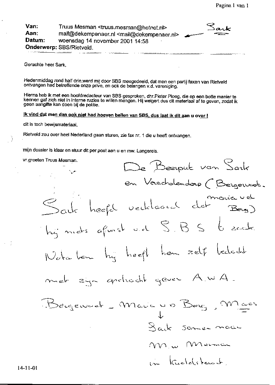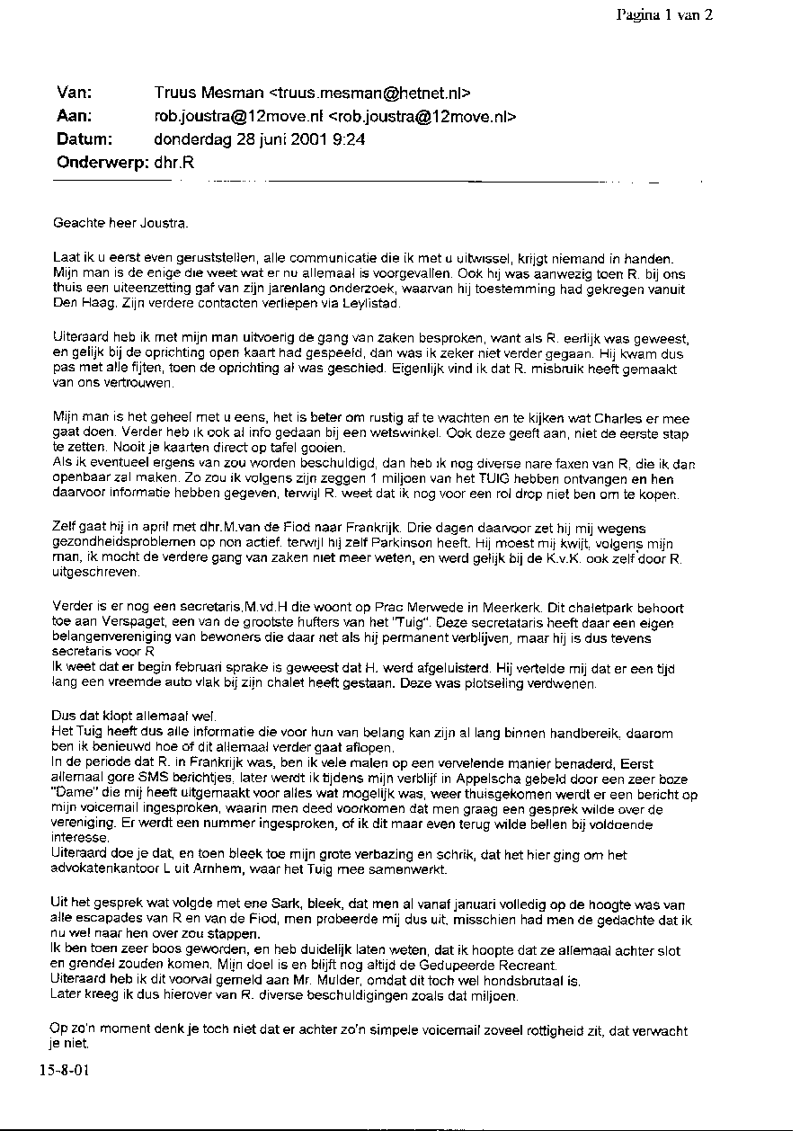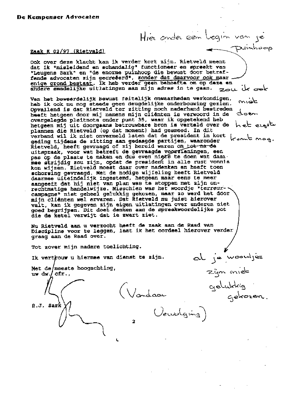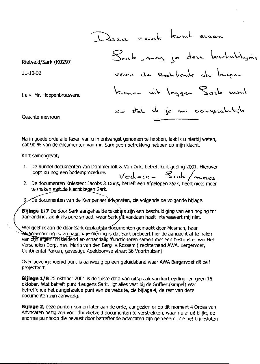 Bij deze doe ik bij u formeel aangifte van valsheid in geschrifte, gepleegd door de heer R.J. Sark, omdat deze op 16 oktober 2001 tijdens een kortgeding rolnummer 01/890 de rechtbank heeft misleid met leugens en bedrog.