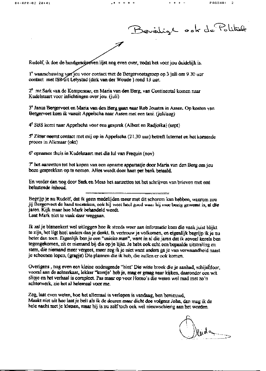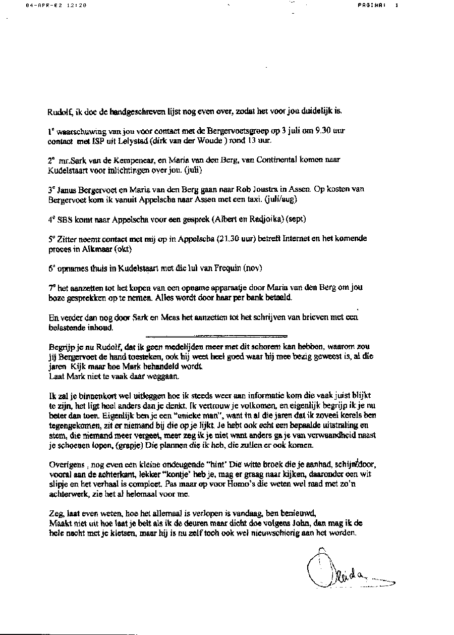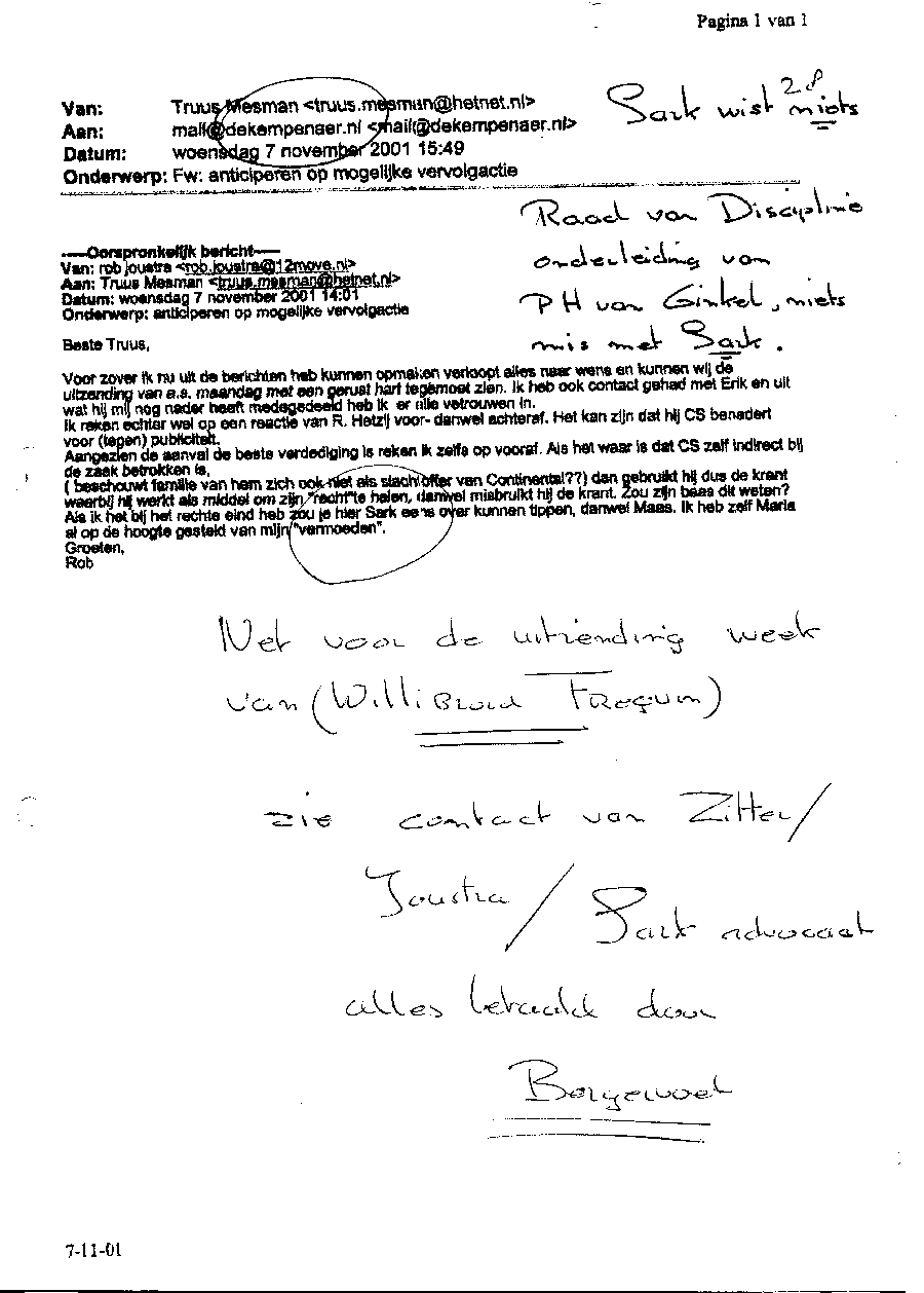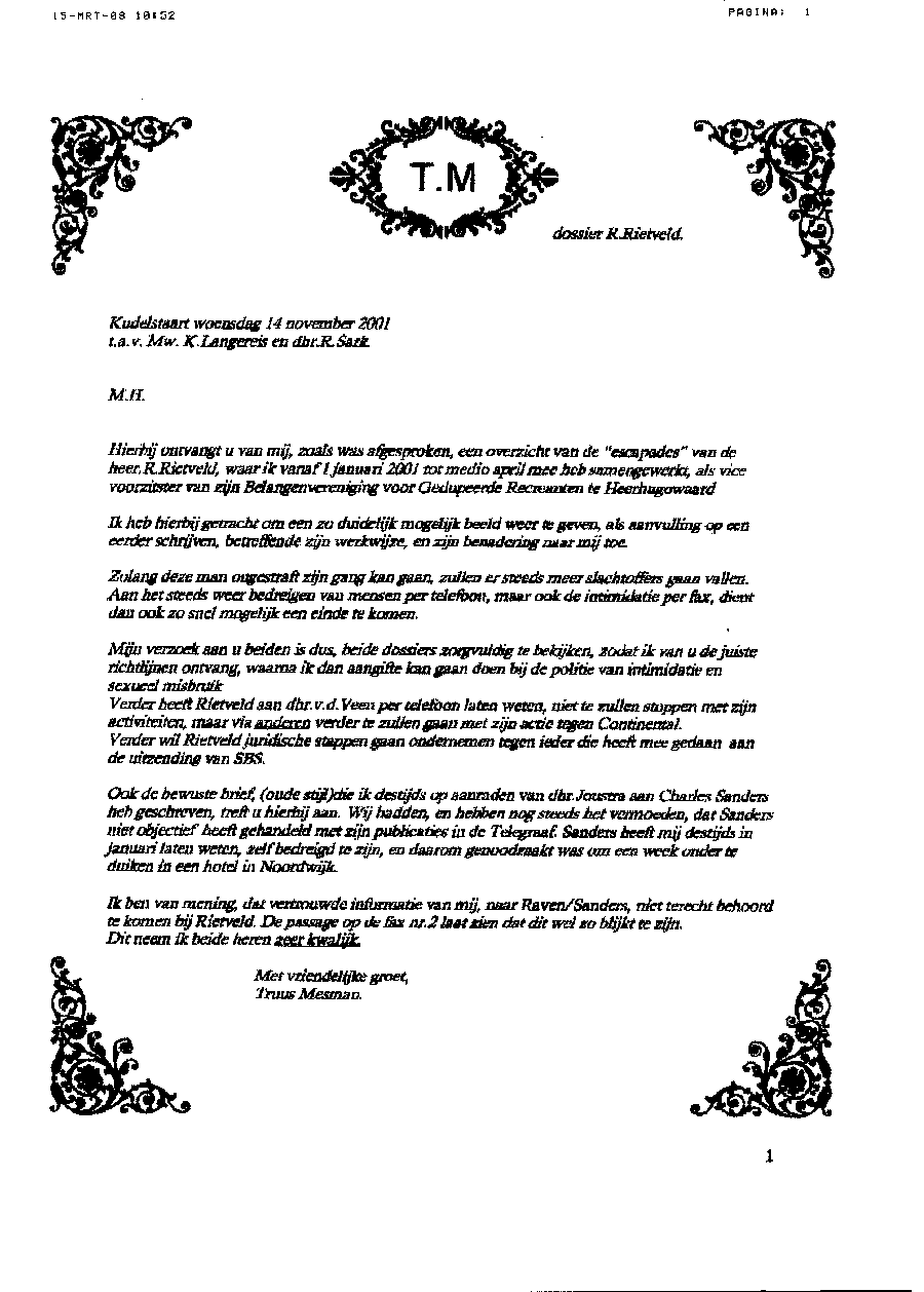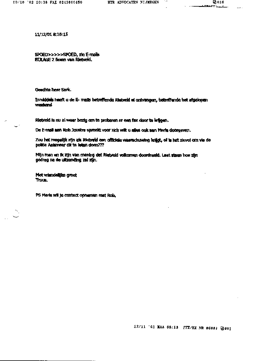 Bij deze doe ik bij u formeel aangifte van valsheid in geschrifte, gepleegd door de heer R.J. Sark, omdat deze op 16 oktober 2001 tijdens een kortgeding rolnummer 01/890 de rechtbank heeft misleid met leugens en bedrog.