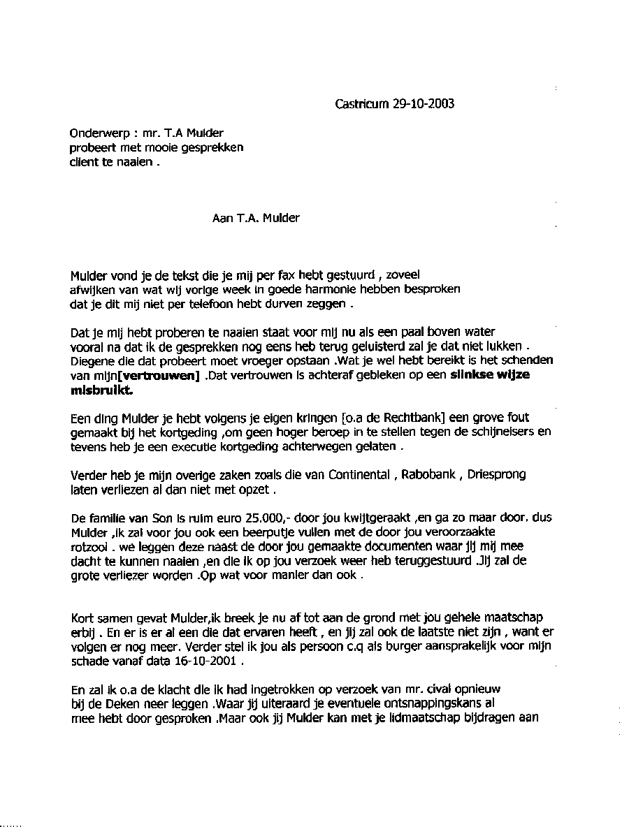 Verwijt aan mr. Sigmond over z'n inactiviteit. Wel betalen, maar niet kunnen halen!