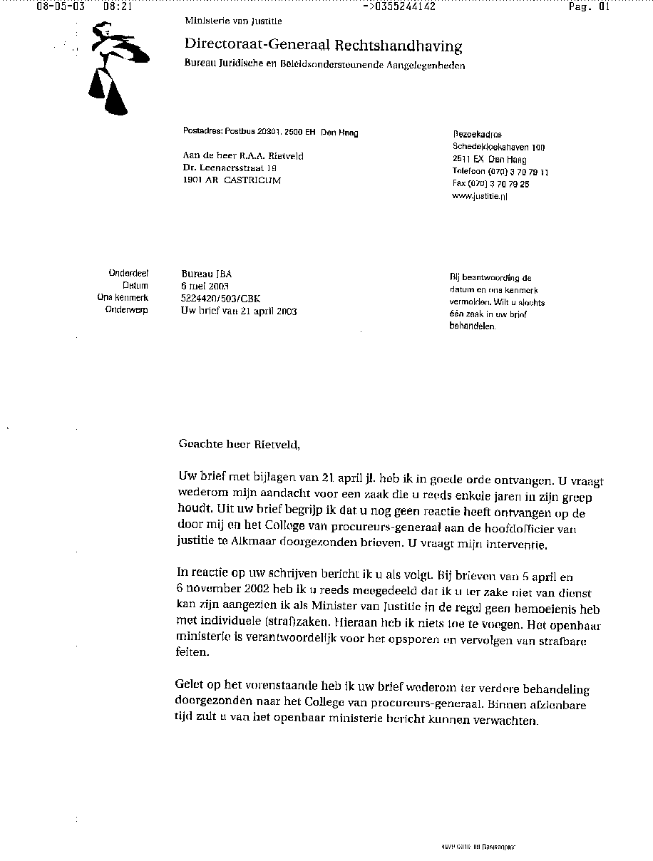 De uitspraak van mr. A.L. Croes was onrechtmatig, en ook het nog steeds rekken van mr. S. de Haas begint erop te lijken dat deze beide heren proberen om onder de totale gang van zaken uit te komen. Het betref de strafzaak uit 2001 tegen SBS-6 wegens smaad jegen Rietveld in het programma van 'De Week van Frequin' op 11 nov. 2001. Want als deze beerput opengaat, dan gaan er vele koppen rollen. Dan komen er veel onvolkomenheden en gemaakte fouten aan het licht die men het liefst binnenskamers houdt. De lijst met schijneisers en de uitspraak van mr. Croes hebben geleid tot alle schade die Rietveld heeft opgelopen. Niet te vergeten de praktijken van de goedbetaalde leugenaars van Bergervoet e.d.