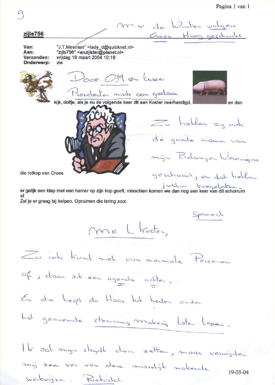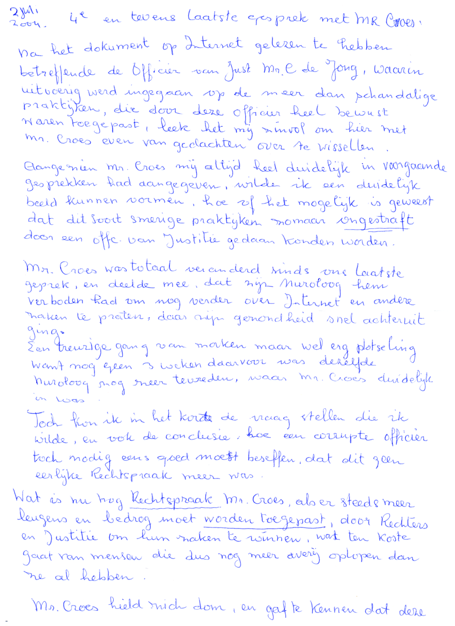 Ondanks alles hebt u nu kunnen ervaren, dankzij het gevoerde gesprek, dat (volgens u) met mij een goed en ook duidelijk onderbouwd gesprek gevoerd kan worden. "Met Rietveld kan ik niet meer praten, en wil ik dat ook niet", was uw opmerking. Nu, mr. Croes, u weet nu mijn uitgangspunt. Ik handel uit een brede horizon, al wordt ik door de campingmaffiabaas betiteld als een 'achterlijk oud wijf'. Dat was ook diens reden dat men mij bewust onder druk heeft gezet, met alle narigheid die daar verder op volgde. Uiteindelijk zit ik als enige in een strafzaak, door mr. de Haas die een zondebok zocht, en gaan de leugenaars vrijuit. Zieke mensen, zoals ik, die durft men aan, en u weet als geen ander hoe dat voelt.
