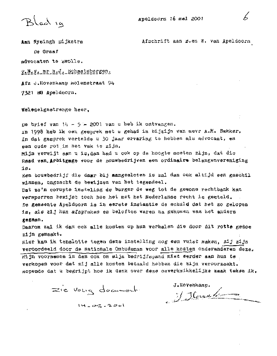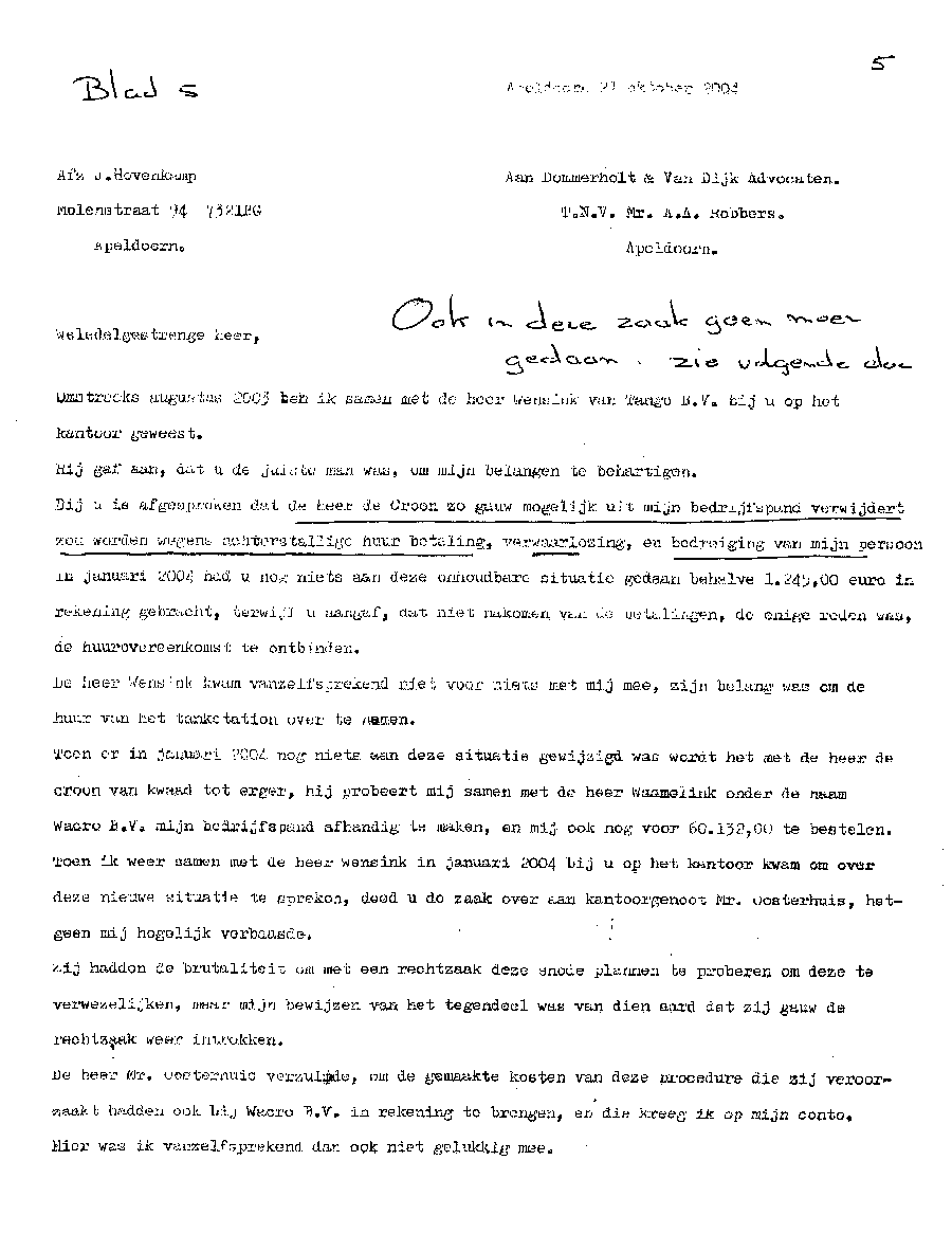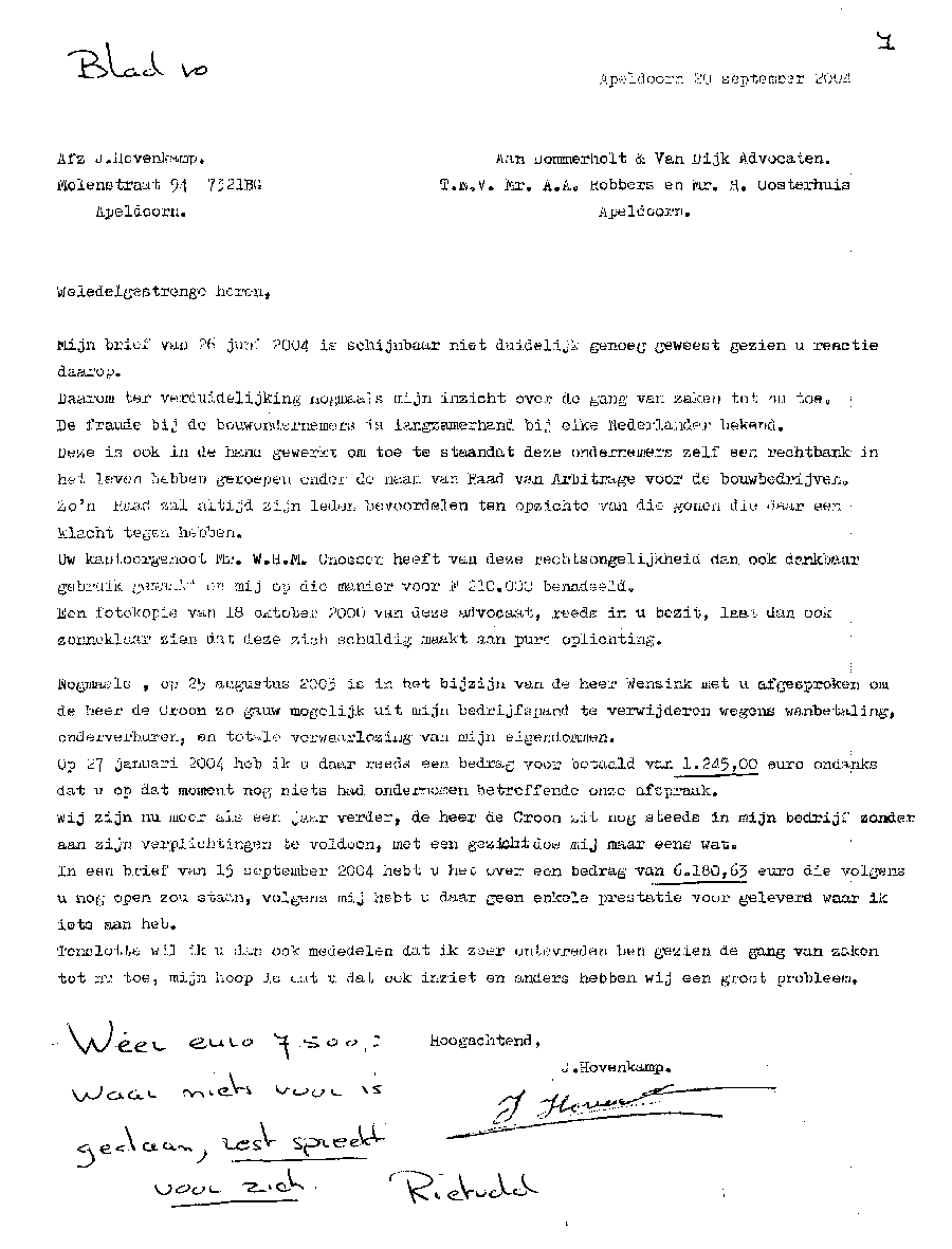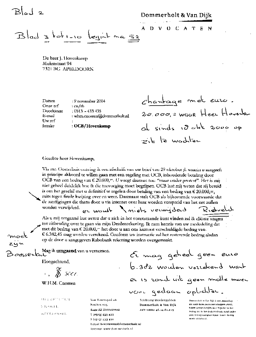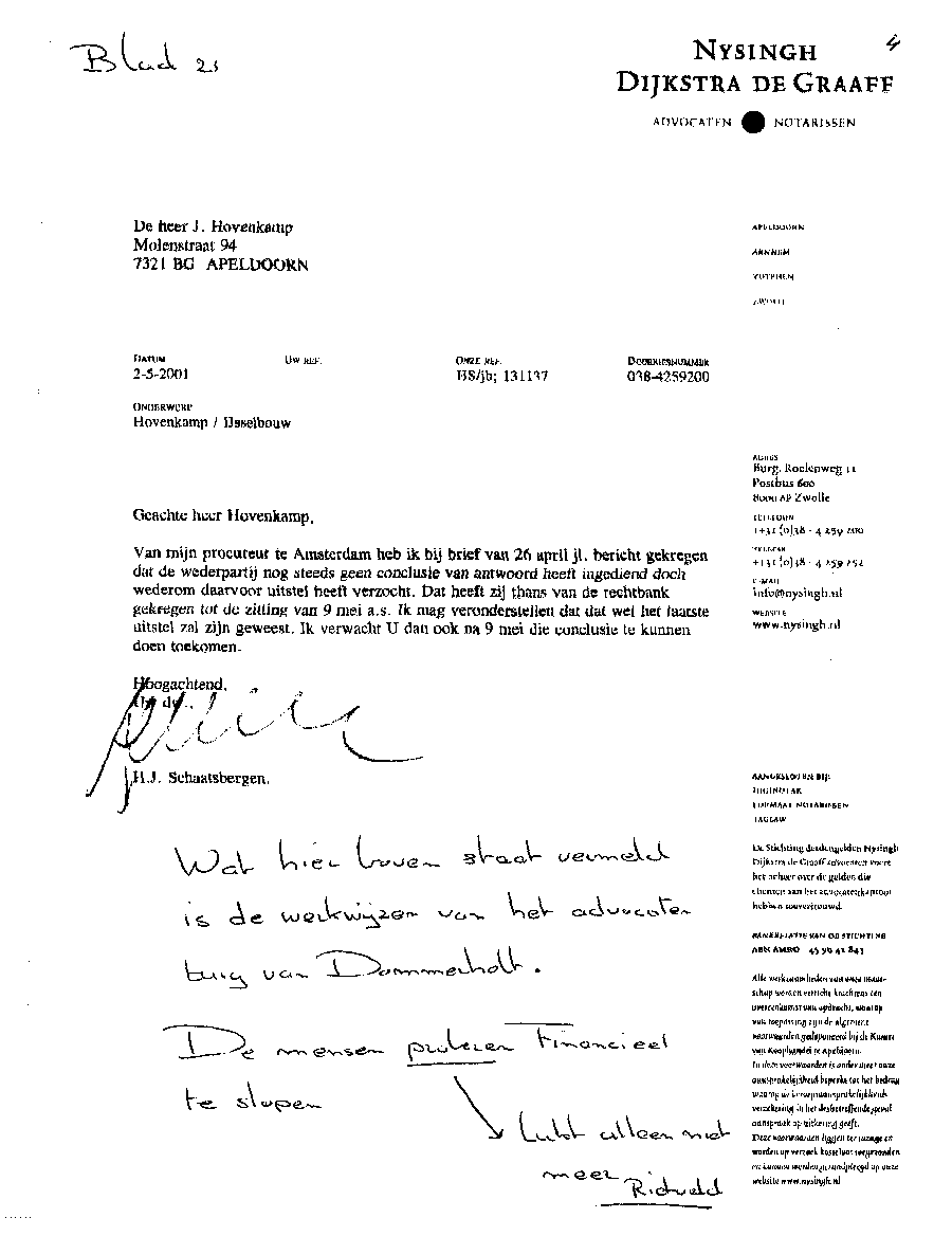 Dit met resultaat dat ik inmiddels twee woningen ben kwijtgeraakt door onrechtmatige beslagen, justitiële en advocatenfraude en ruim euro 900.000 aan schade heb opgelopen. Daarnaast is mijn gezin nu volledig uit elkaar gevallen, met wederom mentale en materiële schade. Deze zelfde rechter geeft in mei 2004 zelf opdracht aan officier Justitie mr. C. de Jong om mij te laten vervolgen wegens stalking. Tevens zegt deze rechter in diverse gesprekken aan derden dat ik wel een poosje verplichte rust zou kunnen gebruiken en dat eenieder dan rust zou krijgen. Hij voert die gesprekken met iemand als tegenpartij van mij die in een strafzaak van smaad/laster zit. [te gek voor woorden]