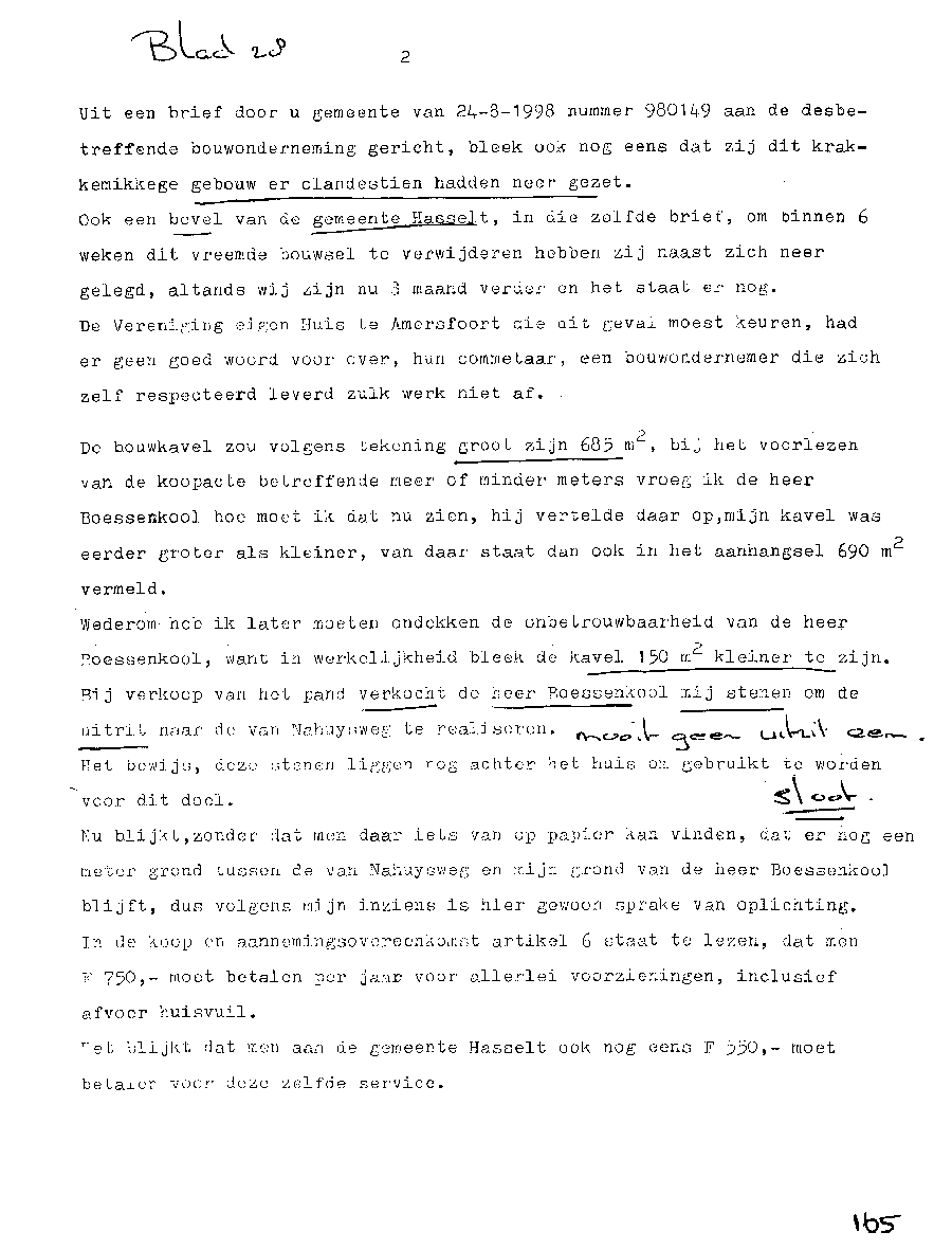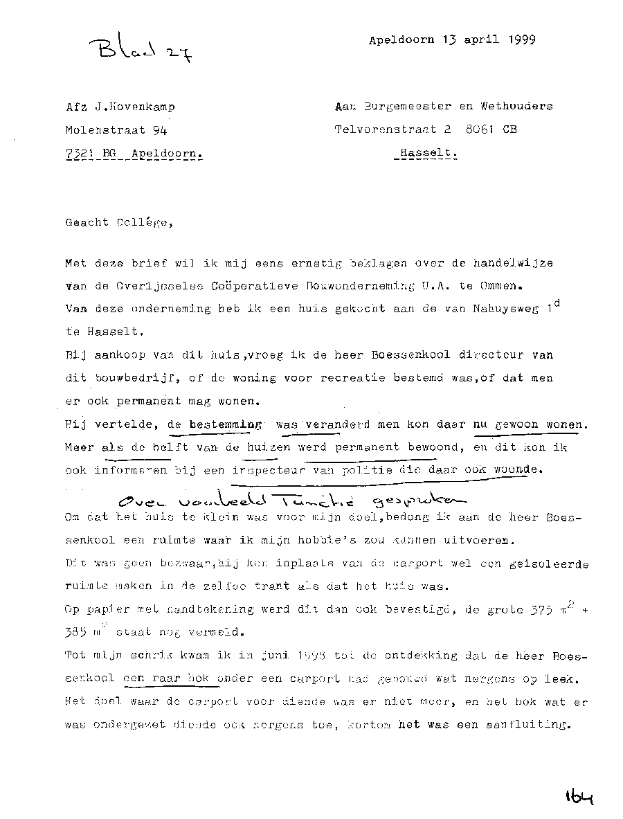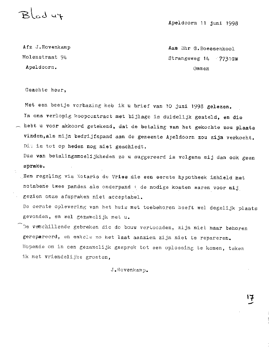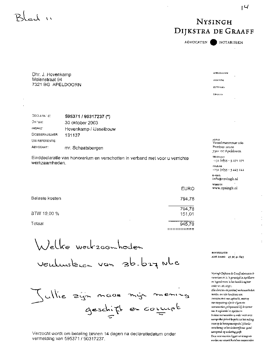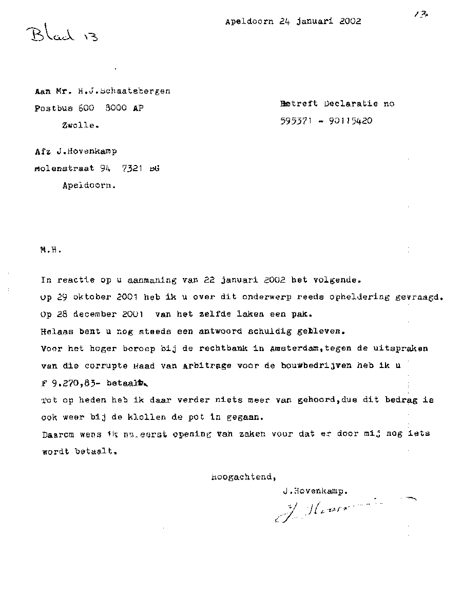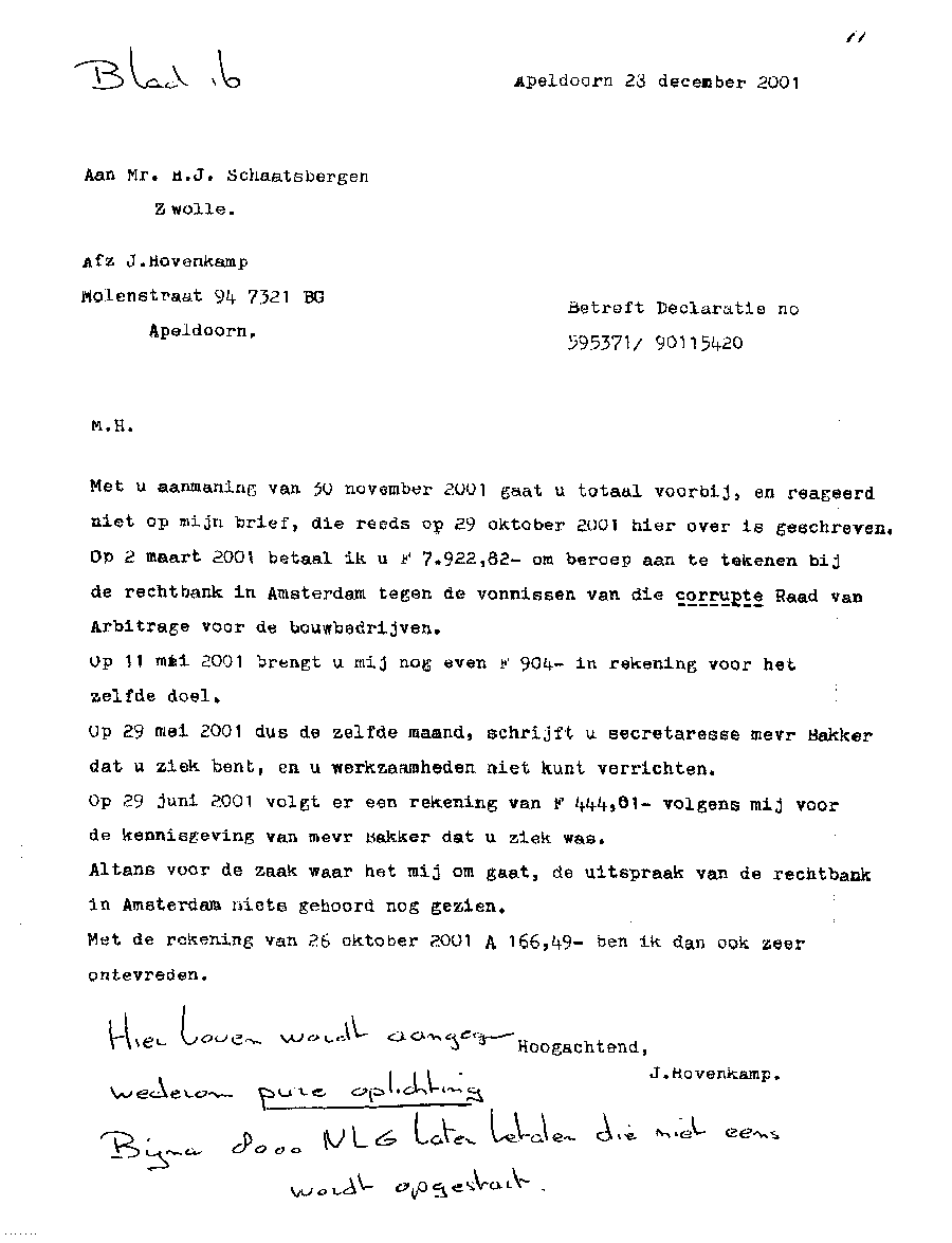 Dit met resultaat dat ik inmiddels twee woningen ben kwijtgeraakt door onrechtmatige beslagen, justitiële en advocatenfraude en ruim euro 900.000 aan schade heb opgelopen. Daarnaast is mijn gezin nu volledig uit elkaar gevallen, met wederom mentale en materiële schade. Deze zelfde rechter geeft in mei 2004 zelf opdracht aan officier Justitie mr. C. de Jong om mij te laten vervolgen wegens stalking. Tevens zegt deze rechter in diverse gesprekken aan derden dat ik wel een poosje verplichte rust zou kunnen gebruiken en dat eenieder dan rust zou krijgen. Hij voert die gesprekken met iemand als tegenpartij van mij die in een strafzaak van smaad/laster zit. [te gek voor woorden]