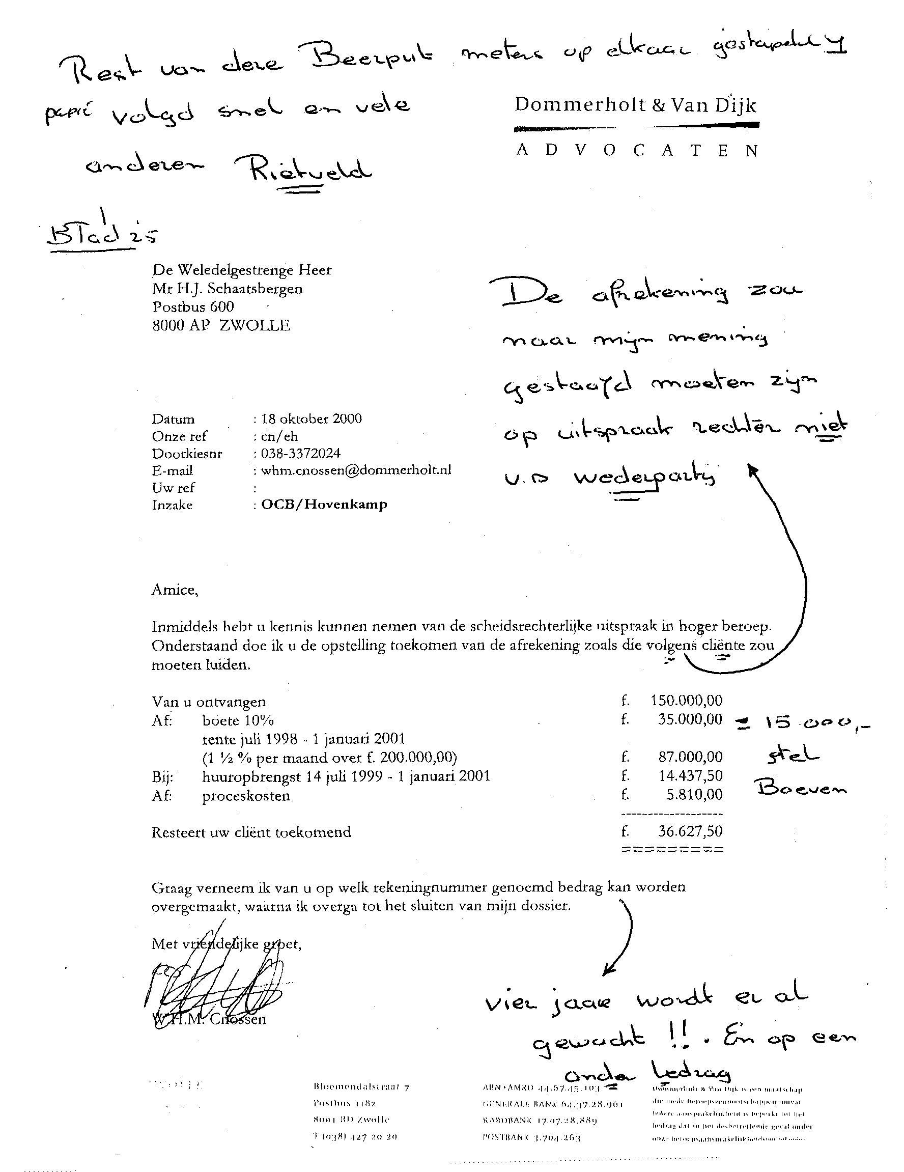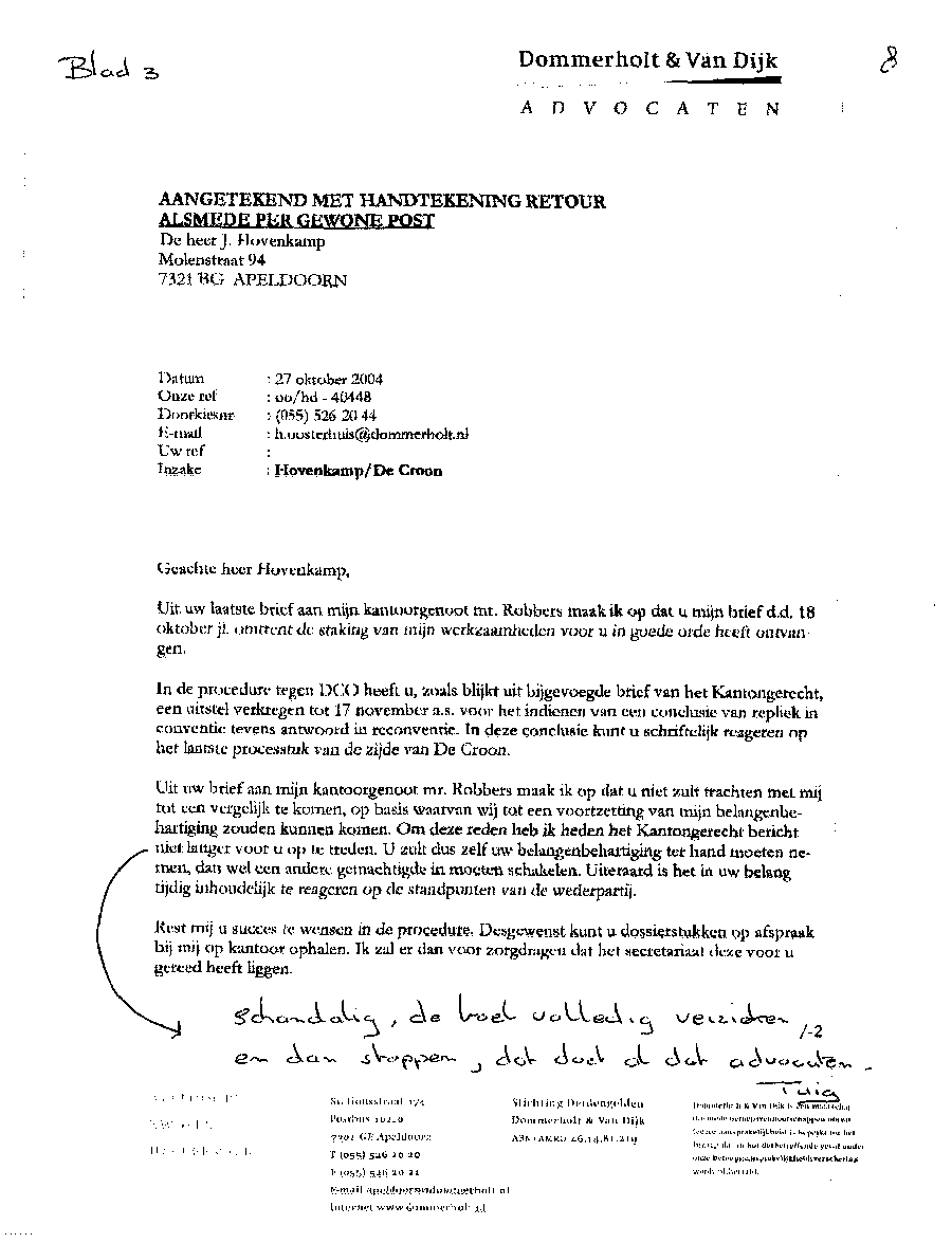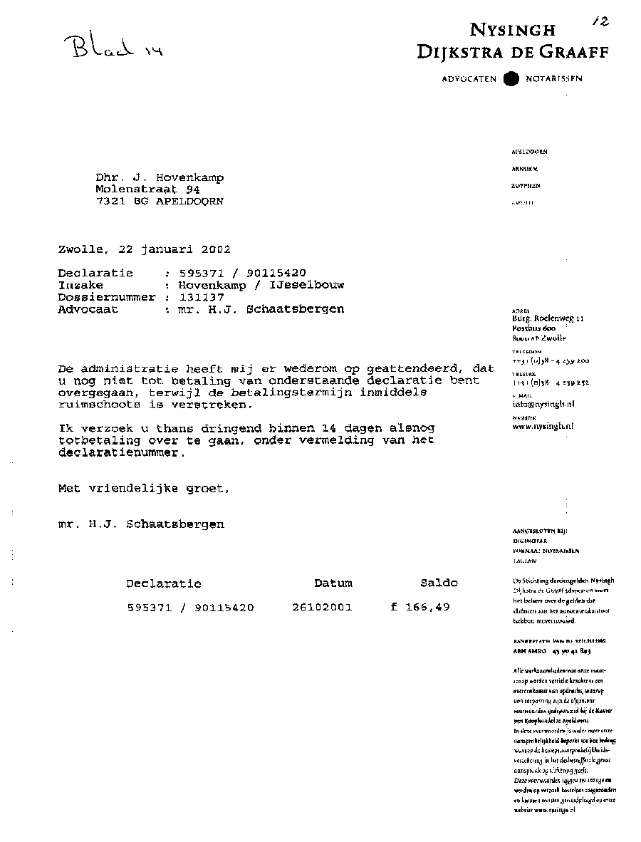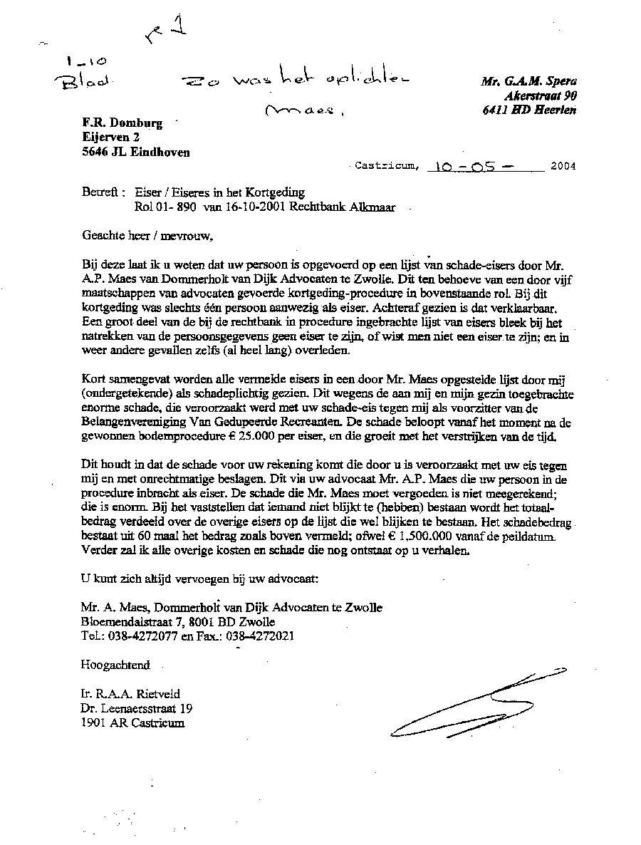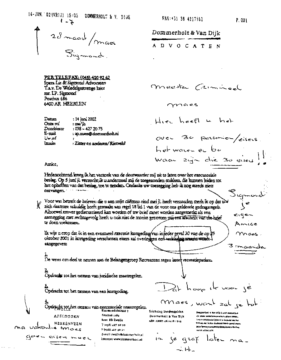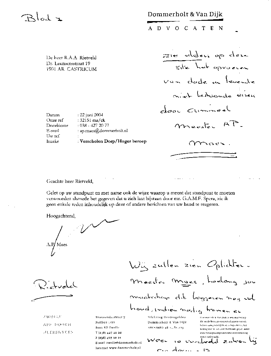 Document met procedure tegen mr. Maes van Dommerholt & van Dijk in Zwolle