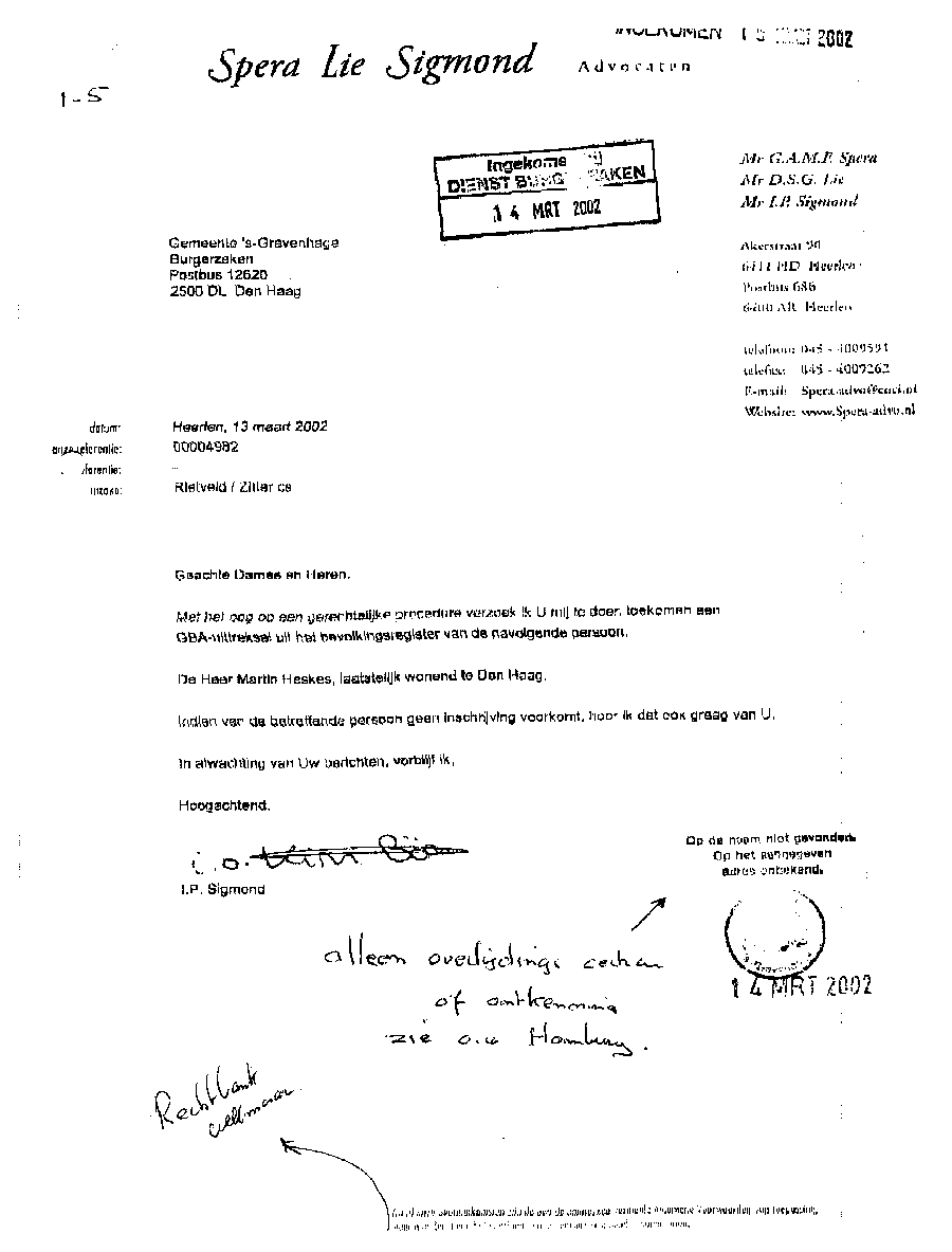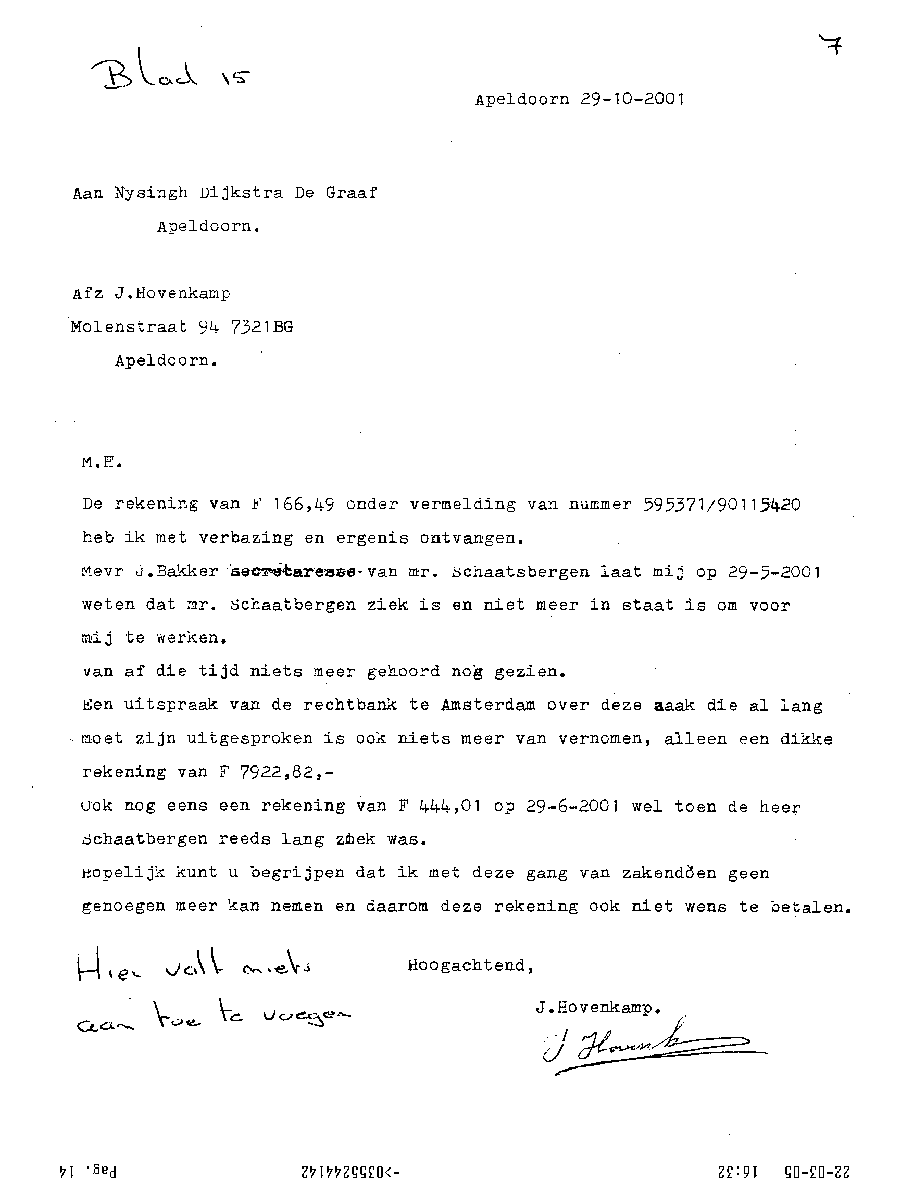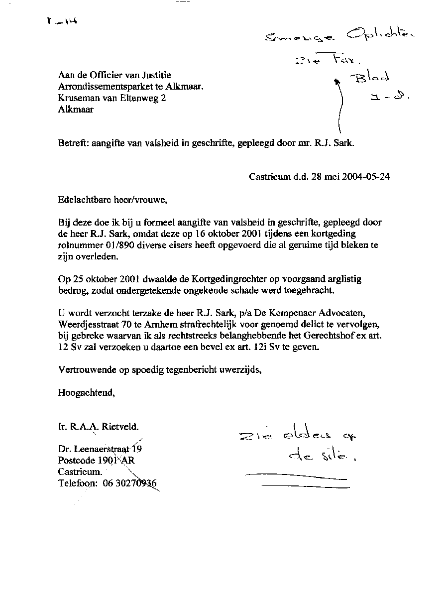 Tot slot laat ik u weten dat tijdens de drie dagen van 19 tot 21 mei er een spookfax is verstuurd naar de rechtbank in Haarlem met een valse handtekening van mij, waarin ik mijn zaak van smaad/laster zou hebben ingetrokken. Op valse beschuldiging zat ik die drie dagen namelijk vast in een politiecel in Alkmaar. Die fax met het verzoek om mijn zaak in te trekken kan ik niet zelf hebben gestuurd. De kring waarin die valse fax is opgemaakt en werd verzonden is zeer klein en beperkt zich tot de Rechtbank en het OM in Alkmaar. Niemand daarbuiten wist van die zaak af. Dit is een schandaal van de hoogste orde.