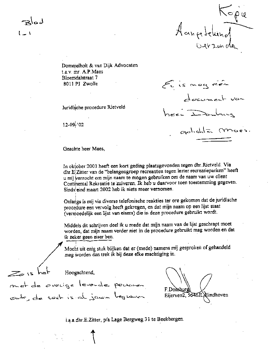 Minister Remkes heeft van Rietveld een dossier van negen jaar research aangereikt gekregen om de campingmaffia van o.a. Bergervoet op de juiste en ook fiscale plek te krijgrn. (Het bewijs dat kampers in de historie en nog steeds de kans krijgen om te ontsnappen, kunnen we zien aan de leegstaande panden die door Bergervoet zijn verlaten en die te koop of te huur zijn aangeboden. Zelfs zijn troetelkind aan de Apeldoornsestraatweg 56 te Voorhuizen. Dit pand wordt door de provincie Gelderland overigens nog steeds gedoogd als kantoorpand, wat niet kan. Daarnaast diende de BV precies een dag voor de provinciale bouwstop een bouwaanvraag in bij de provincie Gelderland voor het bouwen van stenen bungalows. Dit voor de realisatie van 42 stenen bungalows aan de Immenbergweg. Dat is corruptie tot in de hoogste regionen, want Bergervoet had nooit vooraf van die bouwstop kunnen weten. Een zuivere zaak van voorkennis.