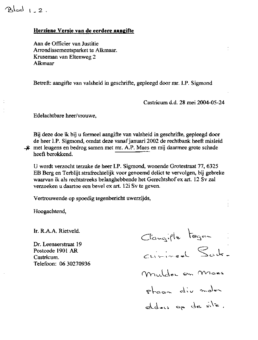Plaatsvervangend Hoofdofficier L.Ph. Den Hollander te Alkmaar heeft in juni 2004 geweigerd correcties aan te brengen in vier aangebrachte zaken ex. Art12 Sv(i) tegen de criminele advocaat mr. Arjan P. Maes, mr. Rutger Sark en mr. Ivo Sigmond en mr. Ton Mulder in vier inhoudelijk verschillende zaken. Dit omdat hij bewust deze fout heeft gemaakt en gehandhaafd; en daarmee deze advocaten van een ontsnappingsroute heeft voorzien. (Dat zal niet lukken..!!)