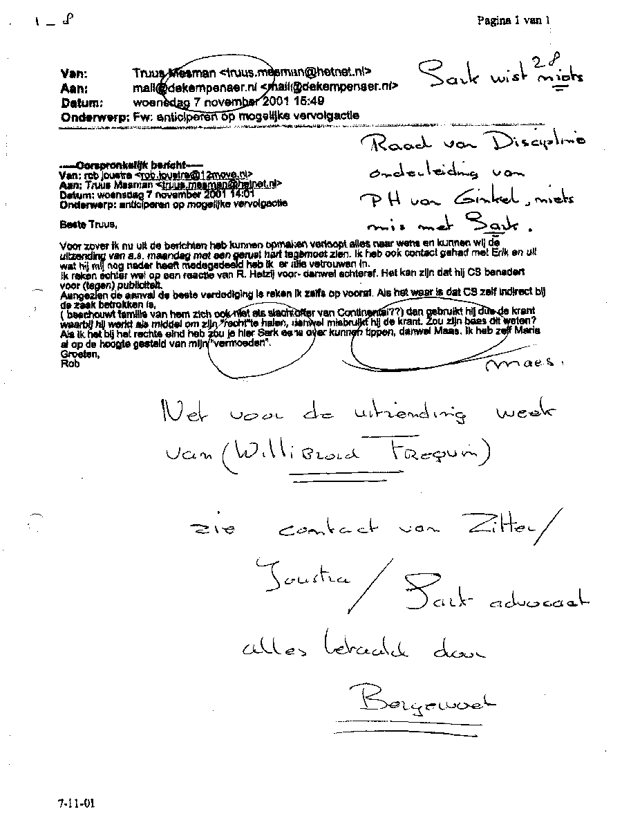 Verder is deze Officier van Justitie (de Jong) onmiddellijk van mijn zaak afgehaald, omdat ik kon aantonen dat zij zelf een dossier voor de rechter in 2003 had achtergehouden en zij heeft gemanipuleerd met geluidsbanden. Ook eerdere officieren hebben mijn zaken al volledig en bewust gefrustreerd; zelfs de zaak van de door Bergervoet [bovengenoemde kamper] ingehuurde Willibrord Frequin om mijn naam op televisie te schaden en de uitspraak van het kortgeding te misbruiken. Daarvan heb ik overigens de bodemprocedure gewonnen en moet in september in een hoger beroep mee [Gerechtshof Amsterdam] omdat het systeem zo werkt.