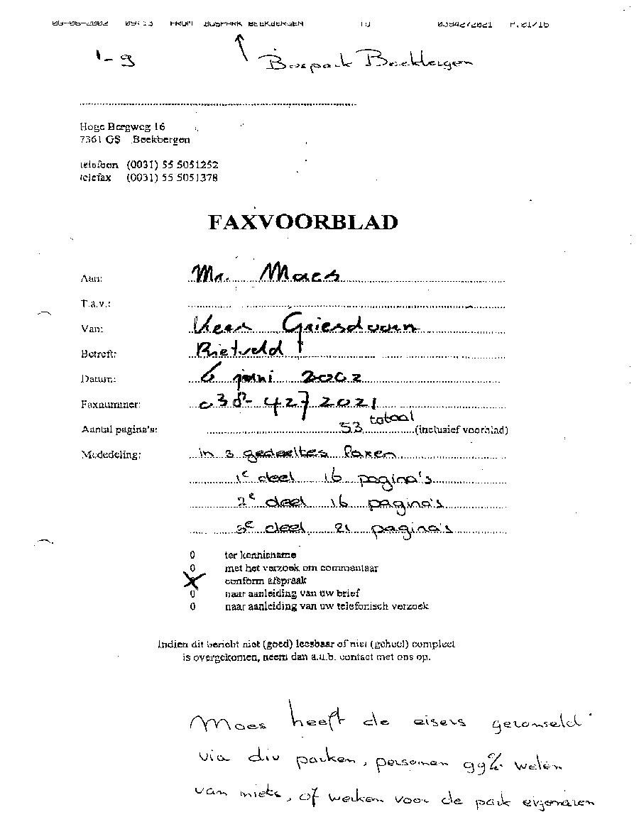 Faxbericht aan mr. Maes van Kees Griesdoorn over schijneisers