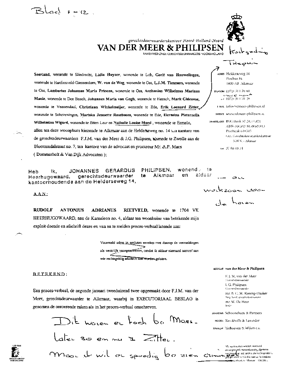 De presidenten van Dijk, Van der Molen en L. Koster van de rechtbank in Alkmaar hebben in de afgelopen twee jaar ten koste van alles vice-president mr. A.L Croes de hand boven het hoofd gehouden (citaat Mr. L.J.L. Koster). Deze rechter, Croes, heeft toegelaten dat de criminele advocaat mr. A.P. Maes van Dommerholt & van Dijk Advocaten te Zwolle, overleden zowel als levende niet-bestaande eisers heeft kunnen opvoeren in een rechtsprocedure tegen Ir. R.A.A. Rietveld op 16 oktober 2001, op rol 01-890, met de uitspraak op 25 oktober 2001. Deze dwalende uitspraak was vernietigend voor het gezin Rietveld. (Er wordt nog steeds gewacht op de compensatie van de toegebrachte schade)