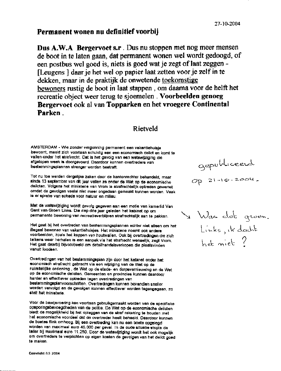 Voorlopige conclusie van Rietveld aan de recreanten en semi-permanente bewoners