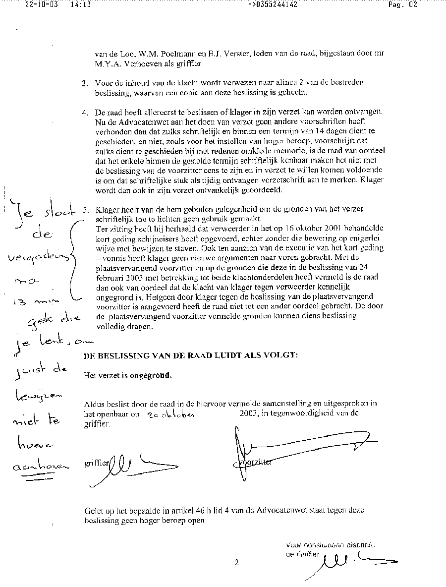 Rietveld kreeg het woord en verklaarde dat meester Maes (die vertegenwoordigd werd door zijn collega mr. Koers) valsheid in geschrifte had gepleegd door een lijst van eisers op te stellen tegen Rietveld wegens diens zogenaamd onrechtmatig handelen ten koste van eigenaren van chalets op recreatieparken, zijnde: "De Valouwe/Bospark Beekbergen" en de "Lithse Ham". Rietveld verwees naar twee gedragsregels m.b.t. art. 738 en 739 van de advocatenwet. Ook moet een advocaat de kosten beperkt houden voor de tegenpartij. Kapotprocederen mag echt niet. Een door meester Maes in kortgeding ingebrachte lijst met eisers (schijneisers) zoals Rietveld kon bewijzen met documenten uit de burgerlijke stand en andere gegevens van de overheid) waarvan bijna niemand van de vermelde "eisers" wist dat hij of zij betrokken was bij deze rechtszaak. Sterker nog, er stonden namen van mensen op die lijst die al geruime tijd overleden waren. Een zelfs al 18 jaar. Niemand zal toch kunnen ontkennen dat hier valsheid in geschrifte een feit is !! Maar ook de Raad van Discipline niet; of wel ?? Mr. Koers, als woordvoerder van meester Maes, kreeg het woord en bracht in dat Rietveld procedurefouten had gemaakt en dat daarom de zaak niet-ontvankelijk zou moeten worden verklaard. Zowel Mr. van Ginkel - voorzitter - als mr. Koers haalden er iets bij, wat niets met deze zaak te maken had toch in de procedure. Verder argumenteerde hij wat wazig dat uittreksels uit de burgerlijke stand van gemeenten niet duidelijk waren ( Ook niet voor de raad !!). Rietveld interrumpeerde, dat dit niet het geval was, en dat hij wel 22 meter gestapeld papier kon overleggen om het tegendeel te bewijzen. De voorzitter reageerde daarop dat deze zitting geen rechtbankzitting was maar een zitting van de tuchtraad om met name de tucht binnen de beroepsgroep te bewaken. Hij herhaalde dat later nog een keer met: "Wij zijn geen rechtbank" Toen Rietveld dreigde zijn bewijzen (die hij bij zich had) aan de raad te overleggen, zoals hieronder te zien is, kapte de voorzitter de zitting onmiddellijk af als zijnde gesloten. Van een half uur erudiete beoordeling van een uiterst gevoelige zaak bleef van de zitting maar 13 minuten over minus vijf minuten van de introductie van de voorzitter, kennelijk wegens de mogelijk ongewenste onthulling van feiten. De "Raad van Discipline" wordt door mij dan ook omgedoopt tot "Onraad van Discipline" of "Raad van Verdoezeling". Ik weet nog niet wat het uiteindelijk zal worden. Na het ontnemen van het woord aan Rietveld met het brute sluiten van de zitting door voorzitter van Ginkel en waarbij niemand van de vijf overige leden van de Raad vragen hadden gesteld zei ik als waarnemer: "Dat is niet netjes, voorzitter. Ik raad u aan om op het internet de website van de heer Rietveld eens grondig te bekijken". Mijn respect voor voorheen de "Raad van Discipline" is bij deze integraal naar de afvalbak verwezen. Los van de uitspraak over zes weken - rond 27 oktober 2003 - beschuldig ik nu al dit college van het afdekken van kwalijke praktijken zoals van meerdere kanten door anderen ook al is gesignaleerd. Het afdekken met de "Deken" der liefde voor de beroepsgroep is een aanfluiting van wat een integere rechtspleging moet zijn. Daarbij wordt door de verplichte procesvertegenwoordiging - wanneer het tuchtrecht niet goed functioneert - de rechtzoekende burger die afhankelijk is door die verplichte procesvertegenwoordiging de toegang tot de rechter ontzegd, zoals in artikel 17 van de grondwet is vastgelegd. De cover-up (met een te verwachten afwijzing van de eis van Rietveld) om het imago van de advocatuur niet nog verder in de modder te zien zinken, is een gevaar voor de rechtszekerheid die aan burgers bescherming moet bieden tegen onrecht en misbruik van macht. Misbruik van autoriteit o.a. door voorheen de Raad van Discipline legt de bijl aan de wortels van de democratie. Naar gelang bovengenoemde handelwijze van de voorheen de Raad van Discipline tot niets leidt, benadert Rietveld meester Maes dan niet meer rechtsom, maar linksom. P.s.: Van Rietveld vernam ik dat dezelfde voorzitter in april 2003 de zwendelende mr. Sark ondanks zijn schandalige handelwijze (zie documenten) toch de hand boven het hoofd heeft gehouden. De 'omerta' die bij de maffia het zwijgen afdwingt over criminele zaken, lijkt ook bij voorheen de Raad van Discipline gebruikelijk te zijn.