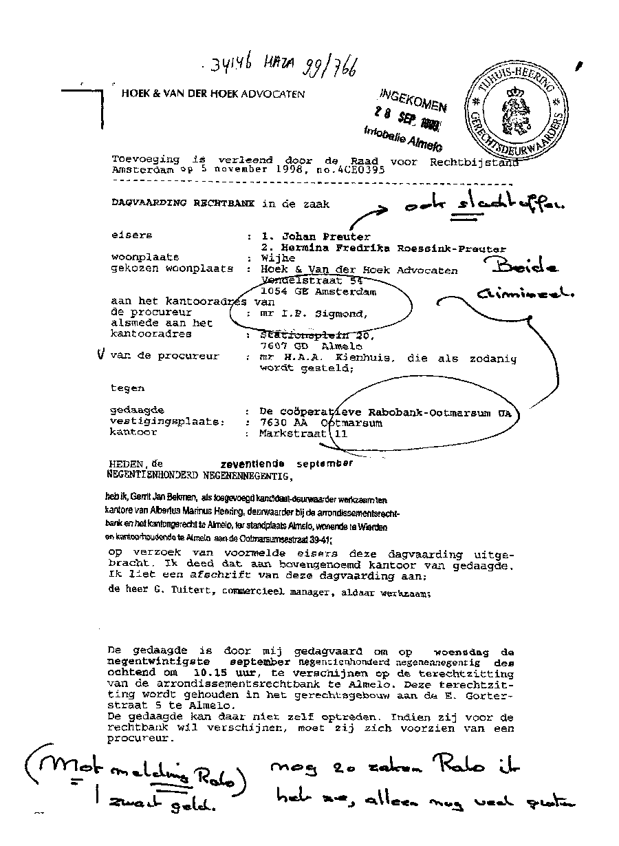Document met procedure tegen mr. Maes van Dommerholt & van Dijk in Zwolle