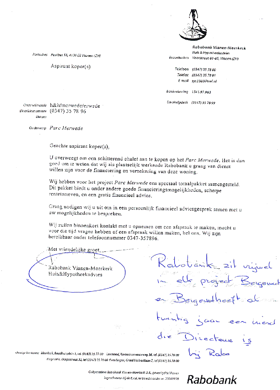 Bewijs van verstrengeling van de Rabobank met de beleggers in de recreatieparken