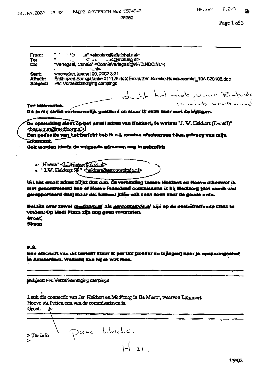 Faxbericht aan mr. Maes van Kees Griesdoorn over schijneisers