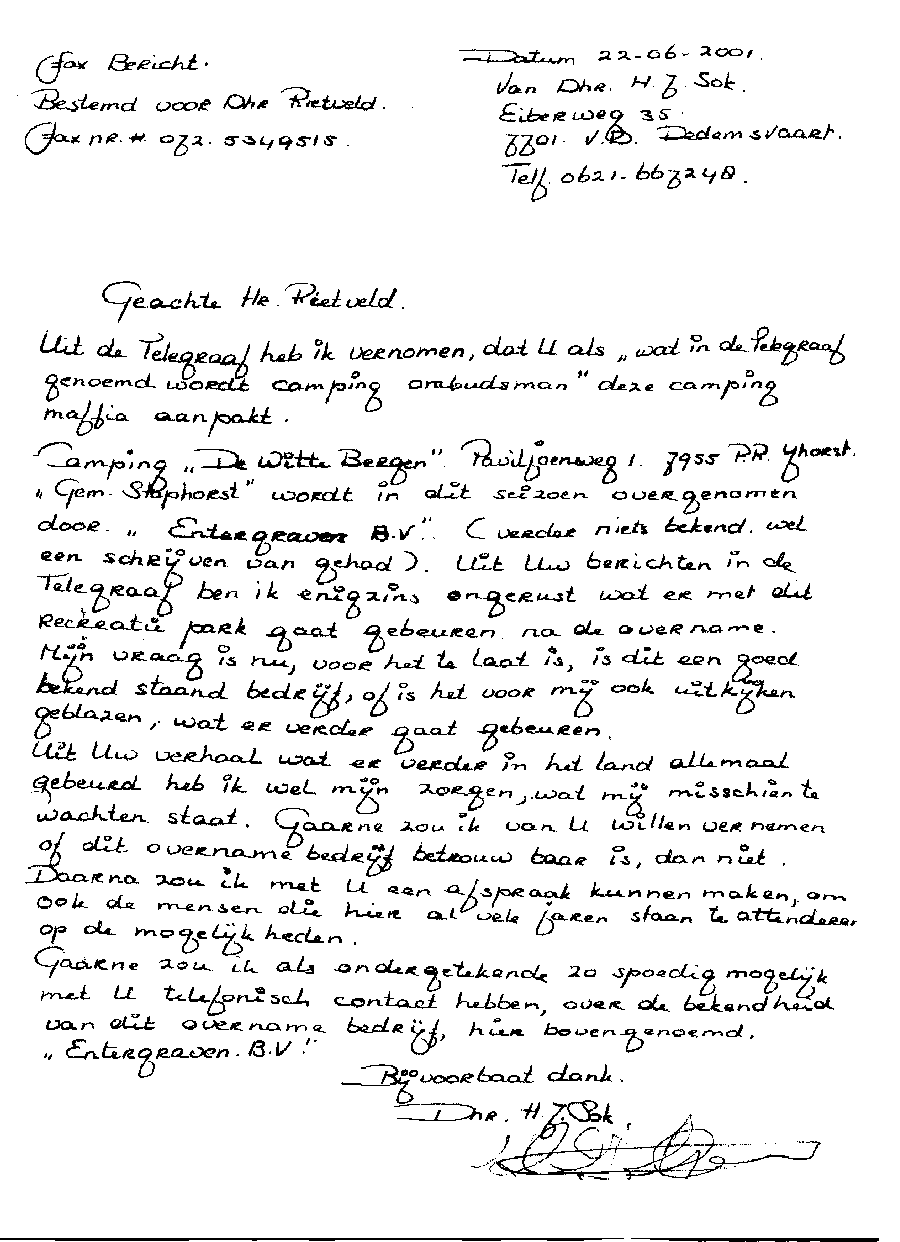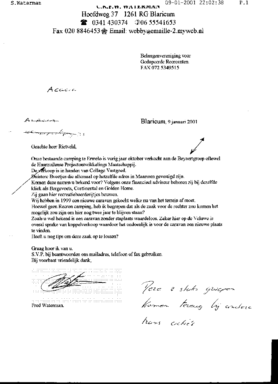 Faxbericht aan mr. Maes van Kees Griesdoorn over schijneisers