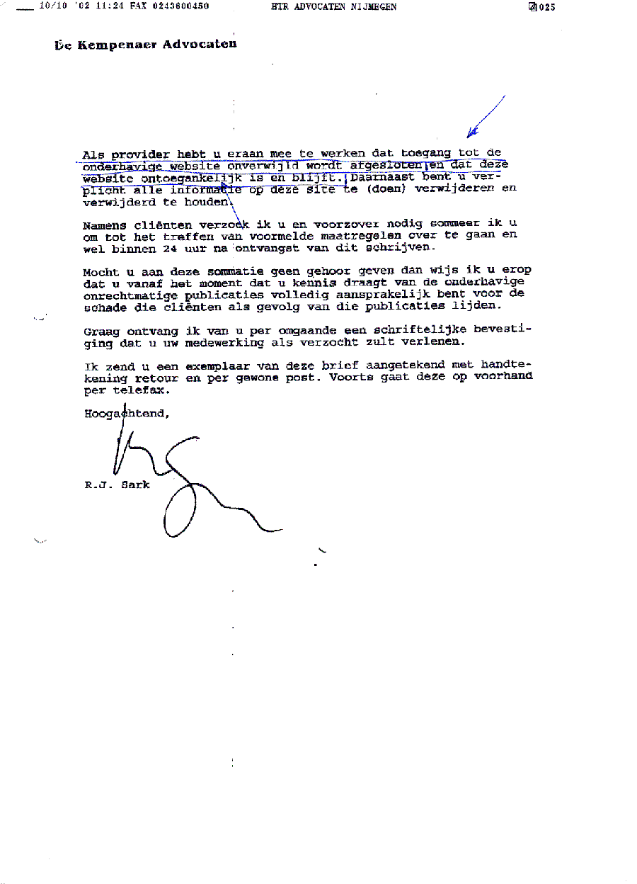 Faxbericht aan mr. Maes van Kees Griesdoorn over schijneisers