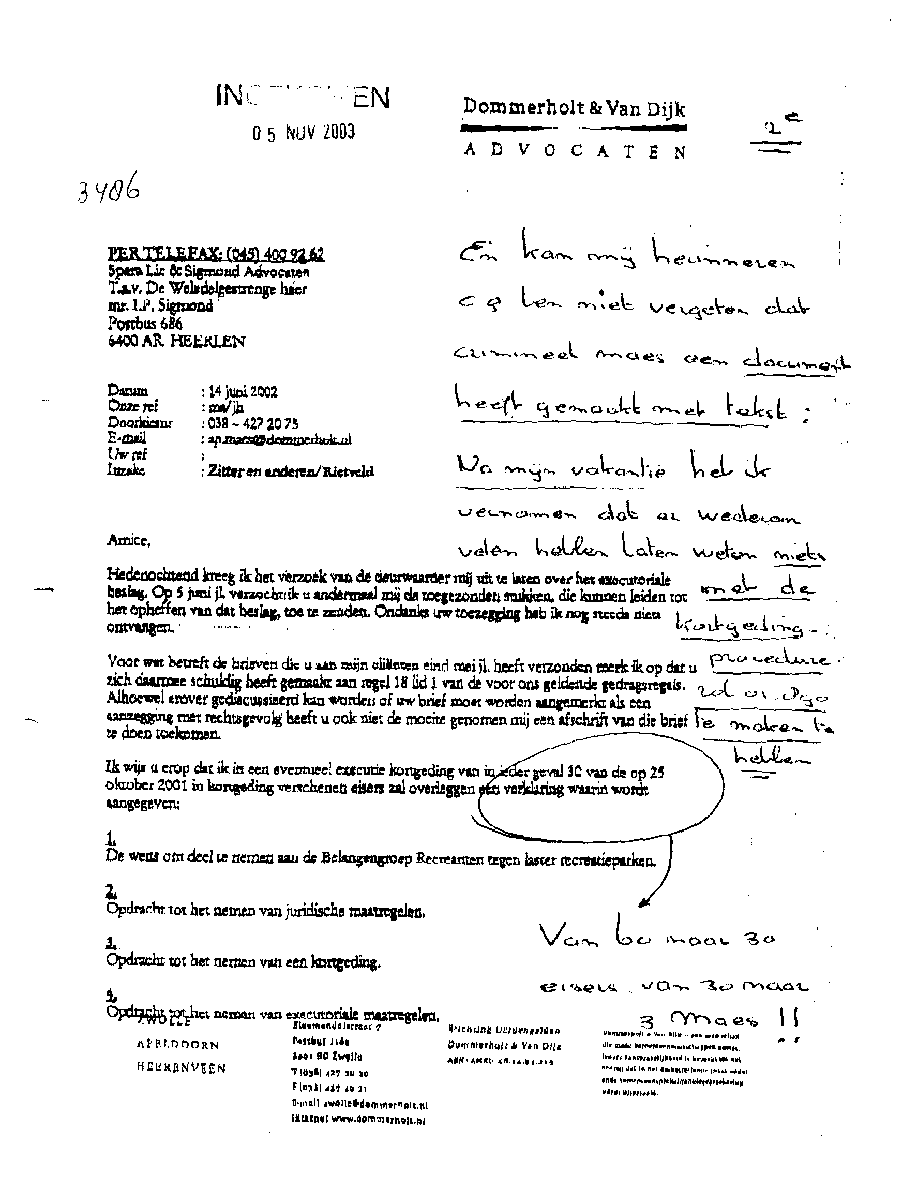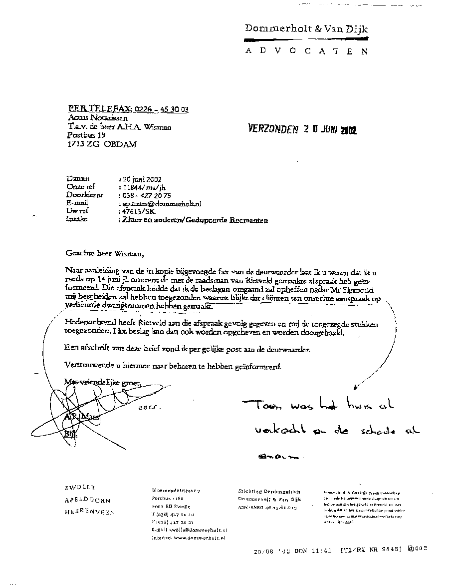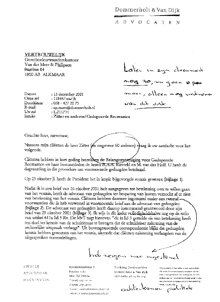 Bij deze laat ik u weten dat uw persoon is opgevoerd op een lijst van schade-eisers door Mr. A.P. Maes van Dommerholt van Dijk Advocaten te Zwolle. Dit ten behoeve van een door vijf samengevoegde Maatschappen van advocaten gevoerde kortgeding-procedure in bovenstaande rol. Bij dit kortgeding was slechts één persoon aanwezig als eiser. Achteraf gezien is dat verklaarbaar. Een groot deel van de bij de rechtbank in de procedure ingebrachte lijst van eisers bleek bij het natrekken van de persoonsgegevens geen eiser te zijn, of wist men niet een eiser te zijn; en in weer een ander geval zelfs (al heel lang) overleden. Kort samengevat worden alle vermelde eisers in een door Mr. Maes opgestelde lijst allemaal door mij (ondergetekende) als schadeplichtig gezien. Dit wegens de aan mij en mijn gezin toegebrachte enorme schade, die veroorzaakt werd met uw schade-eis tegen mij als voorzitter van de Belangenvereniging Van Gedupeerde Recreanten. De schade beloopt vanaf het moment na de gewonnen bodemprocedure € 25.000 per eiser, en die groeit met het verstrijken van de tijd. Dit houdt in dat de schade voor uw rekening komt die door u werd veroorzaakt met uw schade-eis tegen mij en met onrechtmatige beslagen. Dit via uw advocaat Mr. A.P. Maes die uw persoon inbracht in de procedure als eiser. De schade die Mr. Maes moet vergoeden is niet meegerekend; die is enorm. Bij het vaststellen dat een persoon niet blijkt te (hebben) bestaan, dan wordt het totaalbedrag verdeeld over de overige eisers op de lijst die wel blijken te bestaan. Het schadebedrag bestaat uit 60 maal het bedrag zoals boven vermeld; ofwel totaal € 1,500.000 vanaf de peildatum. Verder zal ik alle overige kosten en schade die nog ontstaat op u verhalen.