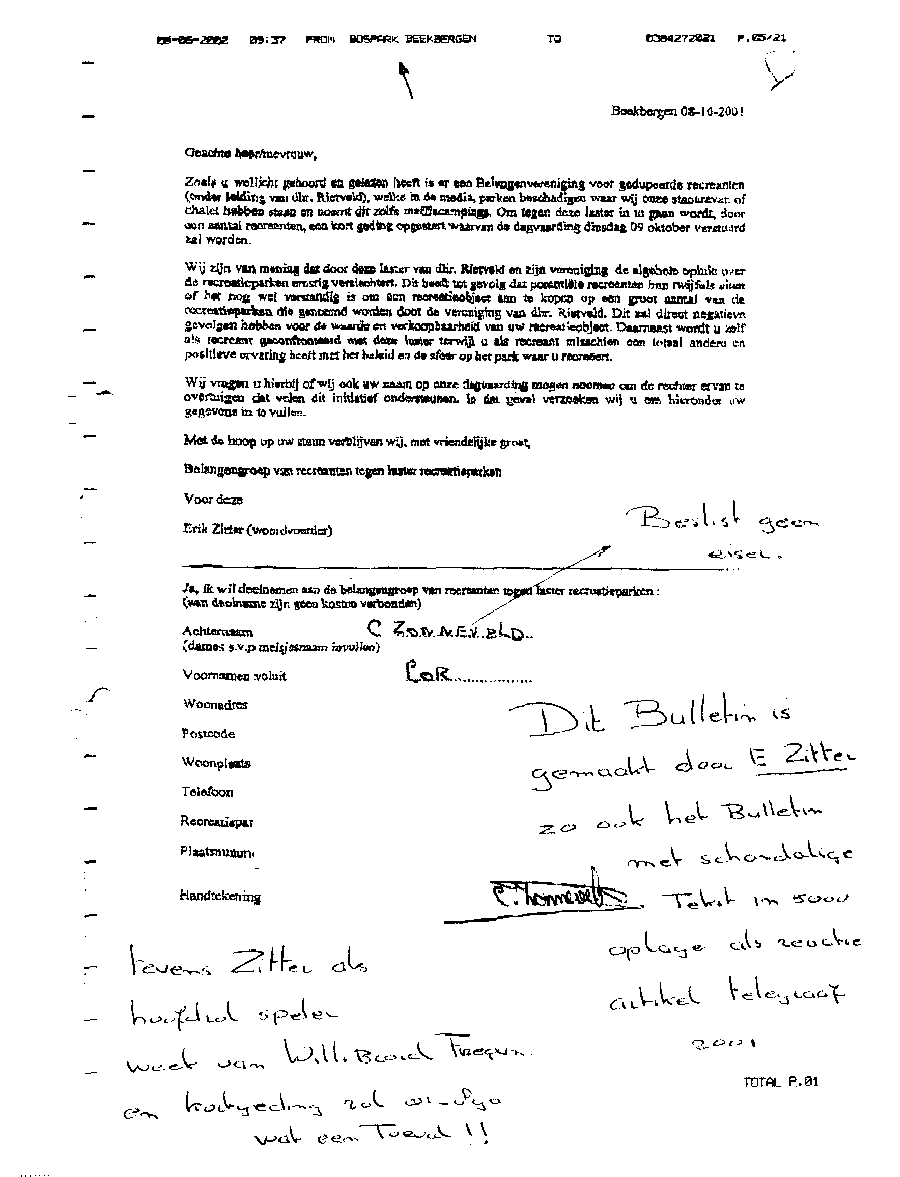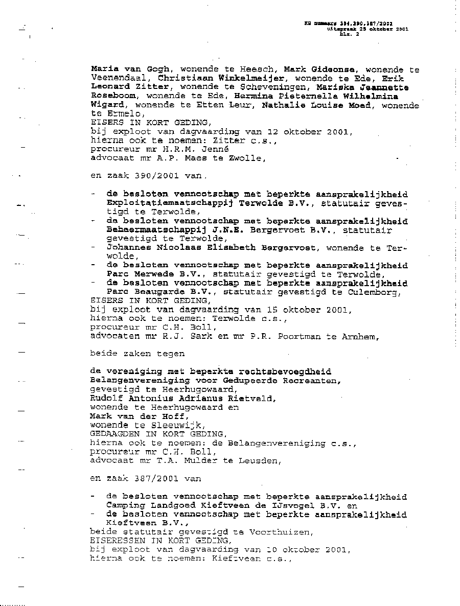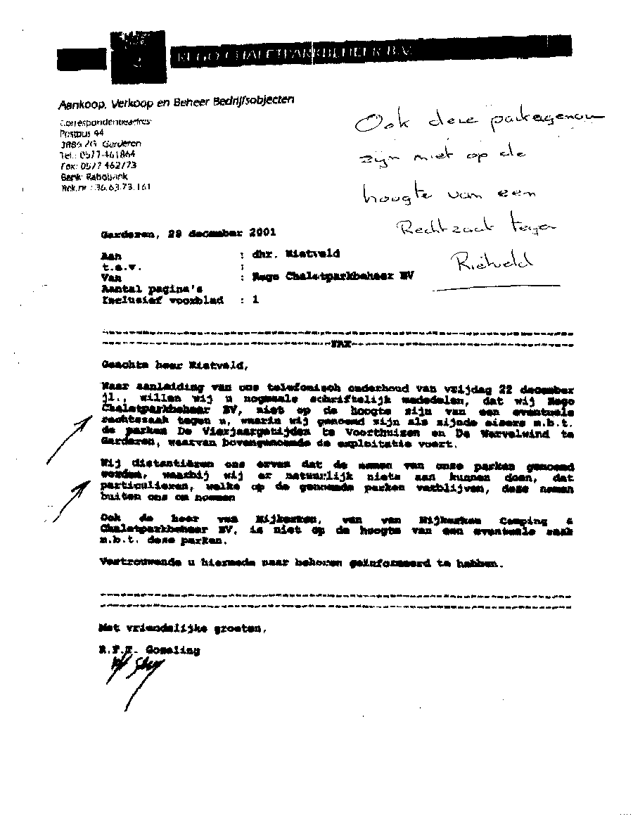 Bij deze laat ik u weten dat uw persoon is opgevoerd op een lijst van schade-eisers door Mr. A.P. Maes van Dommerholt van Dijk Advocaten te Zwolle. Dit ten behoeve van een door vijf samengevoegde Maatschappen van advocaten gevoerde kortgeding-procedure in bovenstaande rol. Bij dit kortgeding was slechts één persoon aanwezig als eiser. Achteraf gezien is dat verklaarbaar. Een groot deel van de bij de rechtbank in de procedure ingebrachte lijst van eisers bleek bij het natrekken van de persoonsgegevens geen eiser te zijn, of wist men niet een eiser te zijn; en in weer een ander geval zelfs (al heel lang) overleden. Kort samengevat worden alle vermelde eisers in een door Mr. Maes opgestelde lijst allemaal door mij (ondergetekende) als schadeplichtig gezien. Dit wegens de aan mij en mijn gezin toegebrachte enorme schade, die veroorzaakt werd met uw schade-eis tegen mij als voorzitter van de Belangenvereniging Van Gedupeerde Recreanten. De schade beloopt vanaf het moment na de gewonnen bodemprocedure € 25.000 per eiser, en die groeit met het verstrijken van de tijd. Dit houdt in dat de schade voor uw rekening komt die door u werd veroorzaakt met uw schade-eis tegen mij en met onrechtmatige beslagen. Dit via uw advocaat Mr. A.P. Maes die uw persoon inbracht in de procedure als eiser. De schade die Mr. Maes moet vergoeden is niet meegerekend; die is enorm. Bij het vaststellen dat een persoon niet blijkt te (hebben) bestaan, dan wordt het totaalbedrag verdeeld over de overige eisers op de lijst die wel blijken te bestaan. Het schadebedrag bestaat uit 60 maal het bedrag zoals boven vermeld; ofwel totaal € 1,500.000 vanaf de peildatum. Verder zal ik alle overige kosten en schade die nog ontstaat op u verhalen.