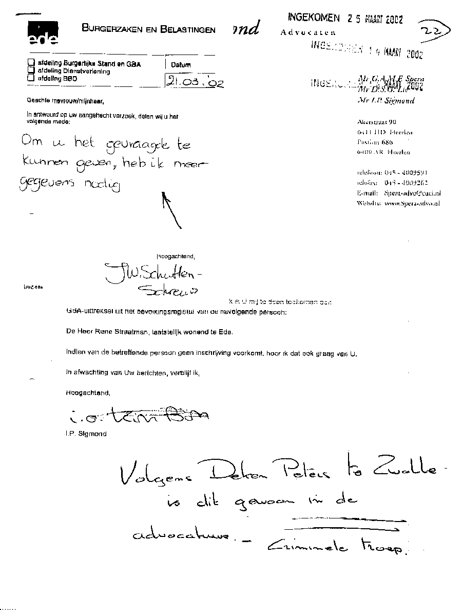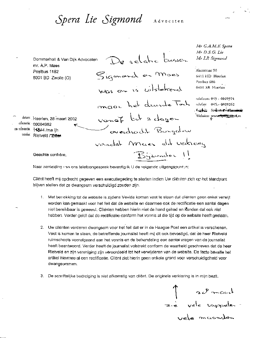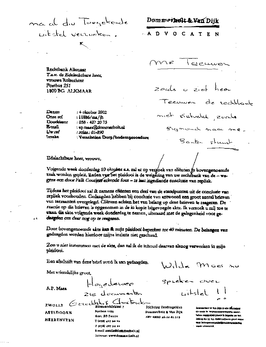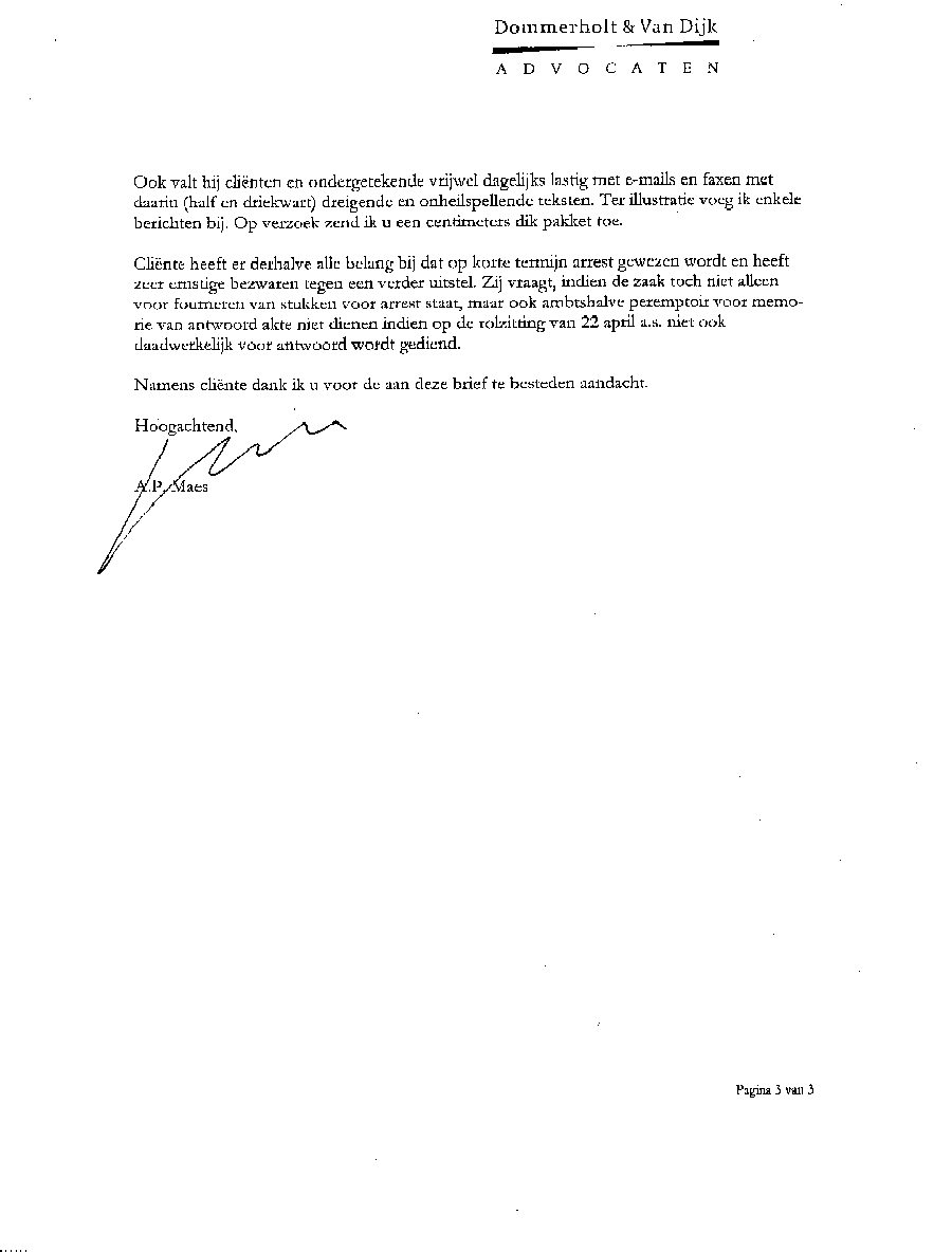 Castricum, 24 april 2004 AAN: de Presidenten van de Rechtbank in Alkmaar en het Gerechtshof te AmsterdamMr. L.J.L. Koster en Mr. N.A.M. Schipper L.s., Bij deze laat ik u opnieuw weten dat bij de Rechtbank Alkmaar bewust mijn zaken zijn gefrustreerd en u die welbewust heeft laten verzieken; op een na en dat is de bodemprocedure. Die volgde op het kortgeding op rol 01-890 die was opgezet door de criminele advocaat Mr. A.P. Maes van Dommerholt van Dijk Advocaten. Maar ook door een volslagen idioot programma "De Week van Willibrord" dat volledig werd aangestuurd vanuit het hoofdkantoor van de BV. Verder heeft meester Maes alle gedragsregels aan zijn laars gelapt, o.a. door schijneisers op te voeren zoals in deze pagina is aangegeven. Er is smerige achterkamertjespolitiek bedreven, zoals op vele documenten die Maes lanceerde is terug te vinden; o.a. de onrechtmatige beslagen met een rijke fantasie, plus talloze leugens tot aan de notaris aan toe. De pot verwijt nu de ketel dat hij zwart ziet. Maar er gaat geen letter en document van mijn website af. Nu niet en nooit niet. [zie de uitspraak tegen zwendeladvocaat Sark en de e-mails over de Frequin-uitzending en de betaalde Joustra uit Assen. Maar ook de heer van Veen en E. Zitter die diverse rollen heeft gespeeld. En dan Mw. Mesman die met documenten en het politiedossier in ieder geval heeft getracht de bewust opgezette puinhoop naar buiten te brengen]. Alleen zij - Mesman - zit nog in een strafzaak en de drie grootste boeven lopen nog steeds vrij rond. Onvoorstelbaar, maar verliezen zal je Bergervoet; je beerput is te groot. Die paar centimeter papier die door Maes zijn aangereikt vallen in het niet bij de tientallen meters op elkaar gestapelde puinhoop uit jouw toko. Verder wil ik aan het Gerechtshof de mededeling doen de tekst goed te lezen die zwendeladvocaat Maes nu weer naar o.a. het Gerechtshof Amsterdam heeft gestuurd. Dit omdat hij wederom en in successie zal proberen de zaken onderuit te halen door procedures te forceren op het punt van het zich stellen van een procureur op een datum. Juist Maes met zijn geldverslindend kapot procederen verziekt de rechtsgang, niets meer niets minder. Hoelang blijven de rechtbanken deze ongecontroleerde machtsuitoefening van advocaten ten koste van rechtzoekende burgers gedogen? Waarom sluit men de ogen voor collusie en belangenverstrengeling, zowel bij de Zittende Magistratuur, bij het Openbaar Ministerie, bij het Ministerie van Justitie en vooral in de politiek ?? Ons land gaat kapot aan incompetentie en lafheid. Het gefoezel met collega's is nog de enige manier van meester zwendeladcocaat A.P. Maes met zijn toegang tot de balie en lidmaatschap van de Raad van Toezicht (waarop ??) om zijn gecreëerde puinhoop uit het zicht te houden; wat hem niet meer zal lukken, want ik zit er nu dag en nacht bovenop. Zie de slijmerige poging van de ook aan uw balie toegelaten zwendeladvocaat Mr. A.P. Maes