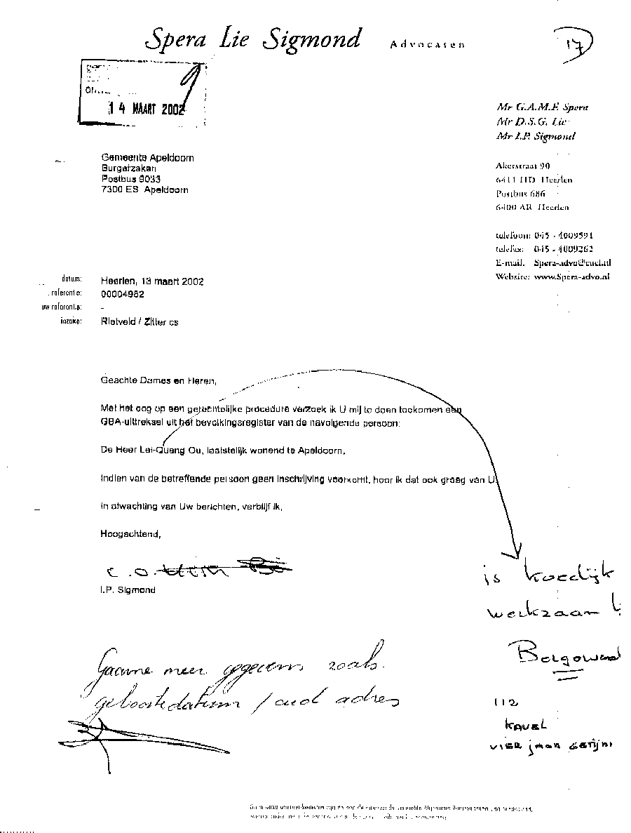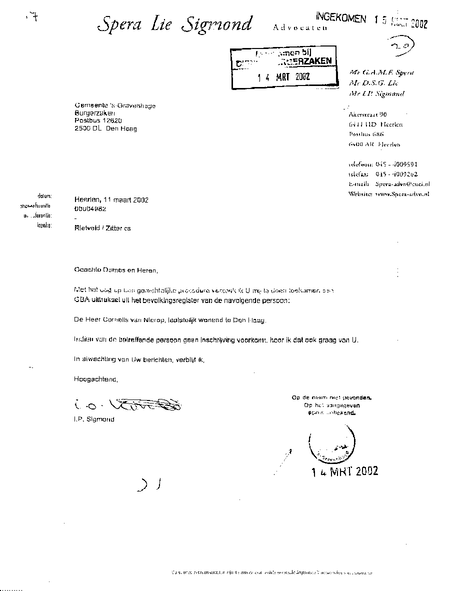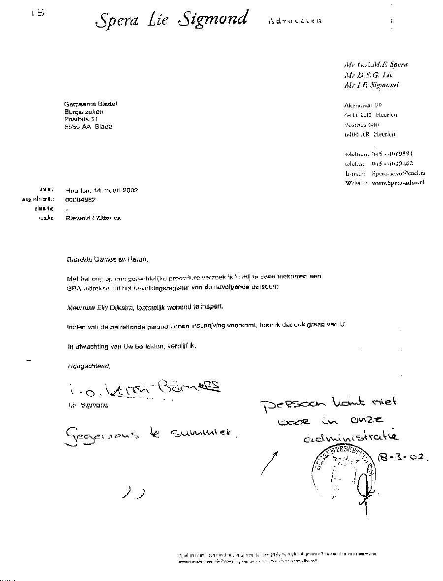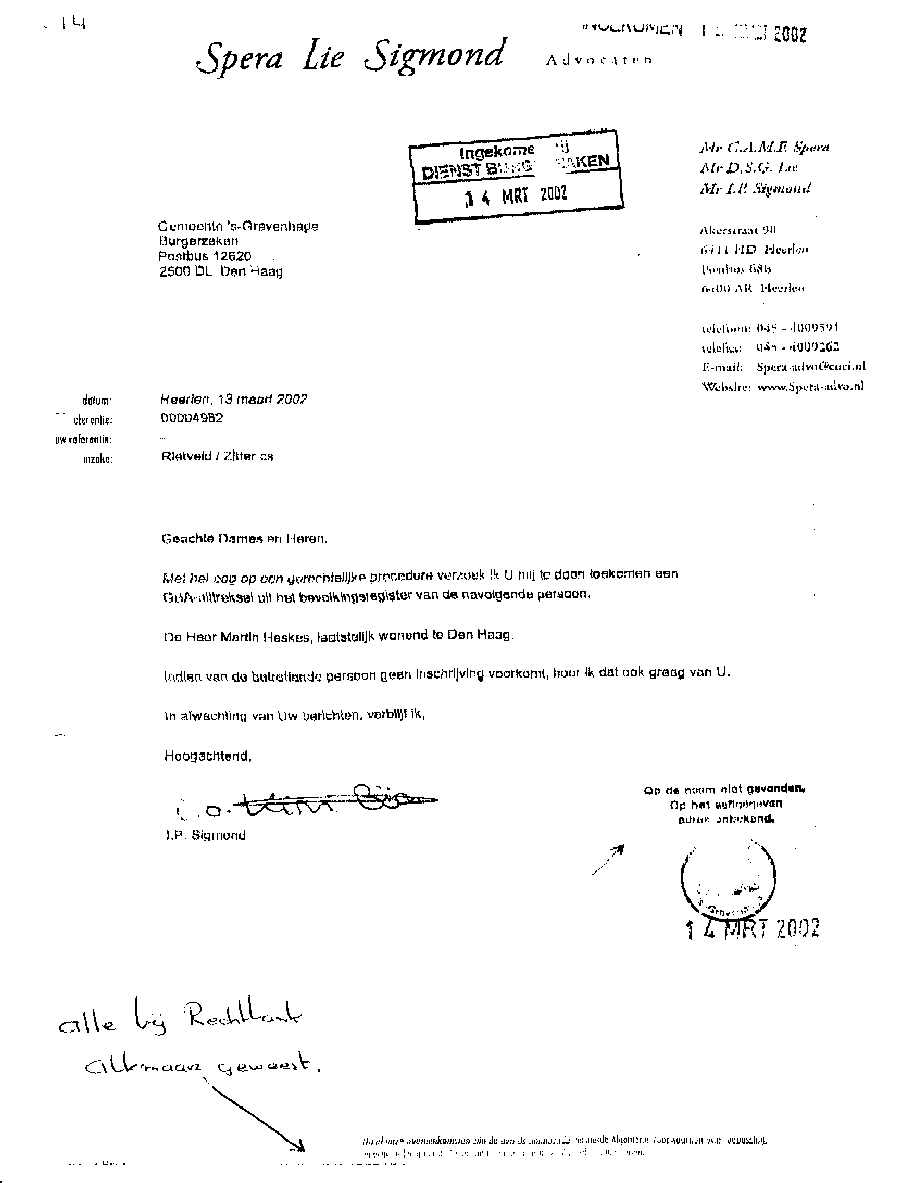 Castricum, 24 april 2004 AAN: de Presidenten van de Rechtbank in Alkmaar en het Gerechtshof te AmsterdamMr. L.J.L. Koster en Mr. N.A.M. Schipper L.s., Bij deze laat ik u opnieuw weten dat bij de Rechtbank Alkmaar bewust mijn zaken zijn gefrustreerd en u die welbewust heeft laten verzieken; op een na en dat is de bodemprocedure. Die volgde op het kortgeding op rol 01-890 die was opgezet door de criminele advocaat Mr. A.P. Maes van Dommerholt van Dijk Advocaten. Maar ook door een volslagen idioot programma "De Week van Willibrord" dat volledig werd aangestuurd vanuit het hoofdkantoor van de BV. Verder heeft meester Maes alle gedragsregels aan zijn laars gelapt, o.a. door schijneisers op te voeren zoals in deze pagina is aangegeven. Er is smerige achterkamertjespolitiek bedreven, zoals op vele documenten die Maes lanceerde is terug te vinden; o.a. de onrechtmatige beslagen met een rijke fantasie, plus talloze leugens tot aan de notaris aan toe. De pot verwijt nu de ketel dat hij zwart ziet. Maar er gaat geen letter en document van mijn website af. Nu niet en nooit niet. [zie de uitspraak tegen zwendeladvocaat Sark en de e-mails over de Frequin-uitzending en de betaalde Joustra uit Assen. Maar ook de heer van Veen en E. Zitter die diverse rollen heeft gespeeld. En dan Mw. Mesman die met documenten en het politiedossier in ieder geval heeft getracht de bewust opgezette puinhoop naar buiten te brengen]. Alleen zij - Mesman - zit nog in een strafzaak en de drie grootste boeven lopen nog steeds vrij rond. Onvoorstelbaar, maar verliezen zal je Bergervoet; je beerput is te groot. Die paar centimeter papier die door Maes zijn aangereikt vallen in het niet bij de tientallen meters op elkaar gestapelde puinhoop uit jouw toko. Verder wil ik aan het Gerechtshof de mededeling doen de tekst goed te lezen die zwendeladvocaat Maes nu weer naar o.a. het Gerechtshof Amsterdam heeft gestuurd. Dit omdat hij wederom en in successie zal proberen de zaken onderuit te halen door procedures te forceren op het punt van het zich stellen van een procureur op een datum. Juist Maes met zijn geldverslindend kapot procederen verziekt de rechtsgang, niets meer niets minder. Hoelang blijven de rechtbanken deze ongecontroleerde machtsuitoefening van advocaten ten koste van rechtzoekende burgers gedogen? Waarom sluit men de ogen voor collusie en belangenverstrengeling, zowel bij de Zittende Magistratuur, bij het Openbaar Ministerie, bij het Ministerie van Justitie en vooral in de politiek ?? Ons land gaat kapot aan incompetentie en lafheid. Het gefoezel met collega's is nog de enige manier van meester zwendeladcocaat A.P. Maes met zijn toegang tot de balie en lidmaatschap van de Raad van Toezicht (waarop ??) om zijn gecreëerde puinhoop uit het zicht te houden; wat hem niet meer zal lukken, want ik zit er nu dag en nacht bovenop. Zie de slijmerige poging van de ook aan uw balie toegelaten zwendeladvocaat Mr. A.P. Maes