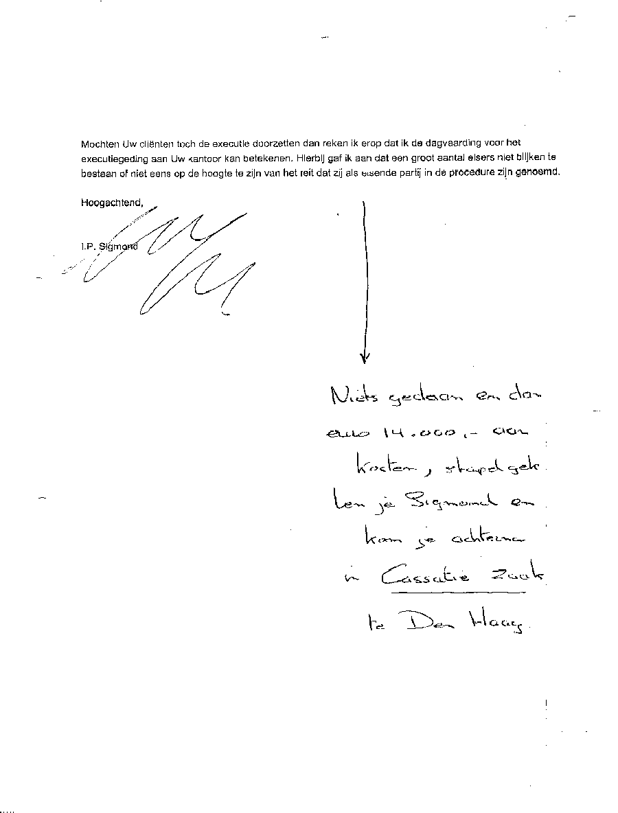 Verwijt aan mr. Sigmond over z'n inactiviteit. Wel betalen, maar niet kunnen halen!