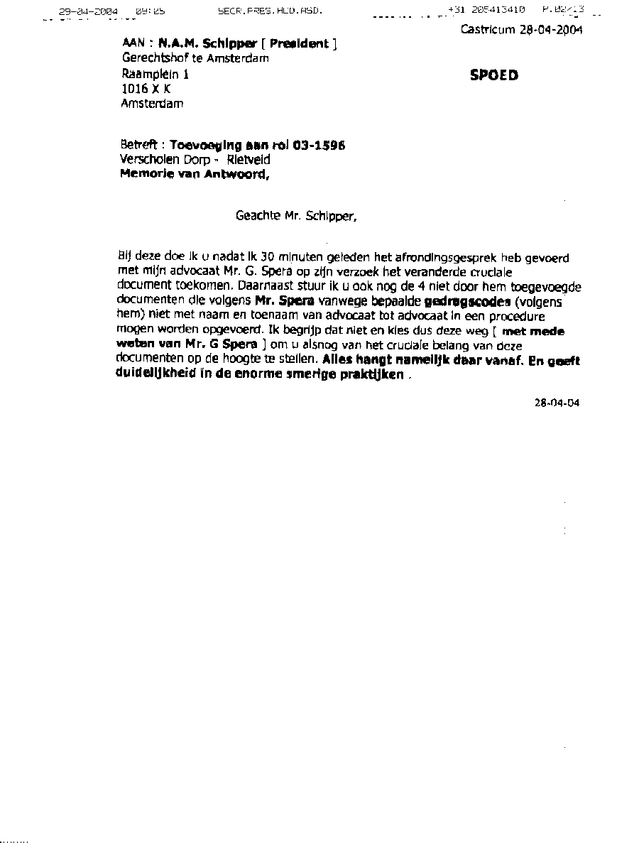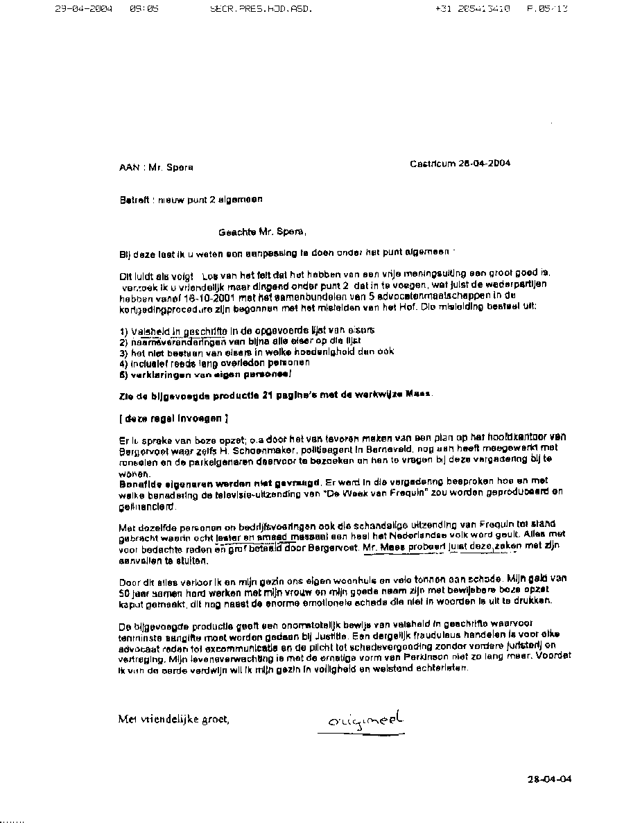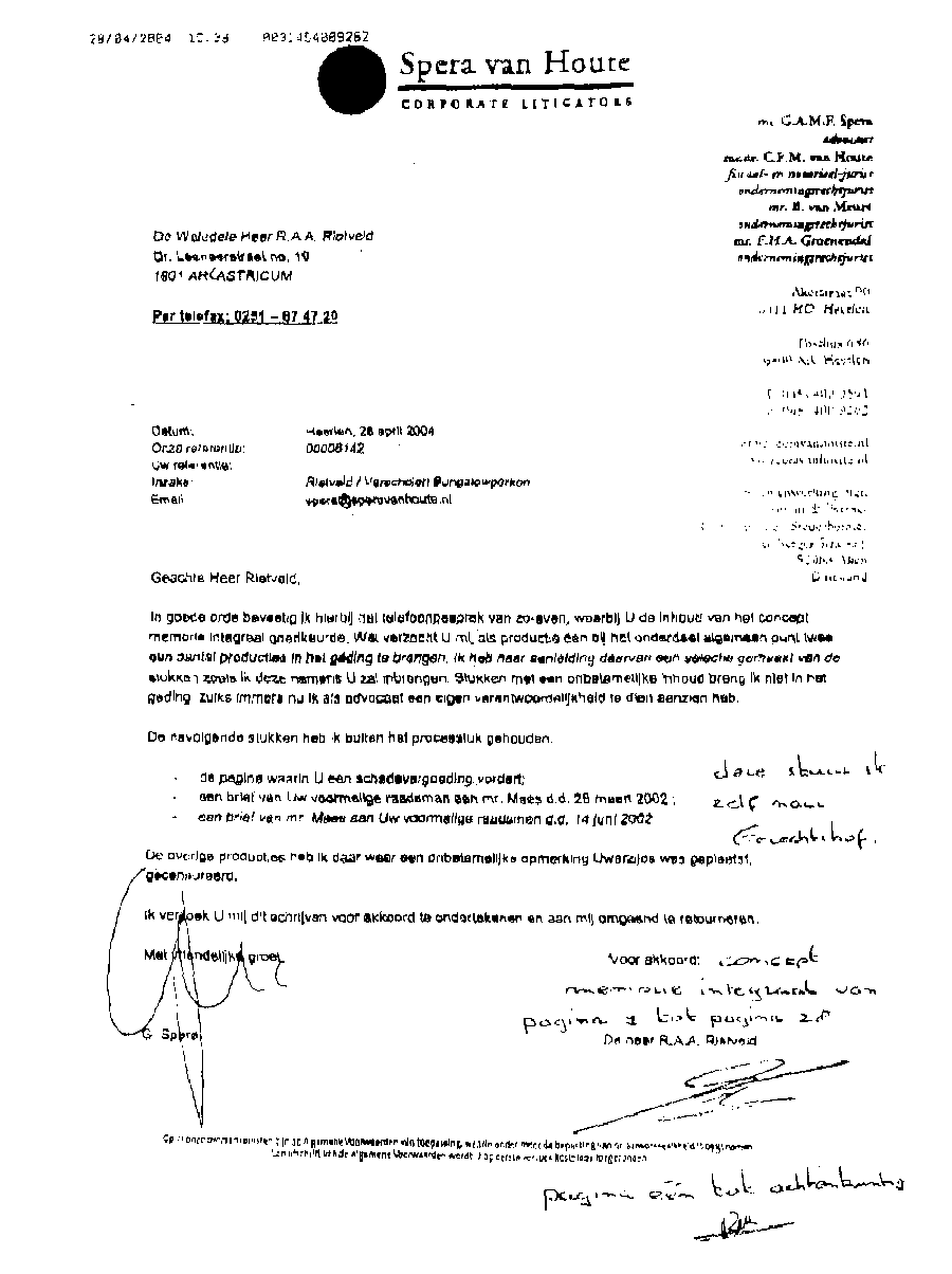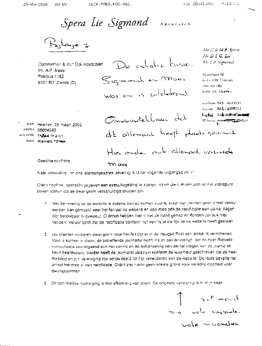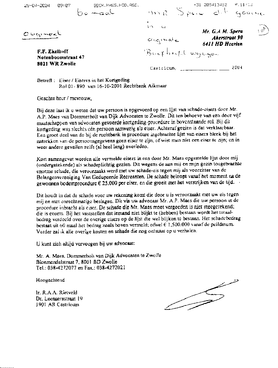 Faxbericht aan mr. Maes van Kees Griesdoorn over schijneisers