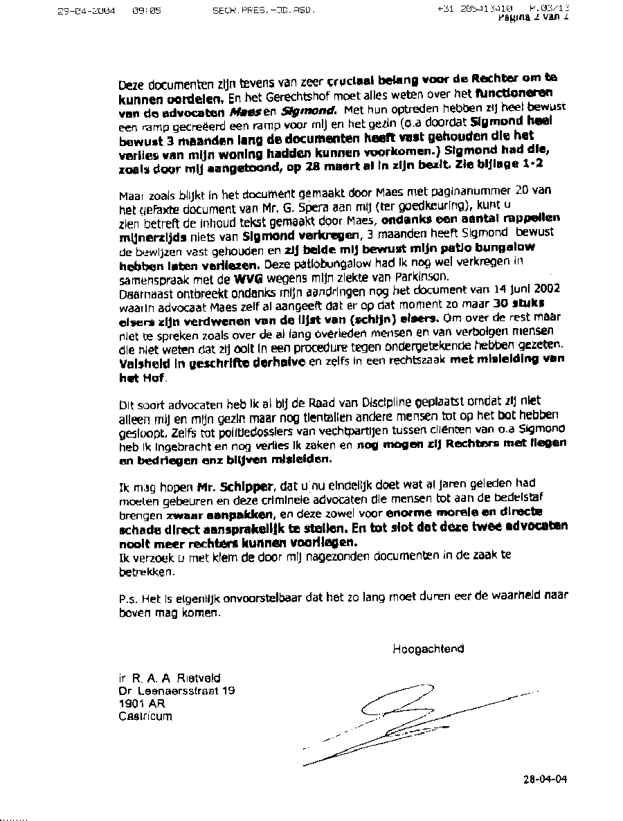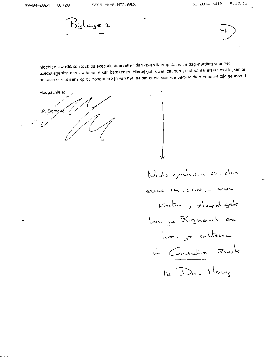 Verwijt aan mr. Sigmond over z'n inactiviteit. Wel betalen, maar niet kunnen halen!