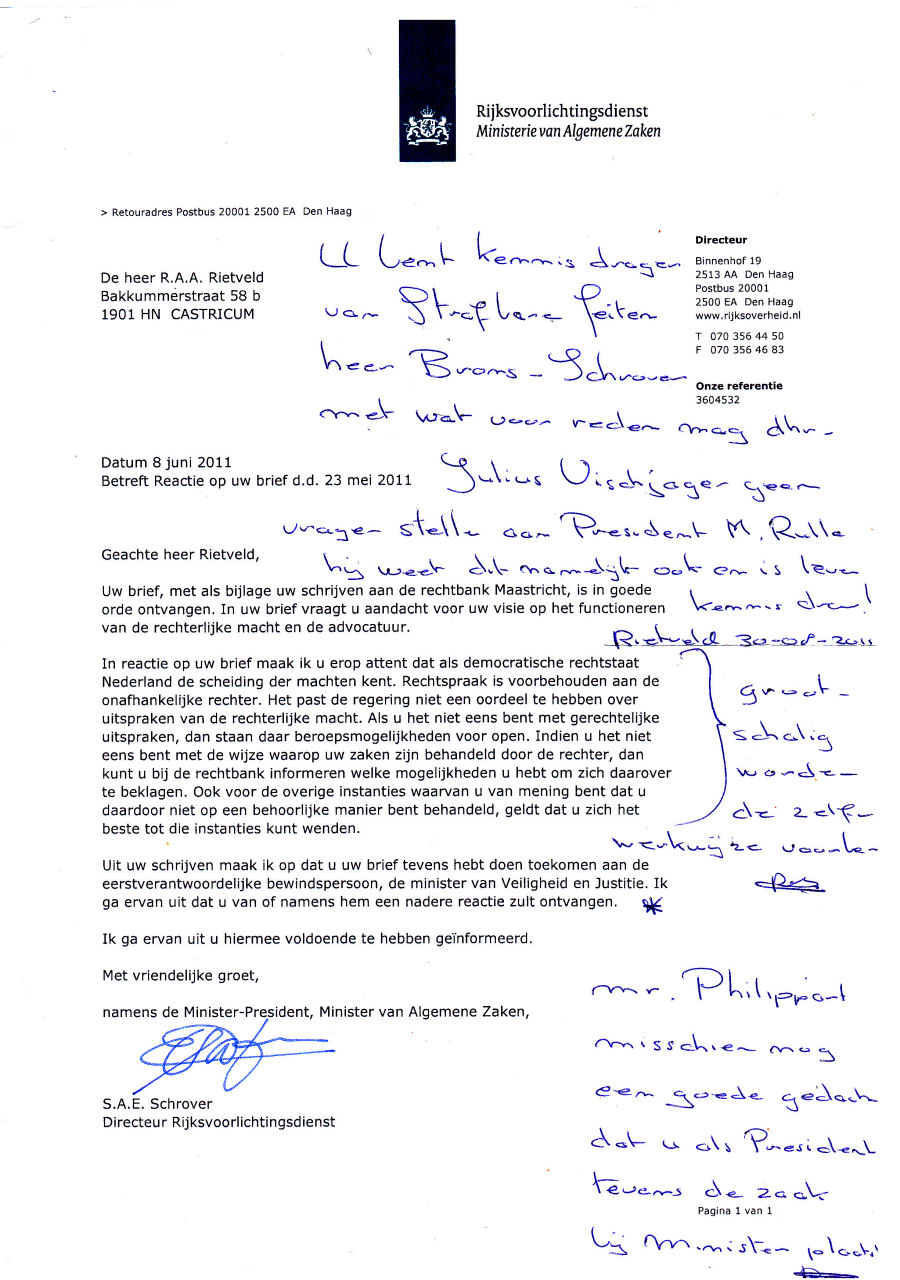 Directeur mr. Brons, mr. Schrover, Minister-president M. Rutte (in handen) Inzake: Laatste poging een catastrofe te voorkomen! (spoedeisend) Zeer Geachte Heren, Bij deze doe ik u een aangiften toekomen die is verwerkt in een verklaring die geen enkele onduidelijkheid laat bestaan over hoe de zaak Rietveld (het bijna vermoorden etc.) en zijn gehele gezin, door diegenen die staan vermeld in de bijlage die door ondergetekende bijgevoegd zijn en in de juiste positie kunnen worden gebracht. Opnieuw wordt deze opeenstapeling van misdaad op grote schaal op mijn persoon toegepast, en wel over 12 jaar (een nachtmerrie ), die wederom in richting van de prullenbak is verwezen. u bent allen kennisdrager en tevens verantwoordelijk voor de treinen die nu al onder stoom staan om te gaan rijden! Met vriendelijke groet