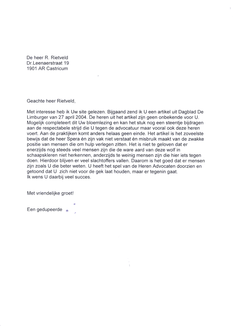- Vaststaat dat advocaat mr. A.P. Maes met het opvoeren van valse en overleden eisers op het hoogste niveau gefraudeerd heeft en valsheid in geschrifte en in rechtsprocedure heeft gepleegd. Tot op de dag van vandaag heeft de advocatuur zich heftig verzet tegen het naar voren brengen van deze meest grove vorm van fraude en m.b.t. tot de boze opzet die ontegenzeglijk ten grondslag ligt aan de aanklachten tegen Rietveld en de Belangenvereniging van Gedupeerde Recreanten. Als bewijs daarvoor stelt Rietveld aan de rechtbank een cd-rom ter beschikking waarin de documenten en bewijzen samen met de video’s en de tv-uitzending met de lasterlijk uitzending van SBS-6 in ‘De Week van Willibrord’ ter beschikking staan.